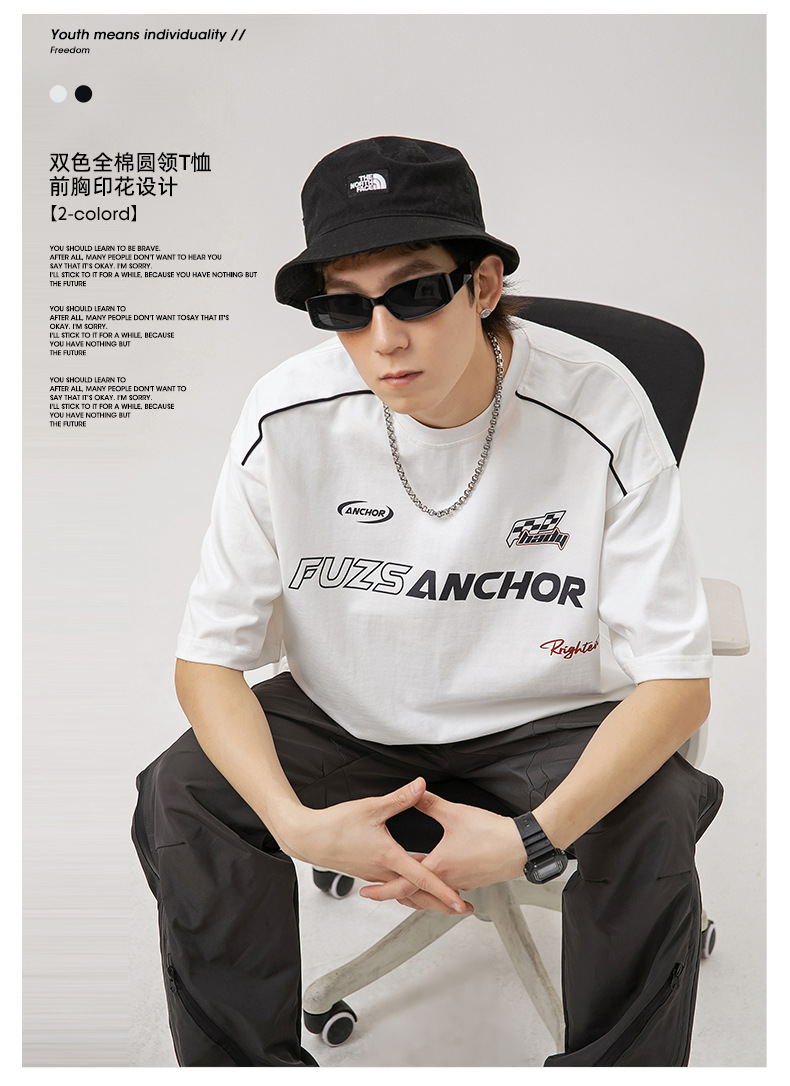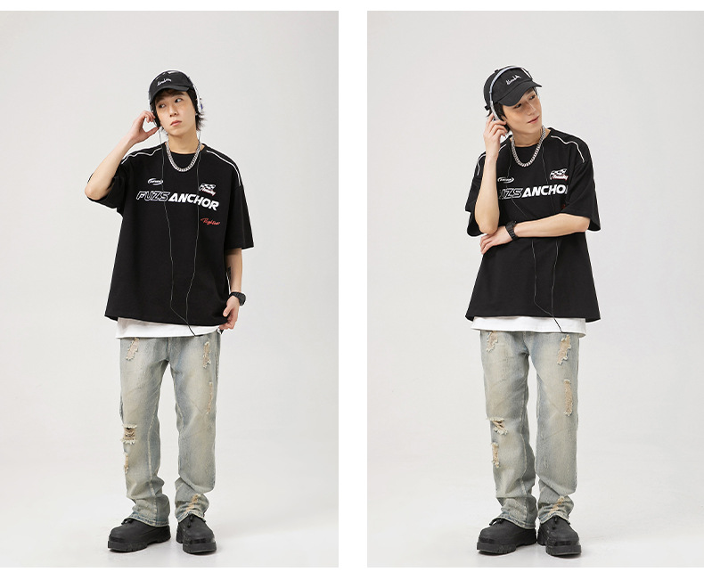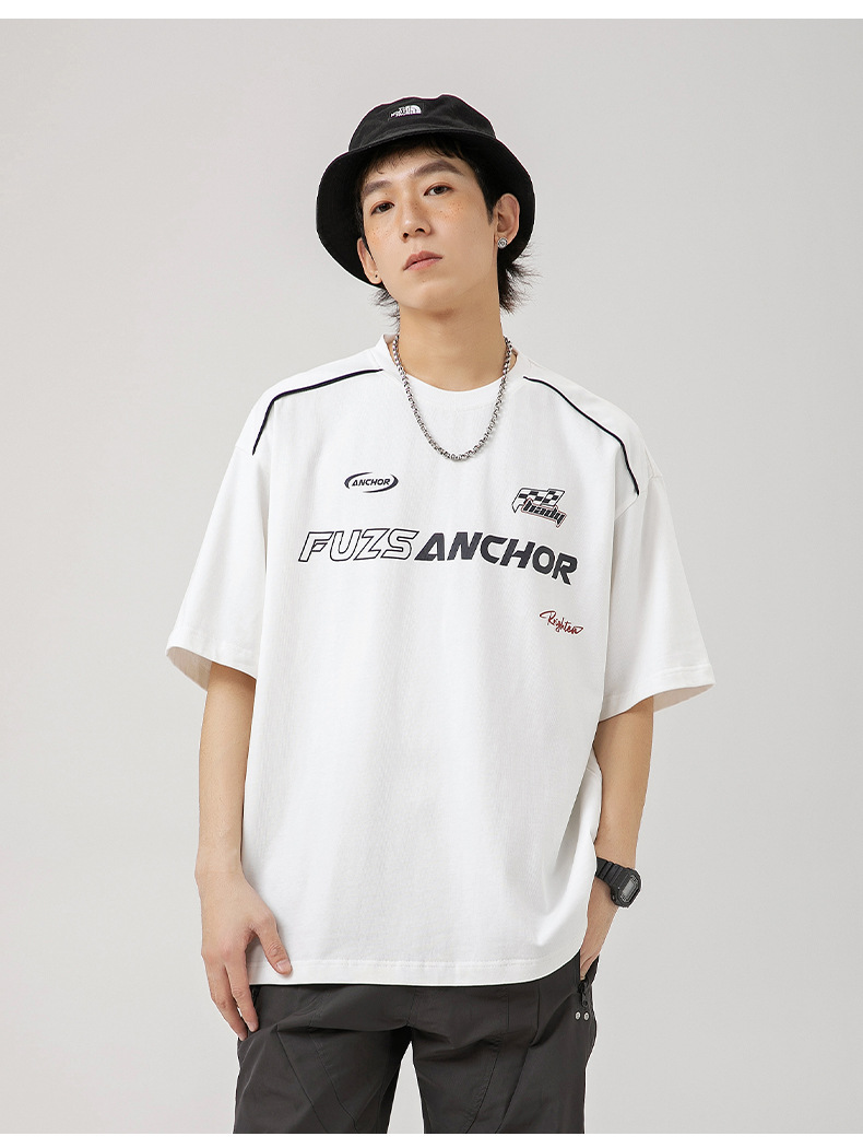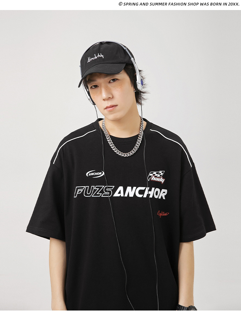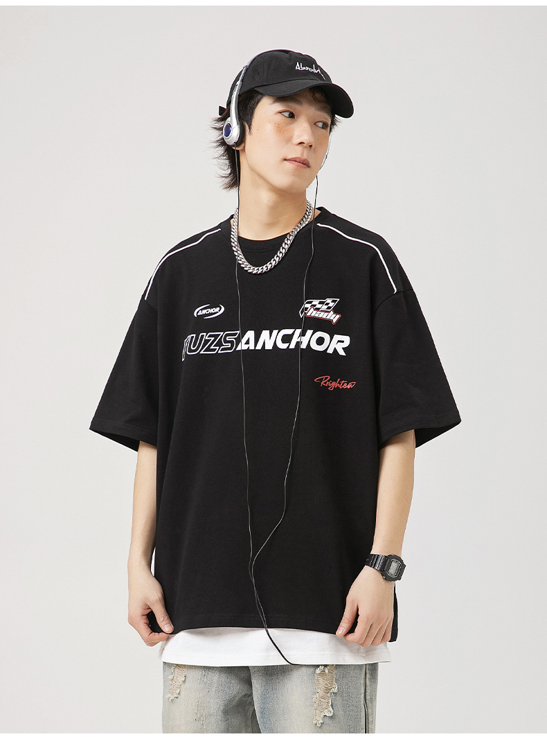 「黑白两色」韩路日系男装 潮牌高街短袖t恤男 夏新款美式复古宽松赛车元素体恤上衣