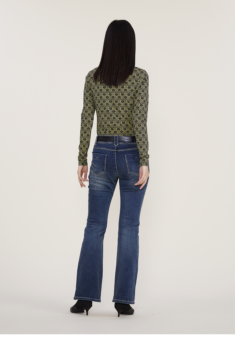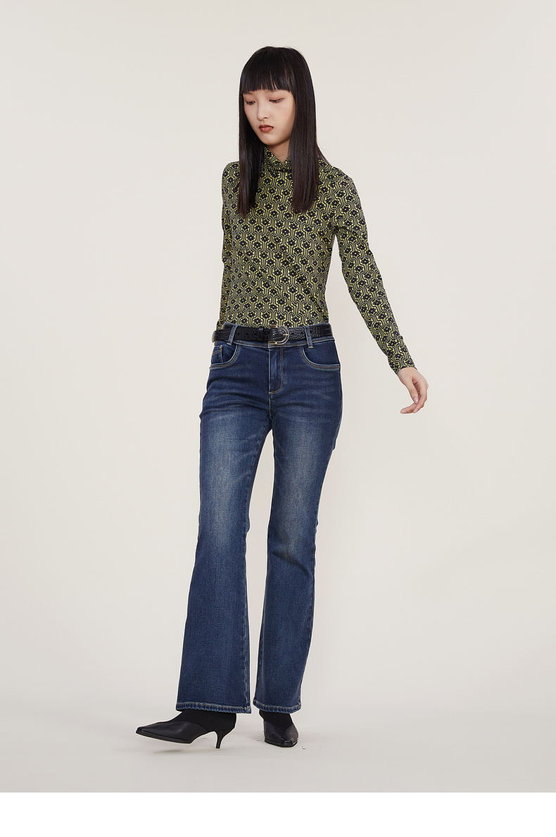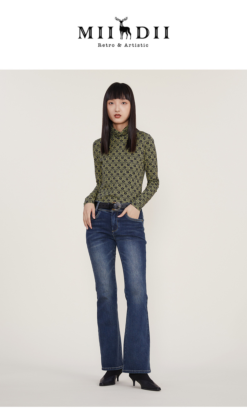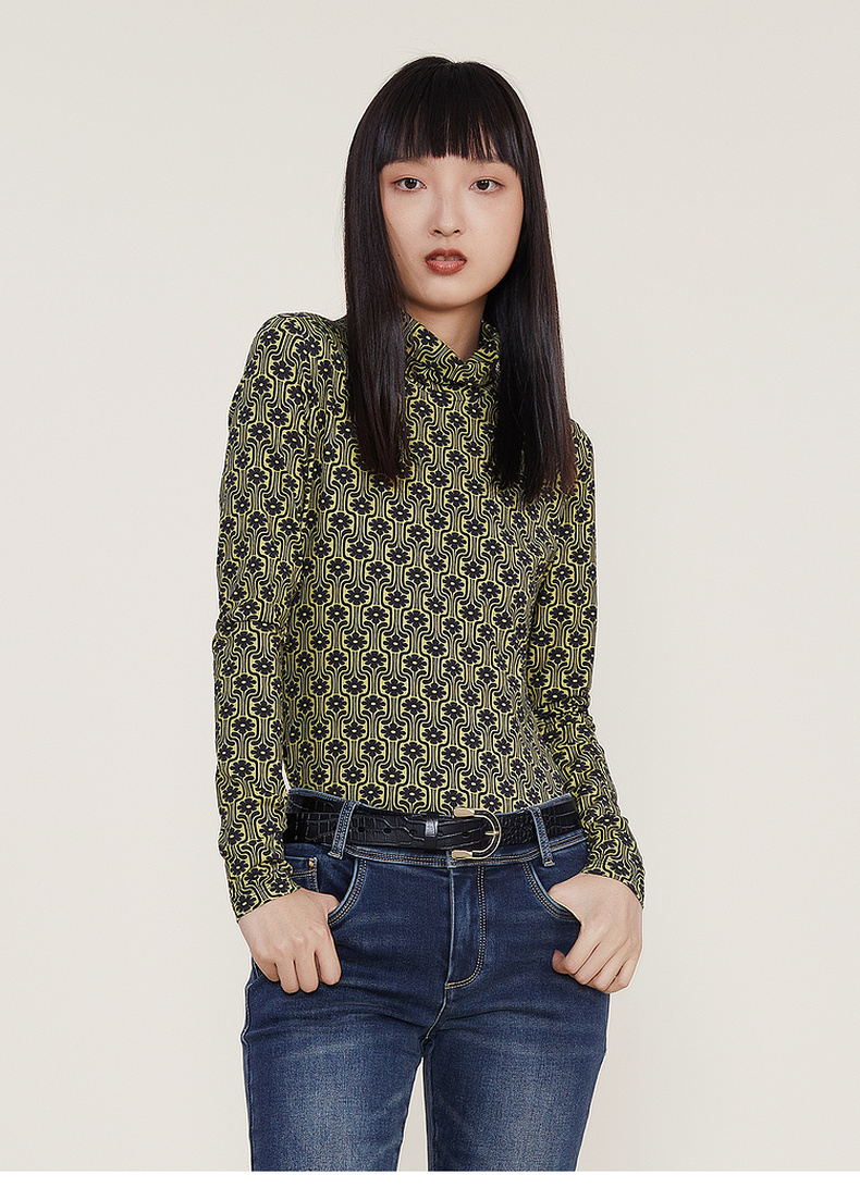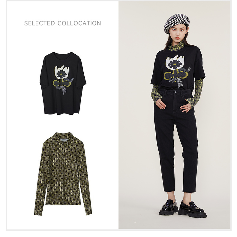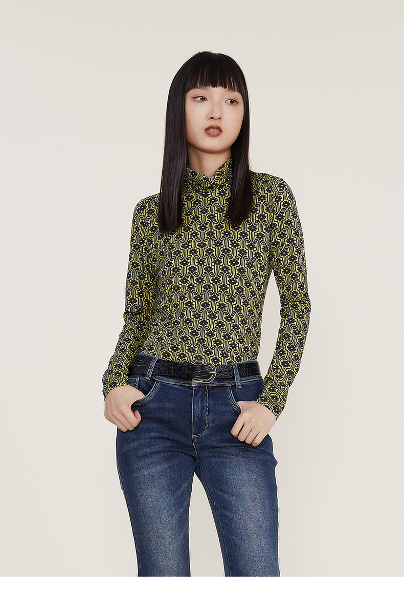 谜底2022冬季新款复古印花高领T恤女紧身打底上衣长袖224MT1664