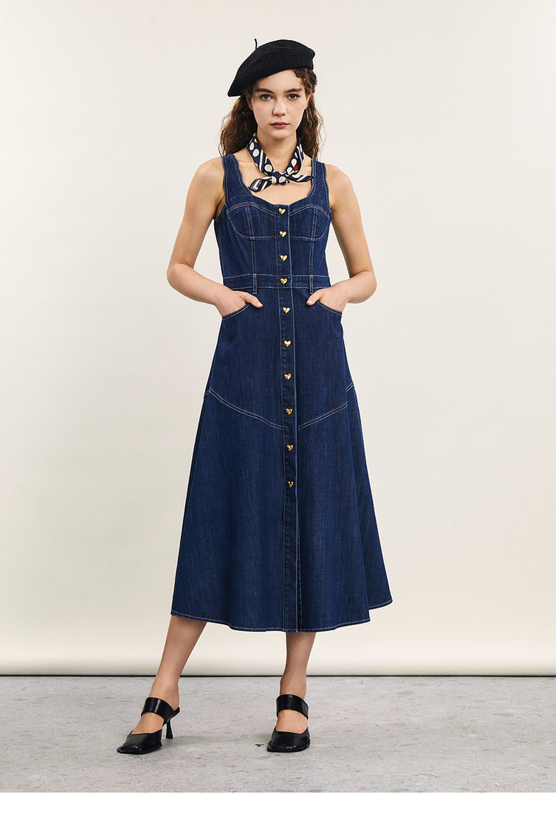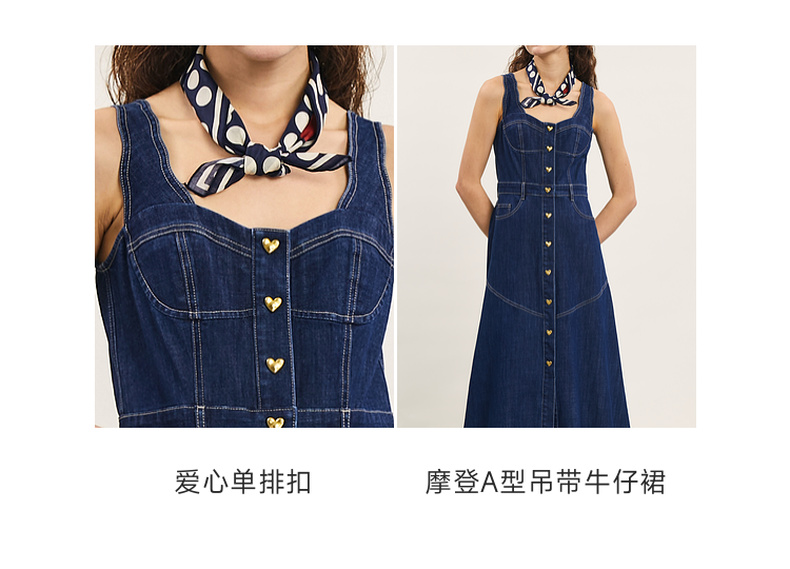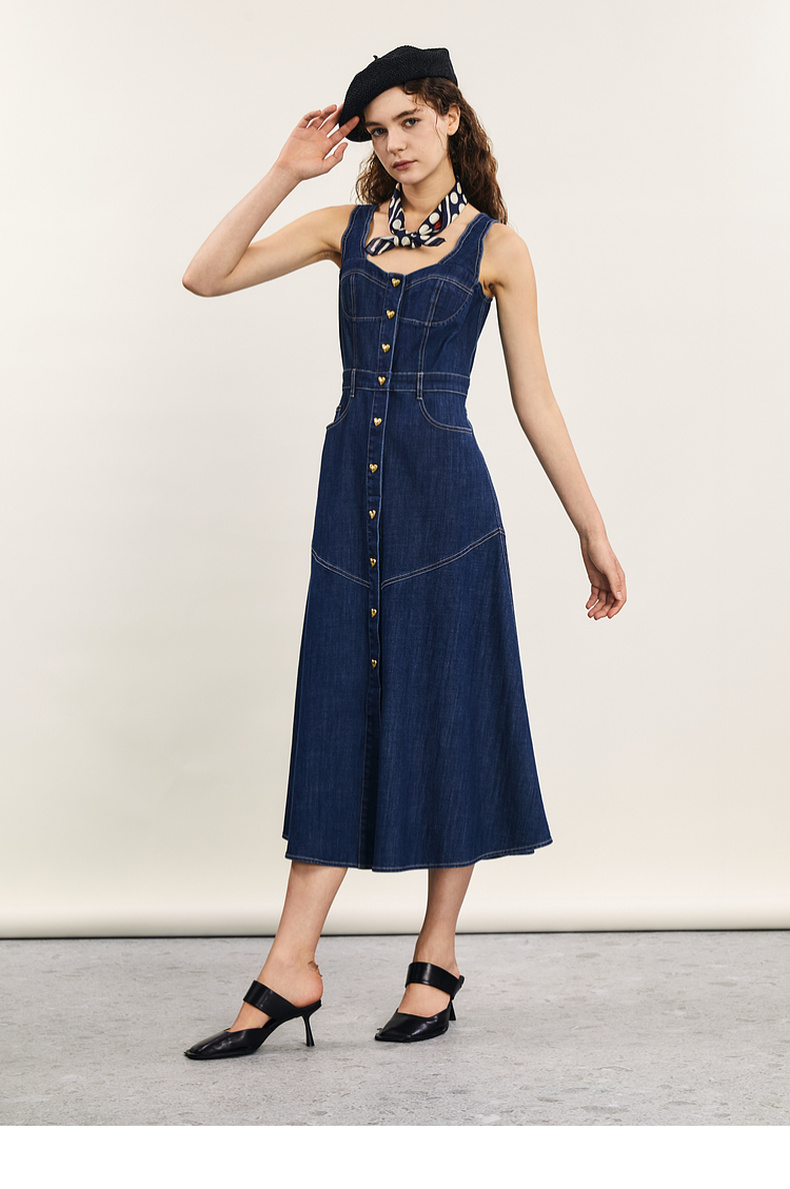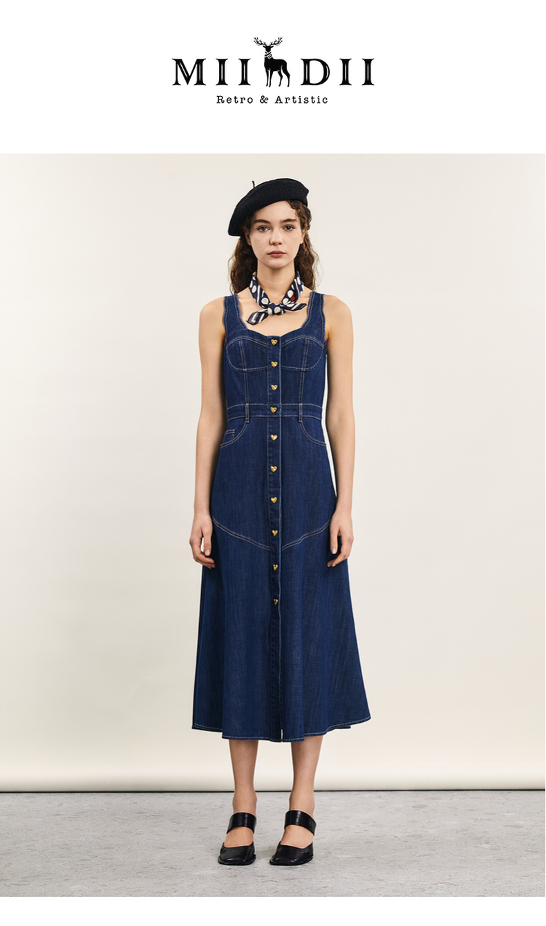 谜底牛仔吊带连衣裙2024年夏季新品复古风修身中长裙子242ML0515