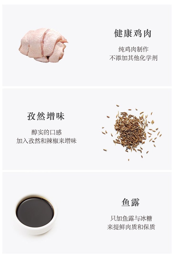 🥩纯鸡肉制作,不添加其他化学剂 只加鱼露和冰糖来提鲜肉质 孜然和辣椒来增味