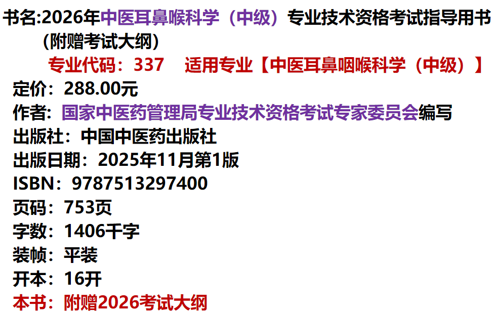 2026年中医耳鼻喉科学(中级)专业技术资格考试指导用书 专业代码337 国家中医药管理局专业技术资格考试专家委员会 中医药出版社