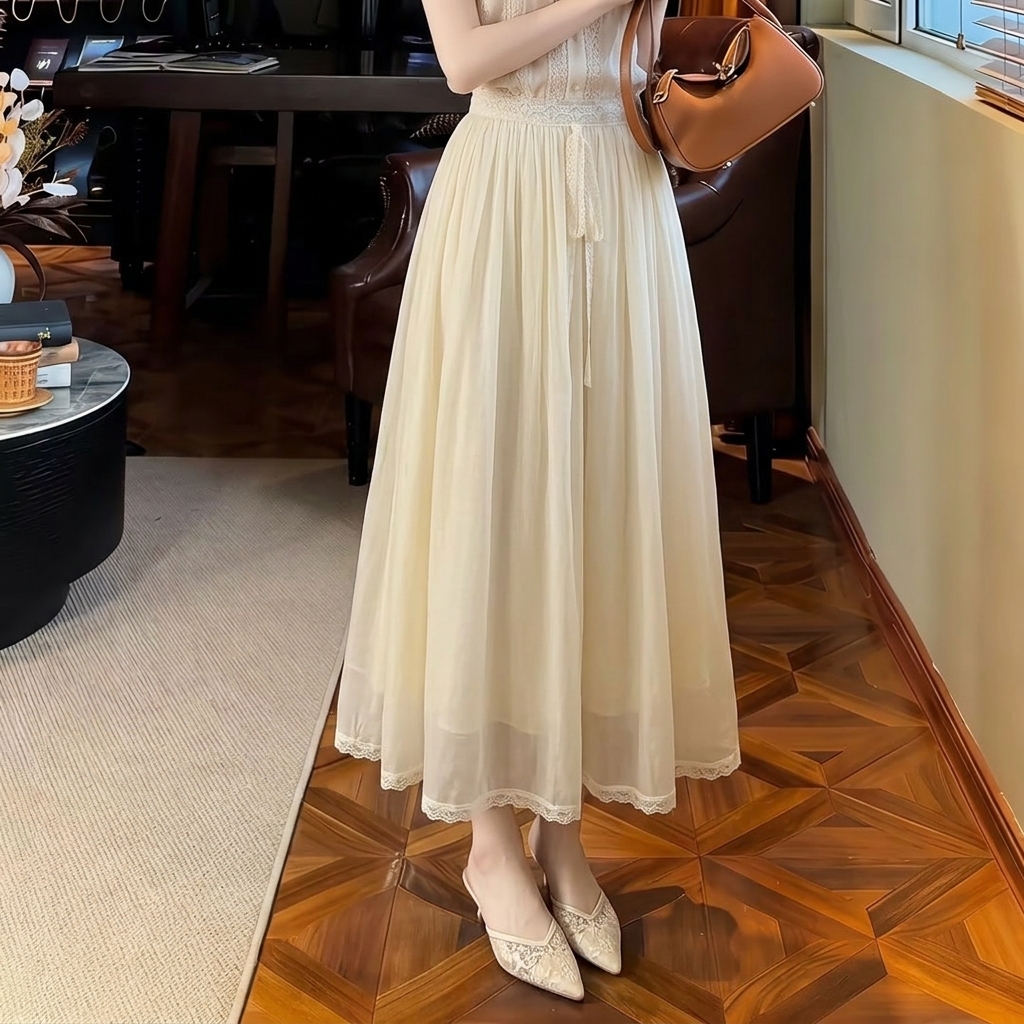 邂逅优雅~赫本风100%桑蚕丝高腰网纱半身裙女蕾丝A字长裙