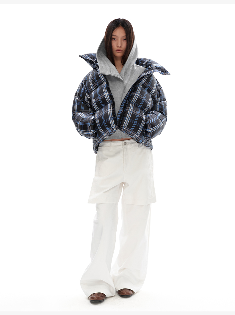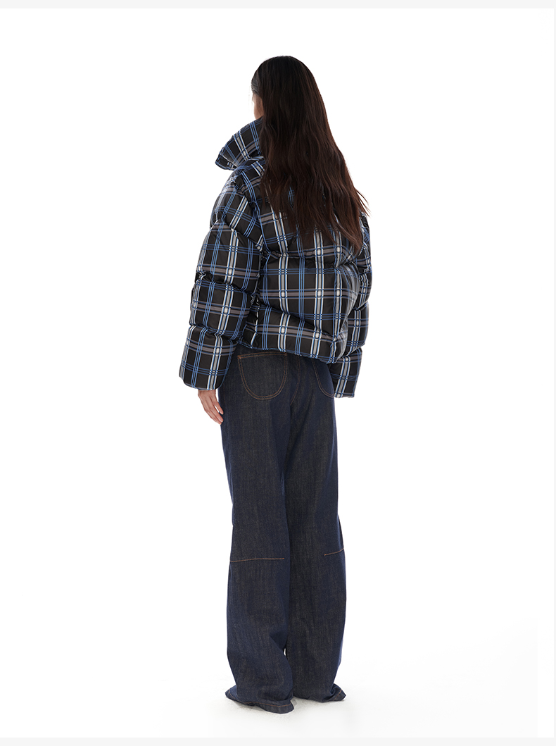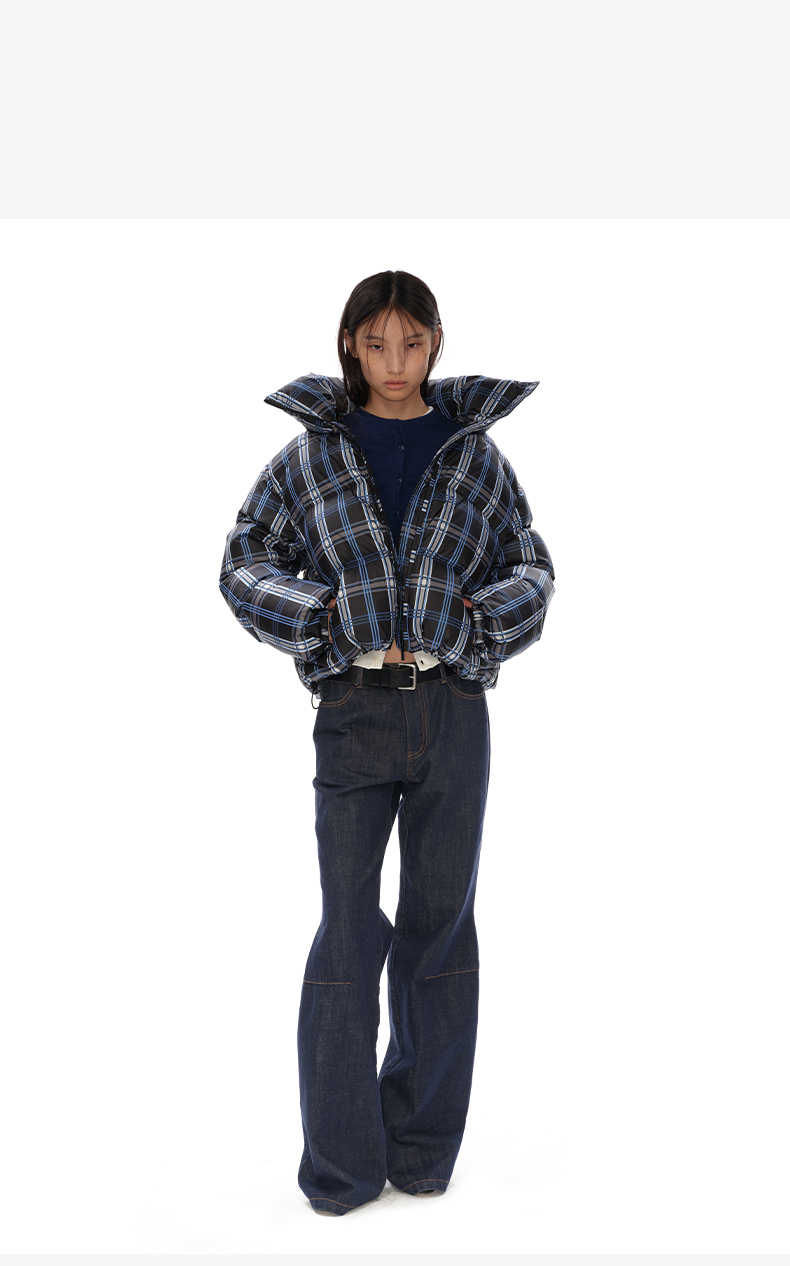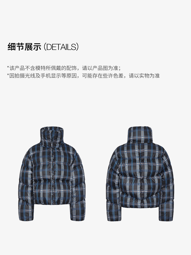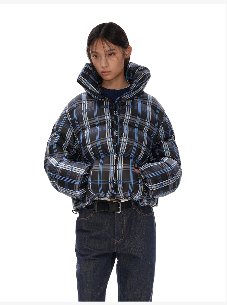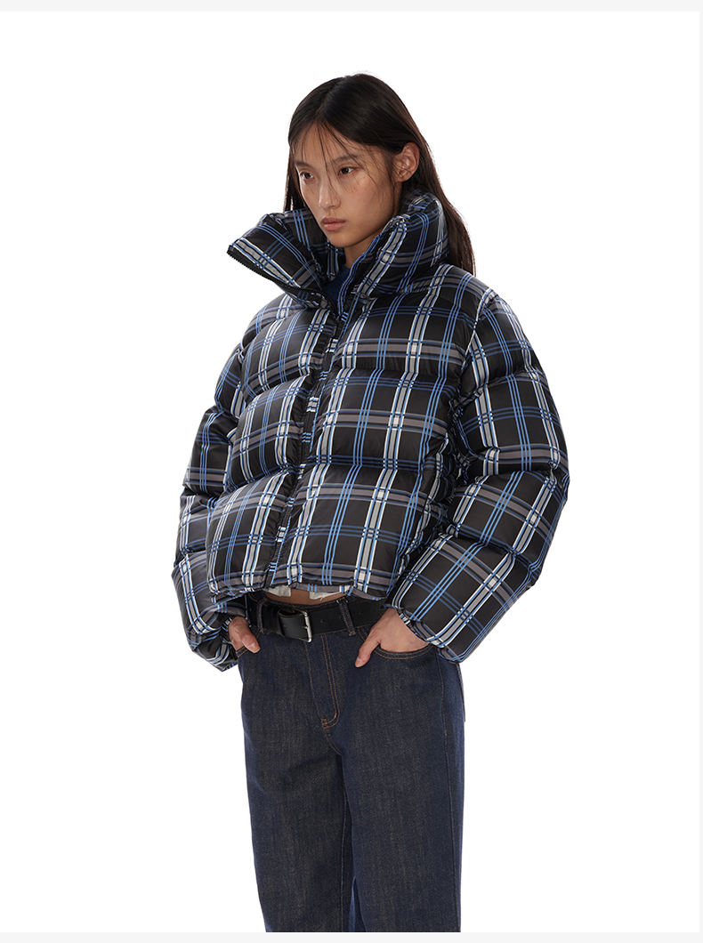 NUTH 90白鸭绒保暖格纹宽松短款格子立领羽绒服拉链外套女