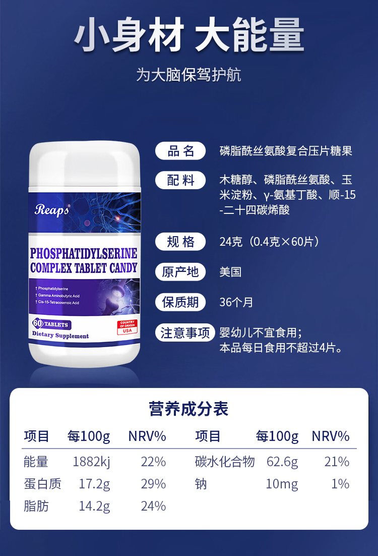 Reaps 瑞普斯 青中年人磷脂酰丝氨酸复合片 60片/瓶