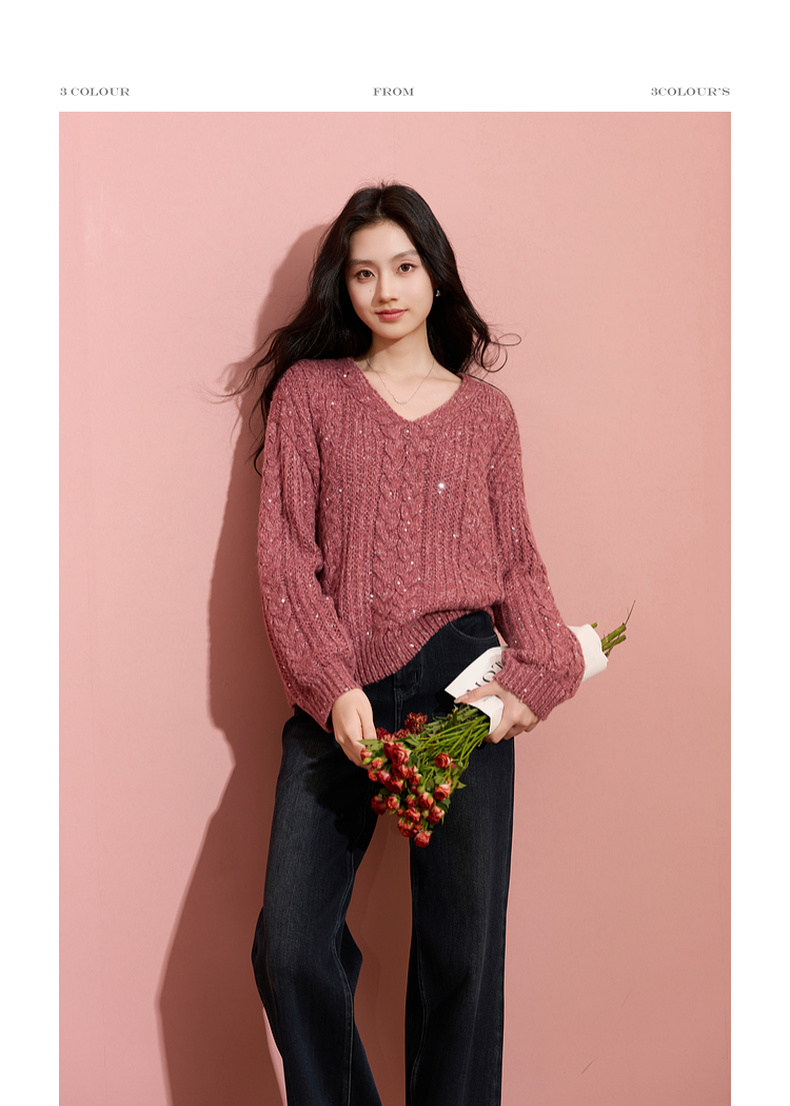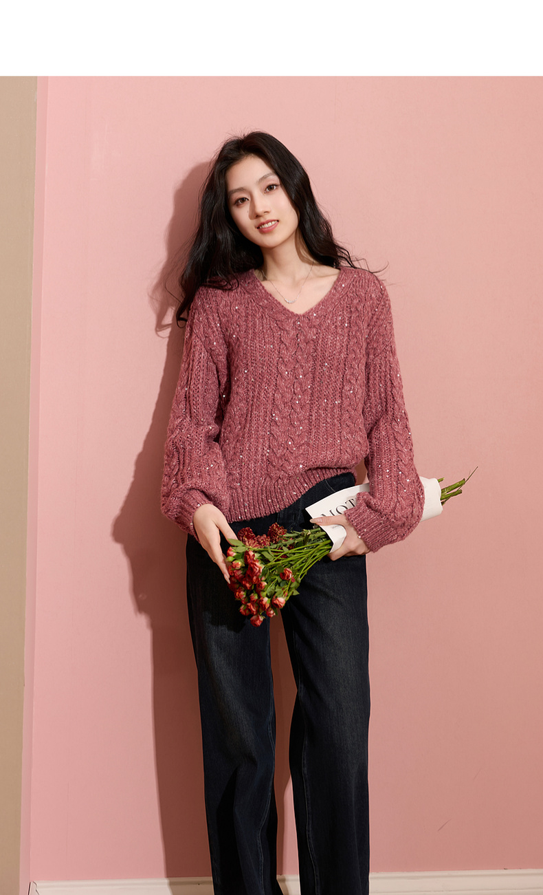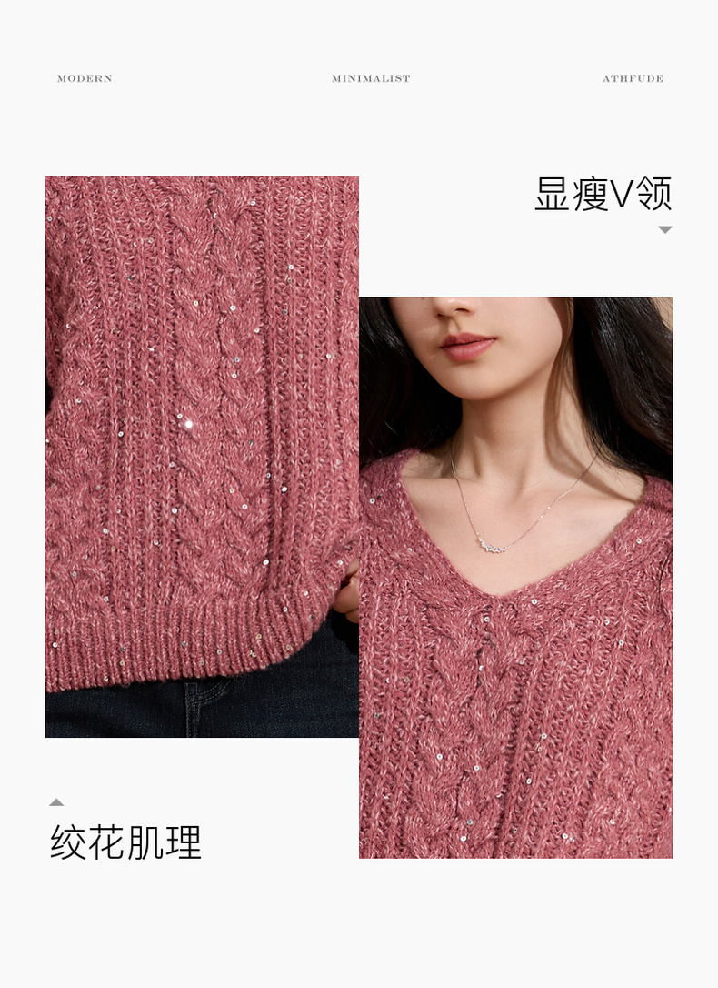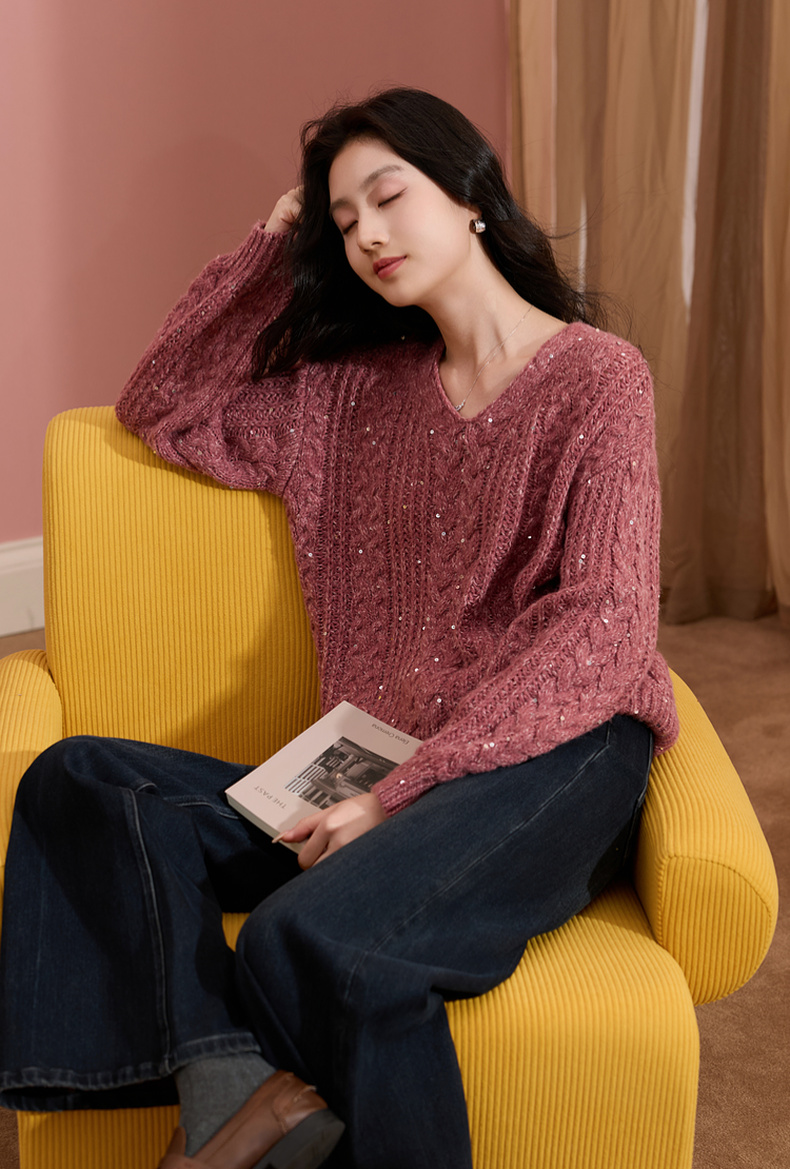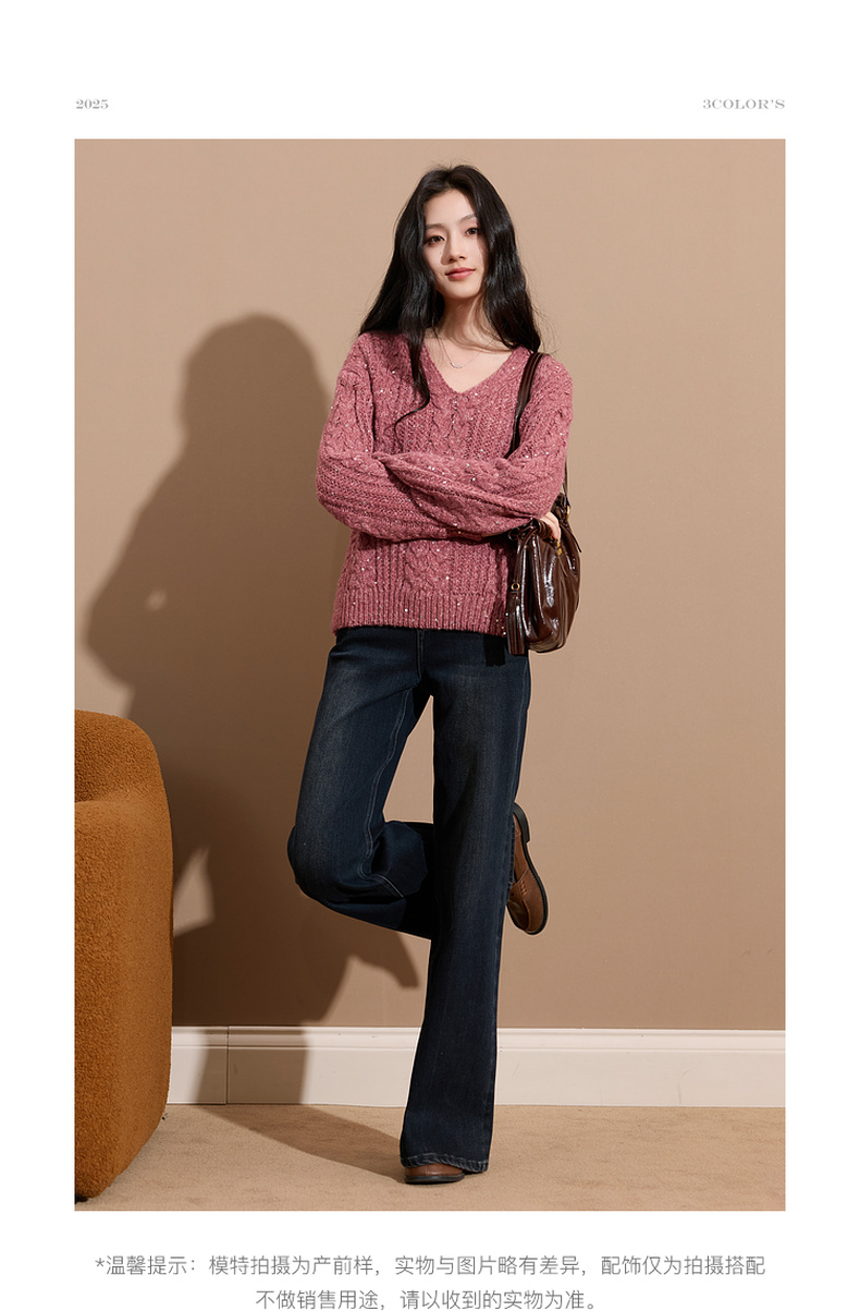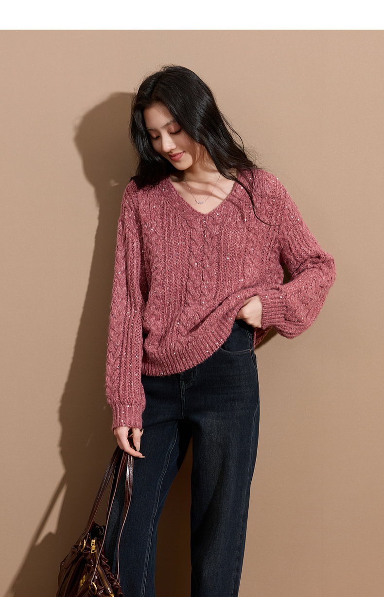 三彩2025冬季新款复古绞花V领针织衫宽松慵懒保暖套头毛衫S