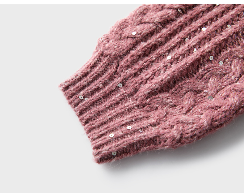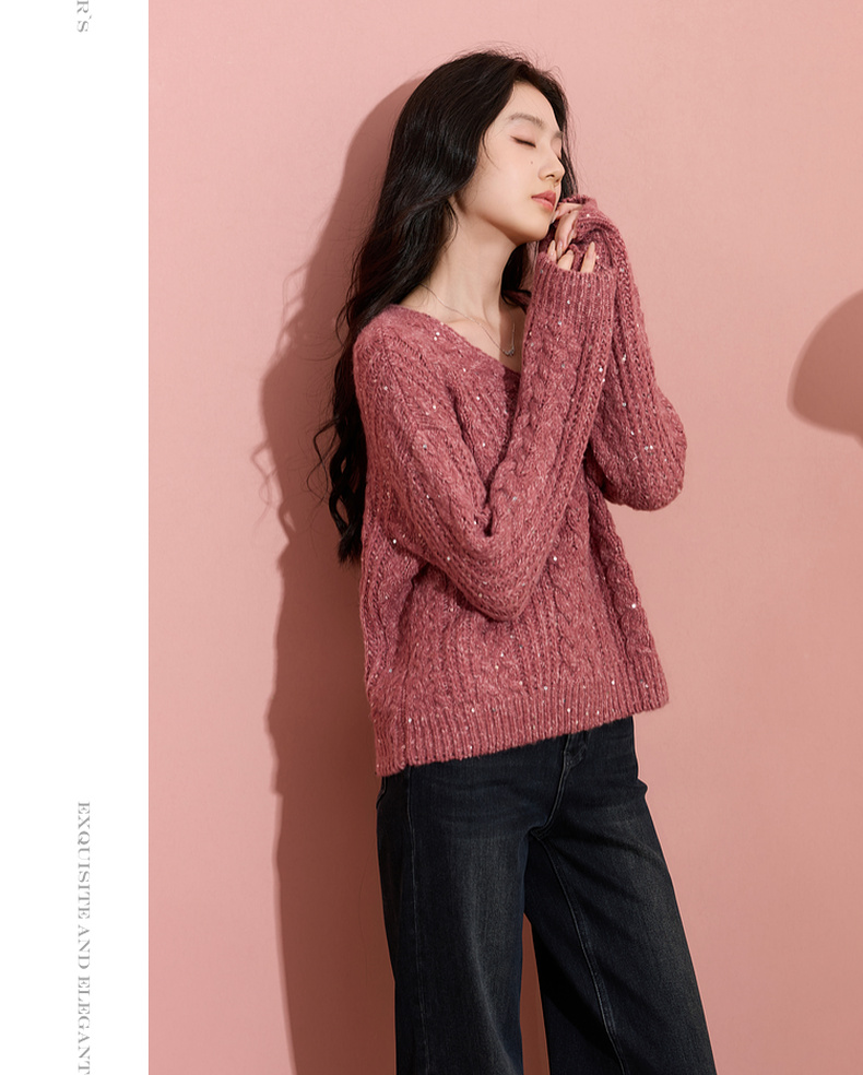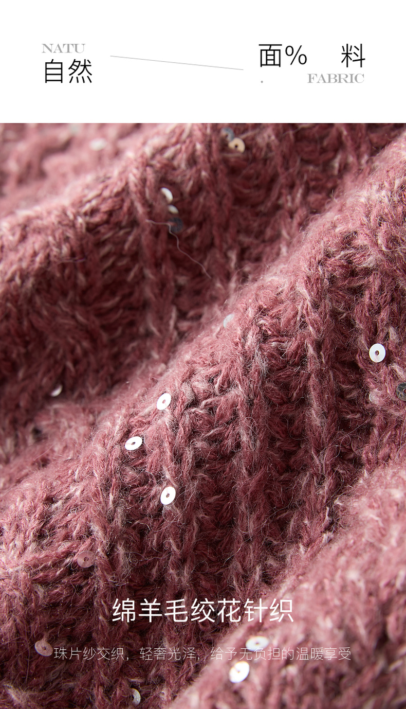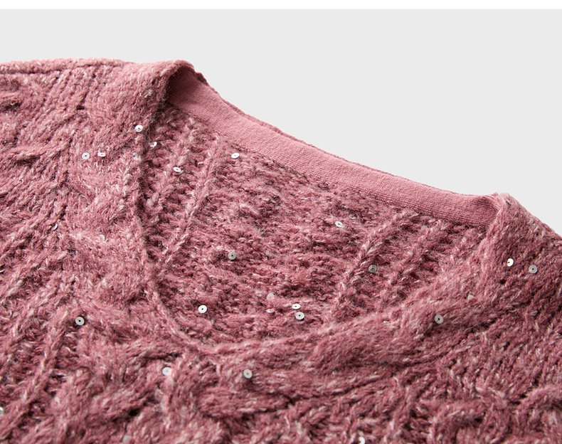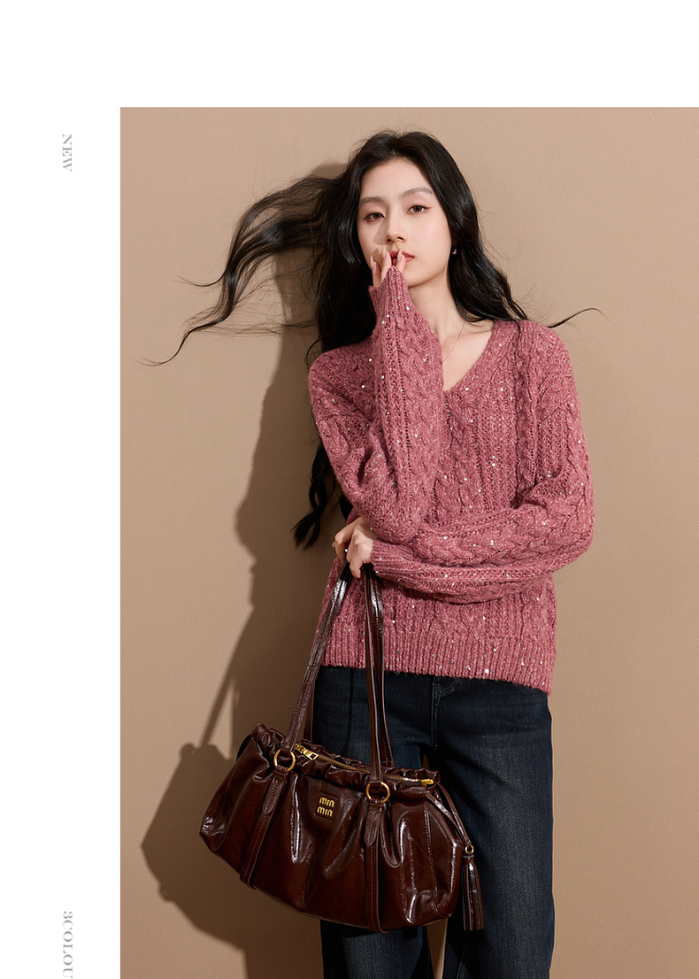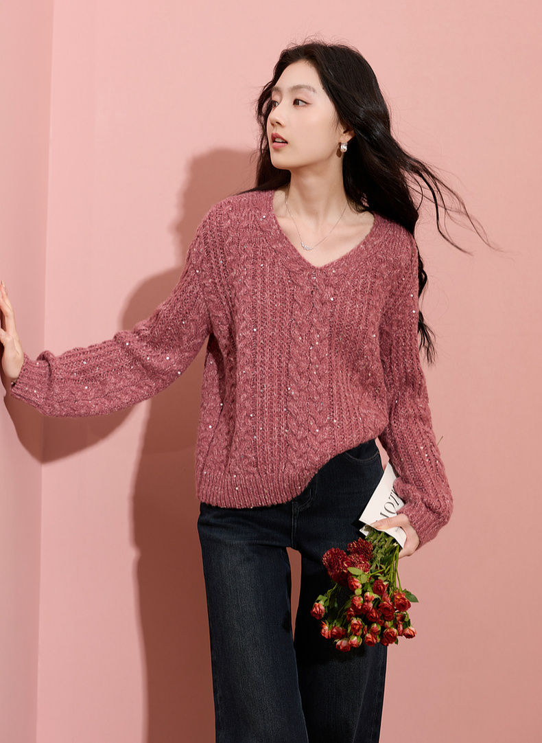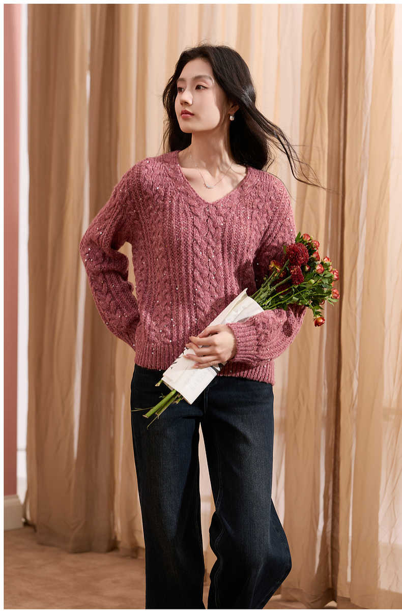 三彩2025冬季新款复古绞花V领针织衫宽松慵懒保暖套头毛衫S