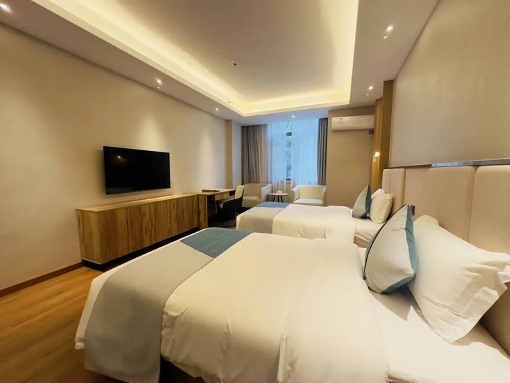 商务标间:建筑面积 23 - 28 平方米,配置推拉窗,可开启,通风效果佳。房间摆放 2 张 1.2 米床,不支持加床 。