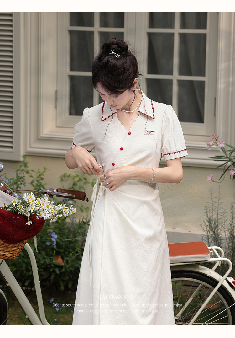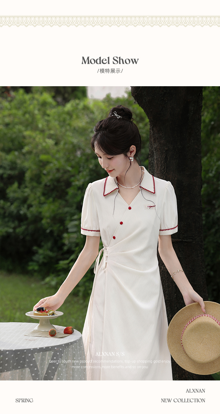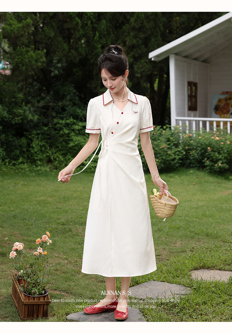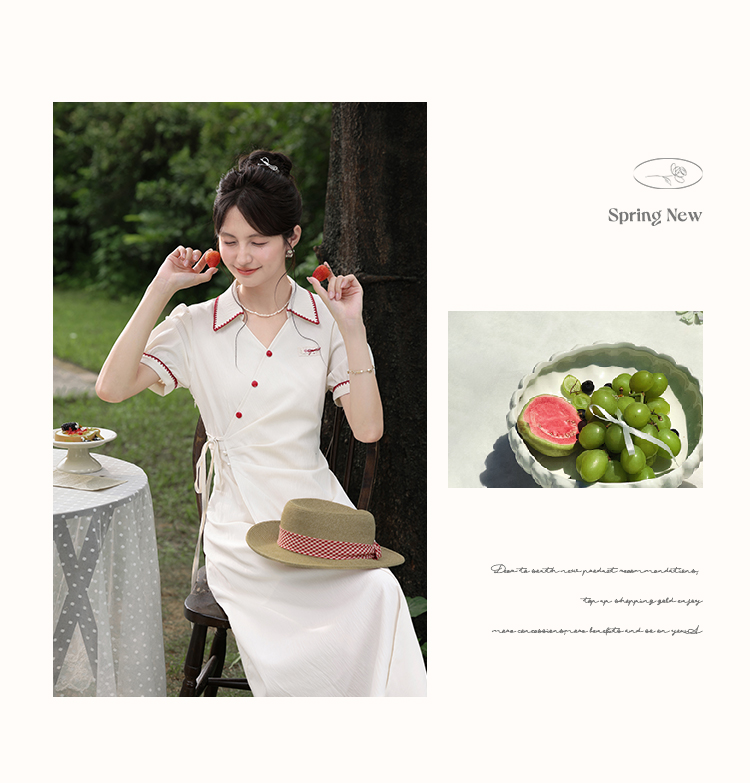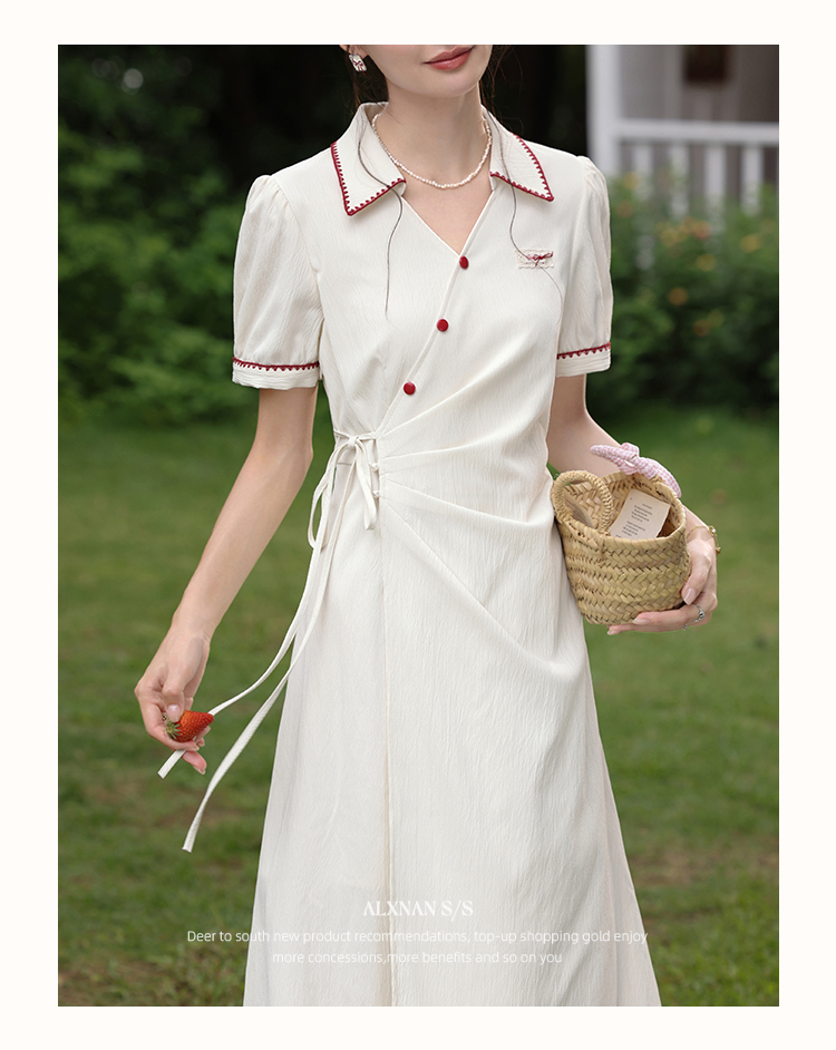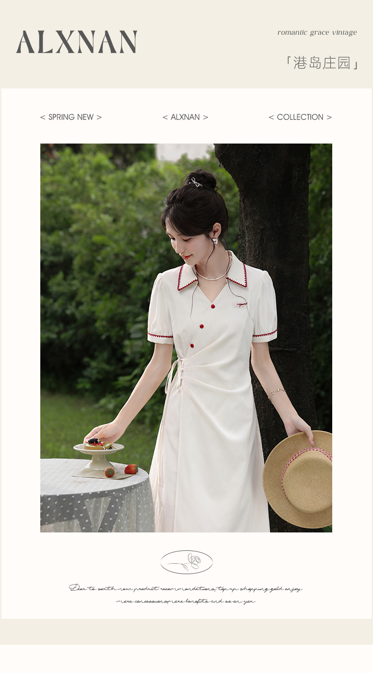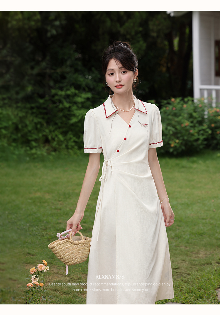 鹿向南「港岛庄园」气质POLO领杏色短袖连衣裙收腰显瘦长裙女夏季