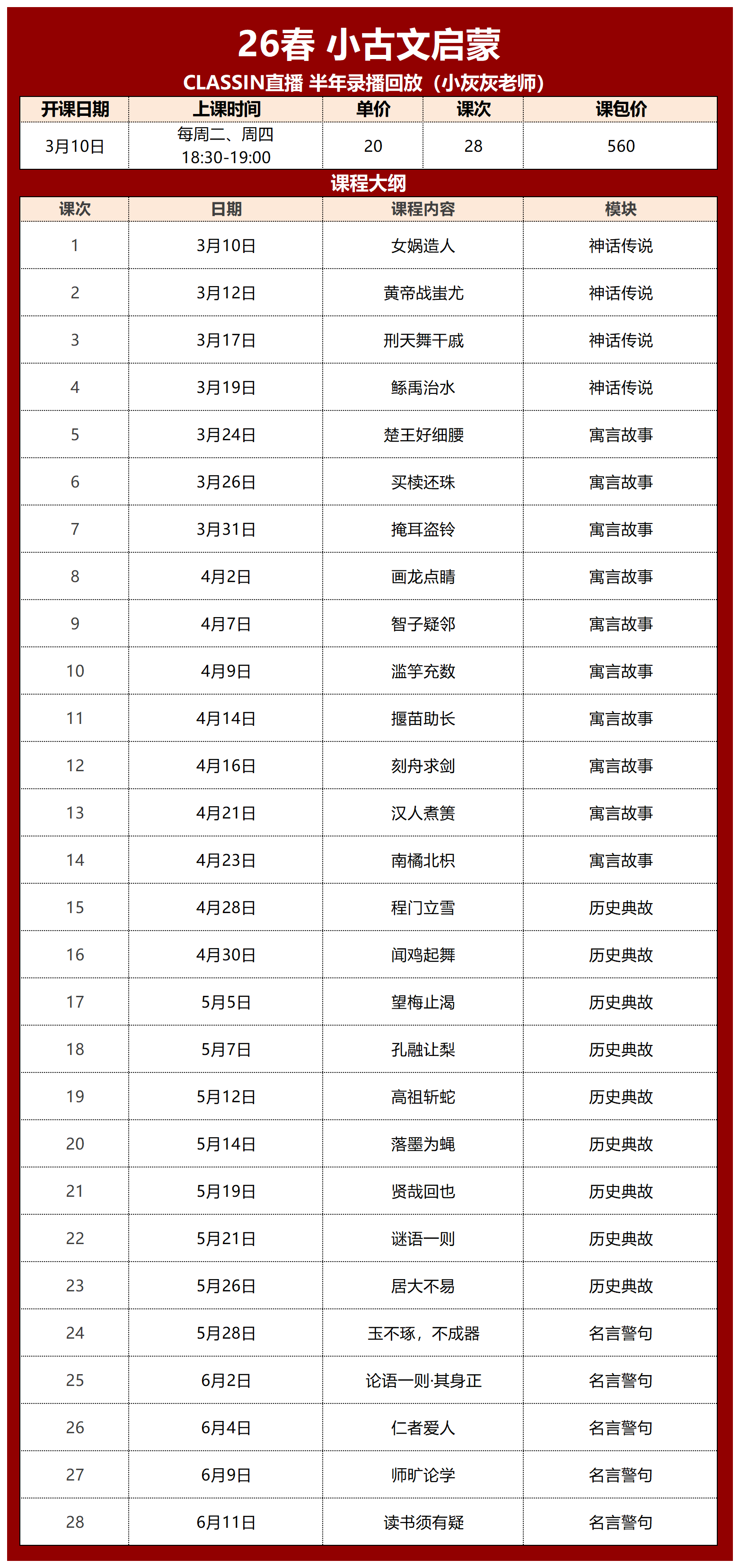 一共28讲 20元/30分钟/讲,课包560