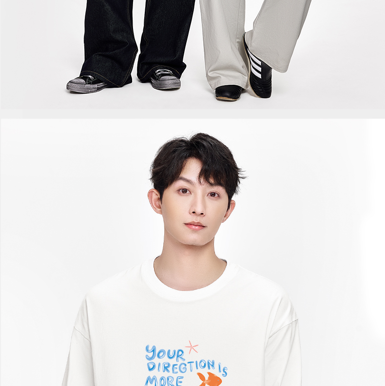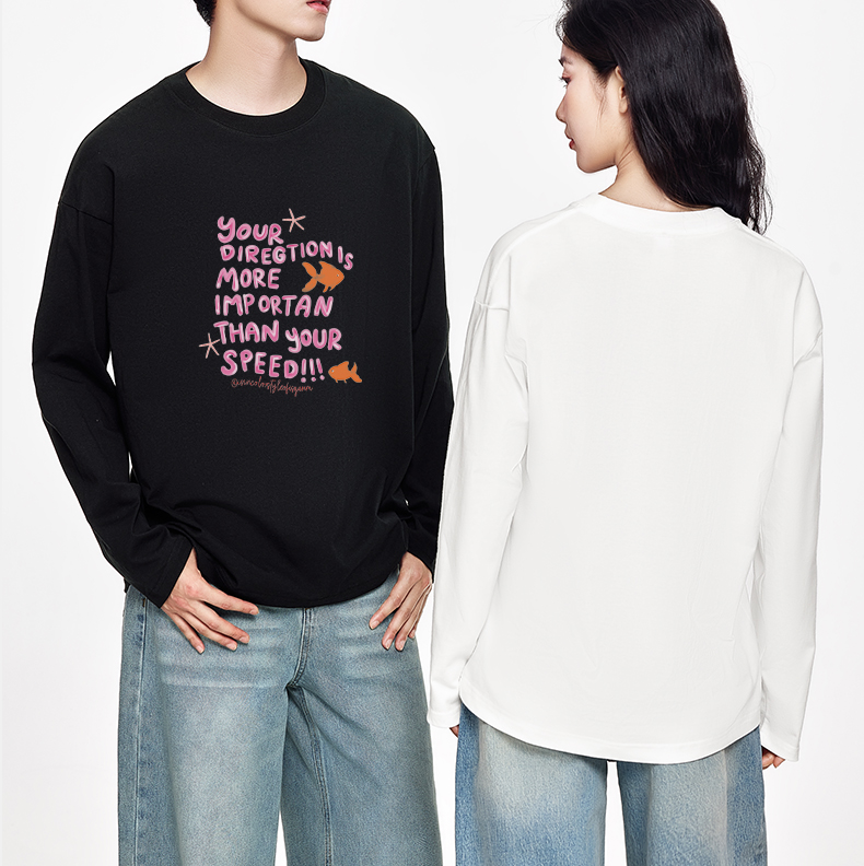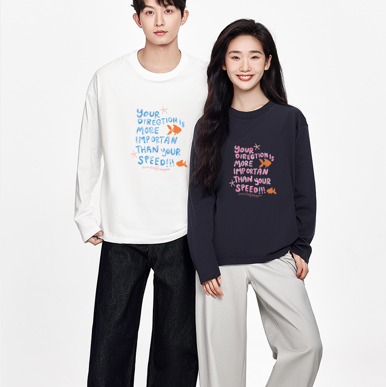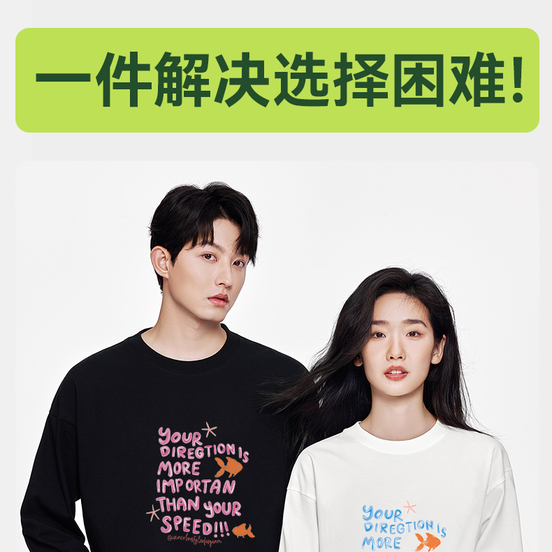 「棉的美学」纯棉长袖t恤男春秋新款字母金鱼印花宽松休闲打底上衣