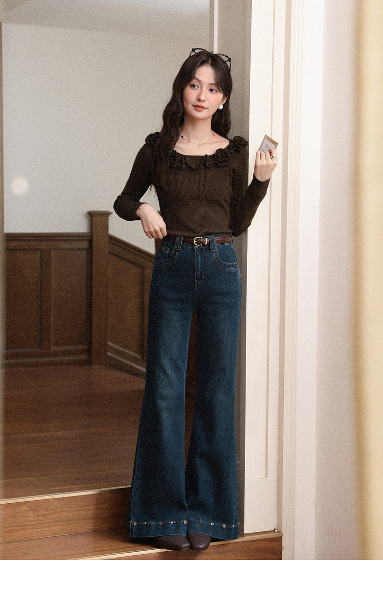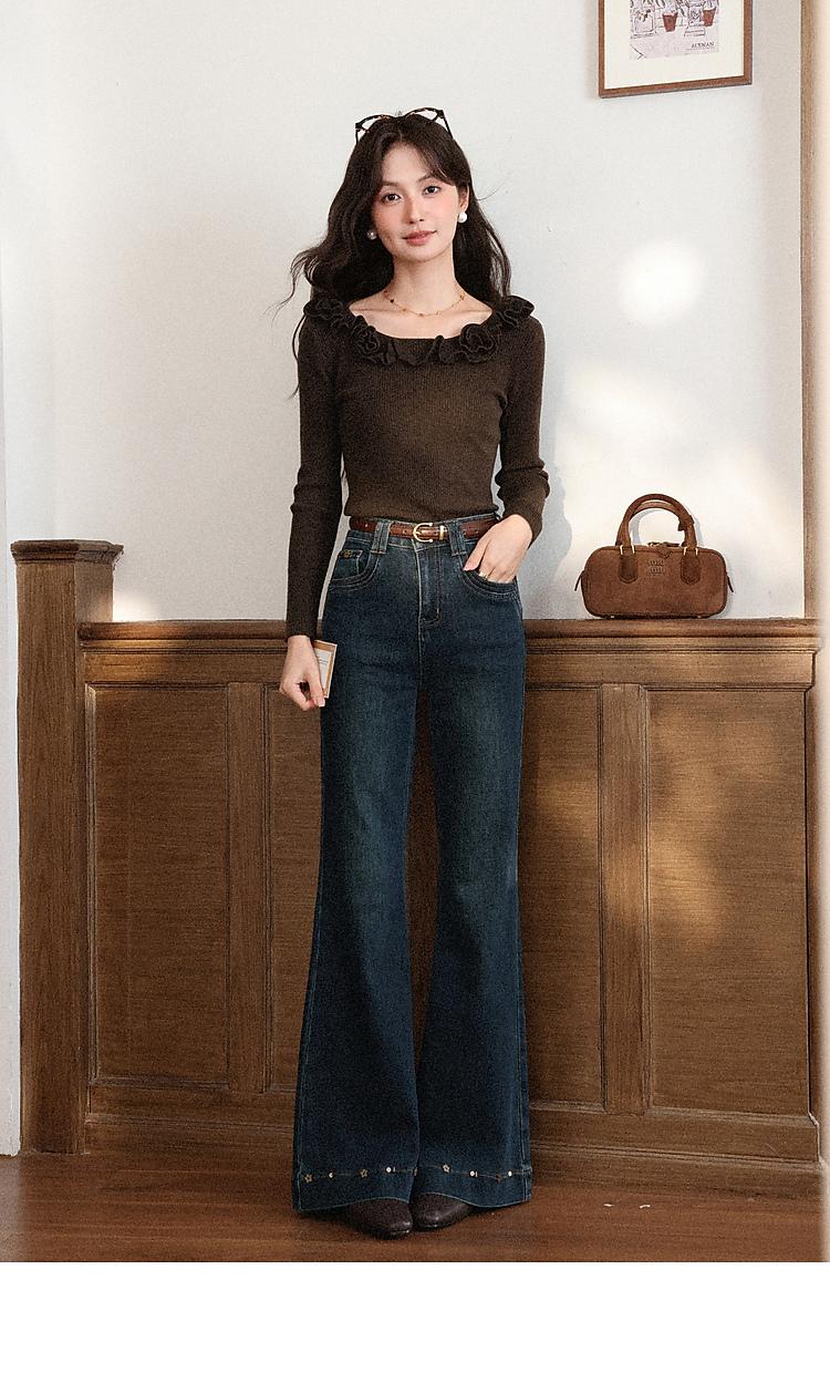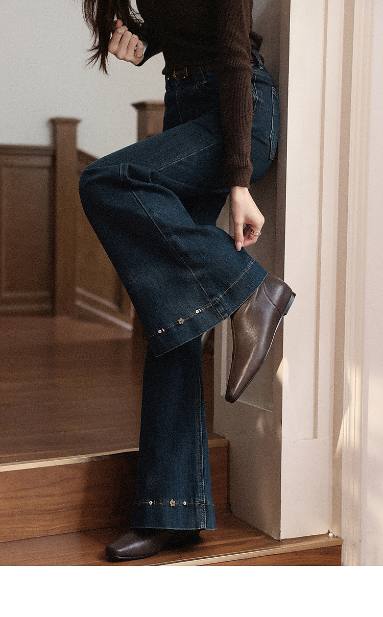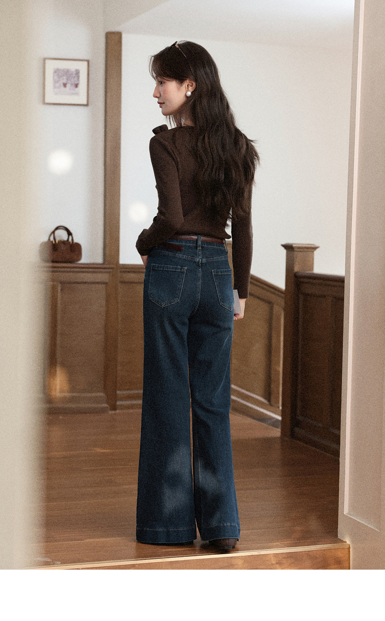 鹿向南「闲暇时光」蓝色显瘦气质微喇牛仔裤女秋新款高腰直筒长裤