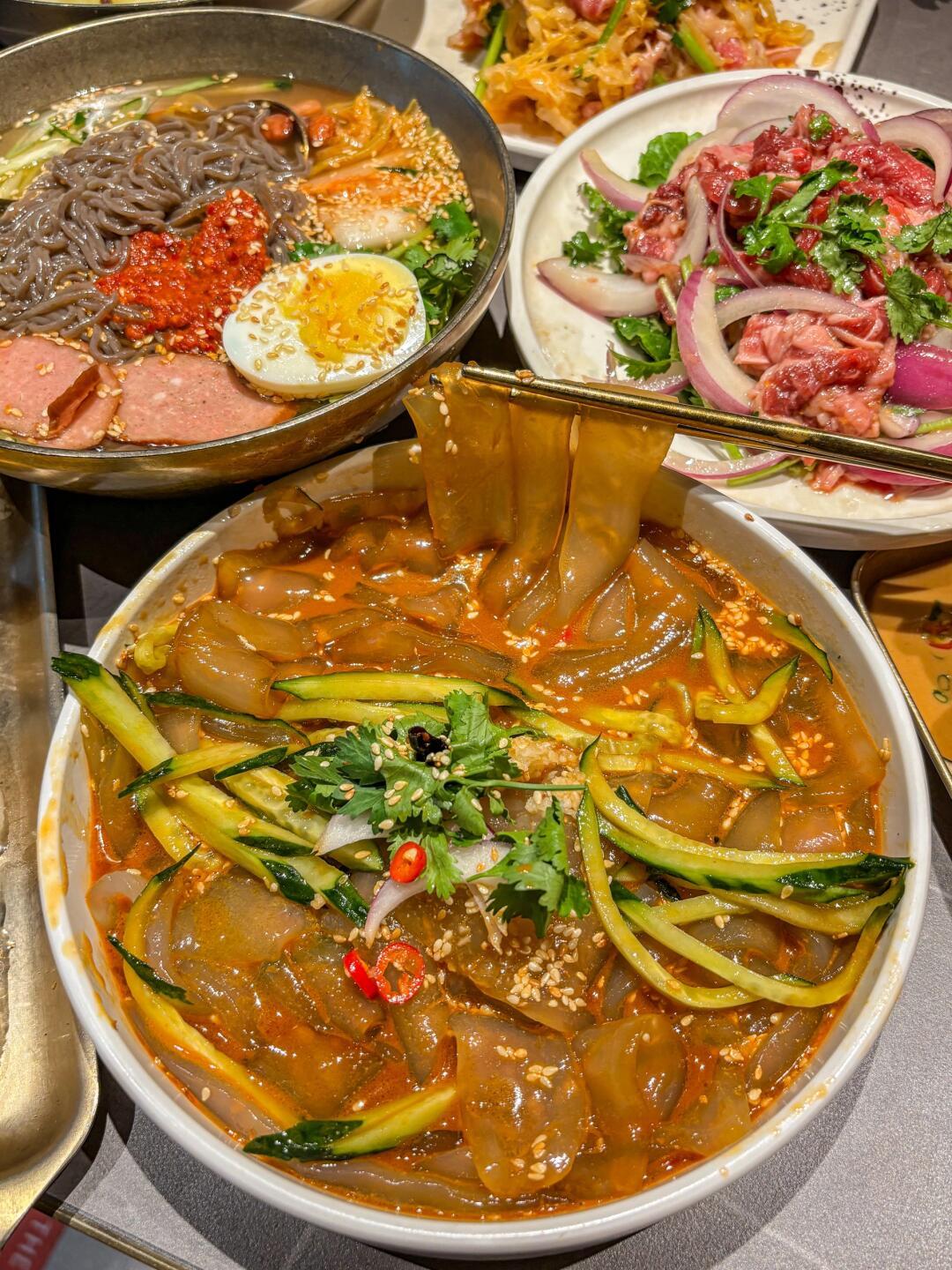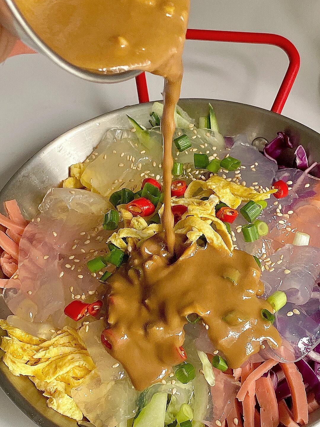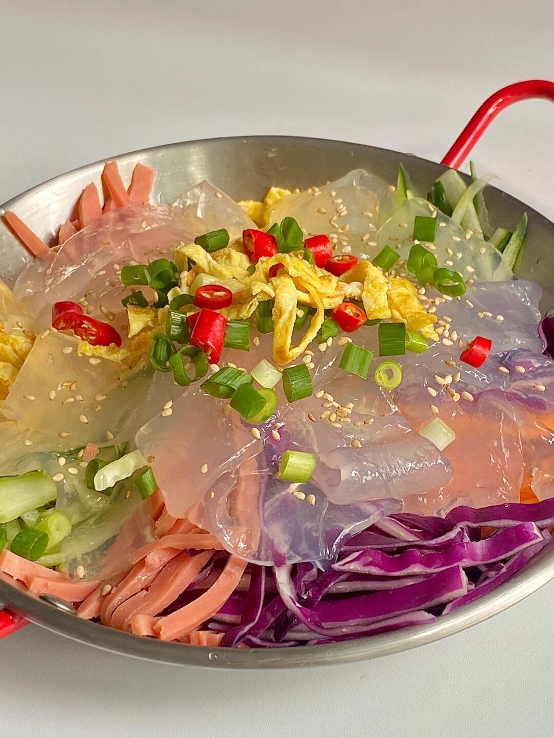 五彩大拉皮🧑🍳 东北人的蔬菜沙拉🥗 鸡蛋饼切丝,火腿肠切丝 黄瓜 胡萝卜 紫甘蓝切丝,拉皮泡开铺在配菜上, 二八酱加生抽醋糖水, 搅拌均匀倒在拉皮上加辣椒油搅拌均匀💥 自己在家做爱吃麻酱可以多多放‼️
