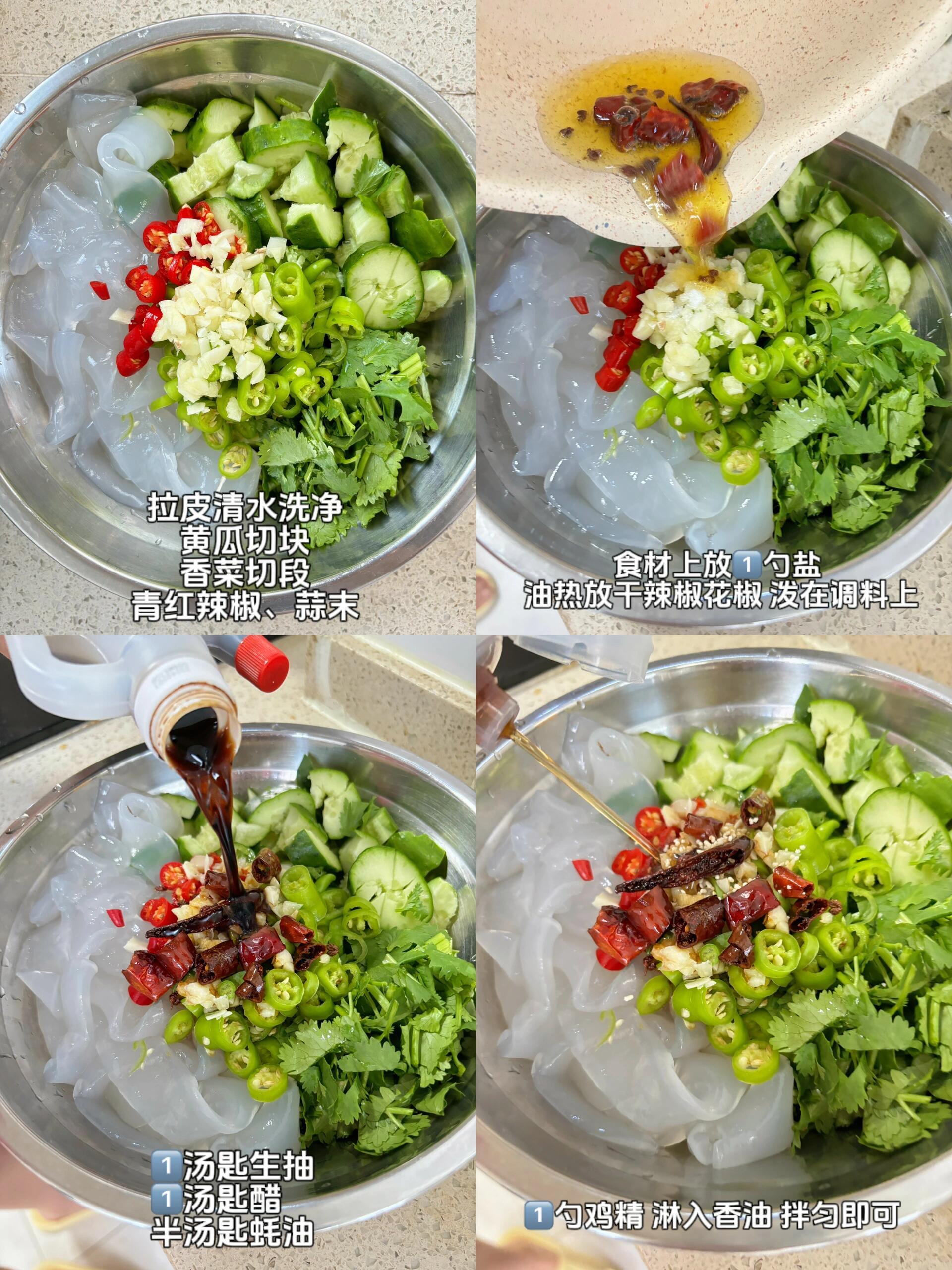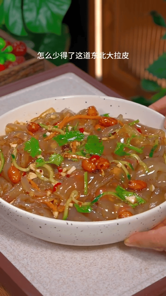 东北饭店桌桌必点的水晶大拉皮做法来喽!✅ 夏天必吃,开胃解腻 🥚食材:黄瓜、东北水晶大拉皮、蒜末、香菜、青红辣椒 🍲做法: 拉皮清水洗一下,黄瓜切块,香菜切段,青红辣椒,蒜末放入盆中~ 放一勺盐、油烧热放干辣椒花椒,泼在盐上~ 放一勺生抽、一勺醋、一勺鸡精、半勺耗油、淋上香油拌匀即可✅ ⚠️:泼油小心哦