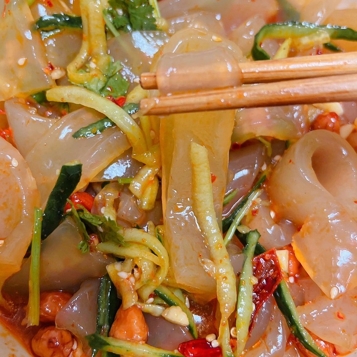 Q弹爽滑的【东北水晶大拉皮】 加上重重的辣椒油🌶️🌶️🌶️ 香酥的花生碎、清爽的豆芽黄瓜丝🥒 绝对是夏天里最让人欲罢不能的味道‼️