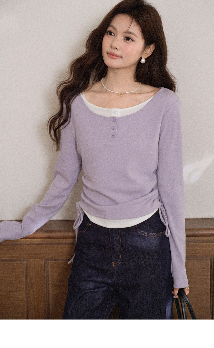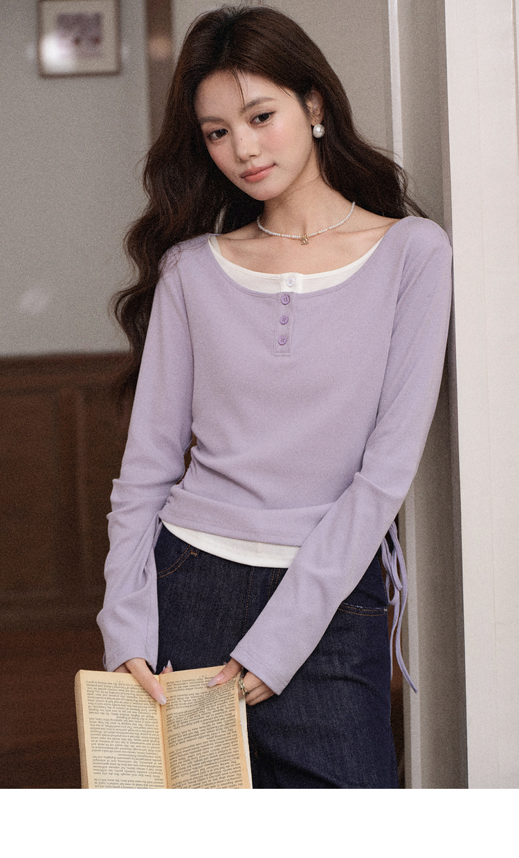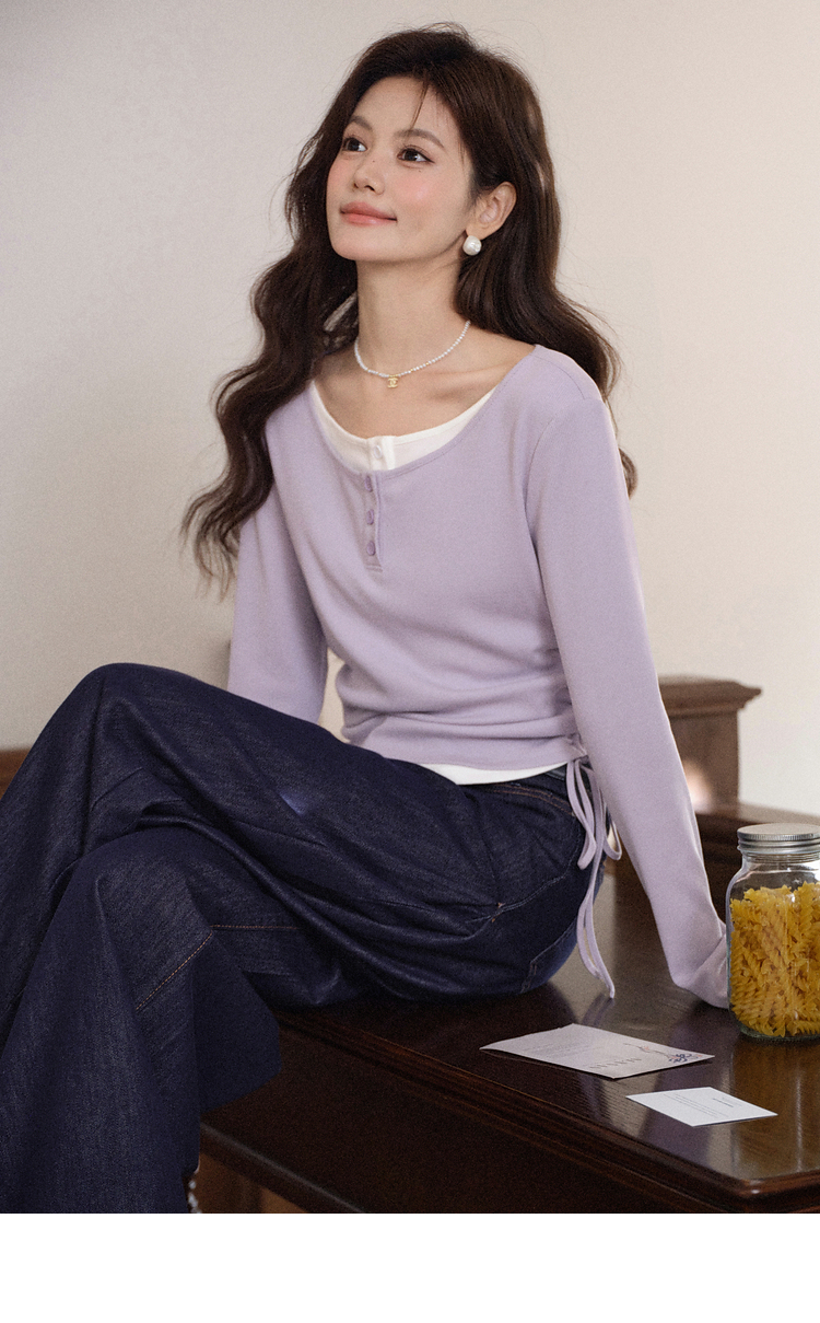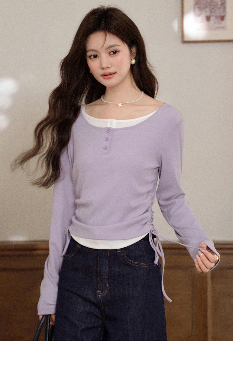 鹿向南「香芋蛋糕」紫色设计感假两件长袖T恤女早秋减龄显瘦上衣