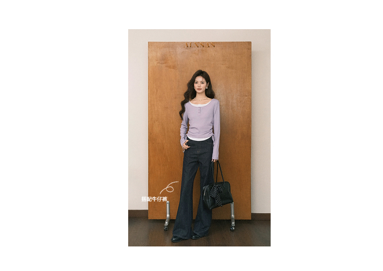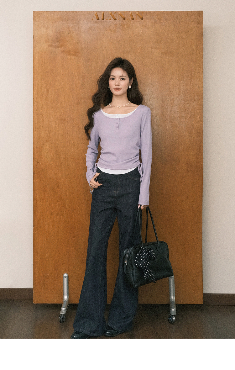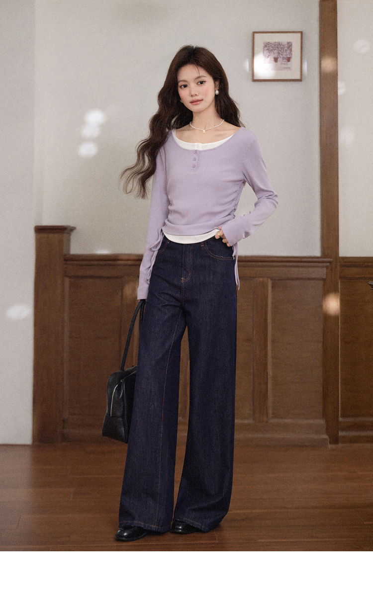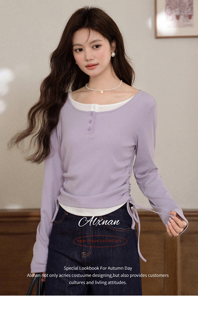 鹿向南「香芋蛋糕」紫色设计感假两件长袖T恤女早秋减龄显瘦上衣
