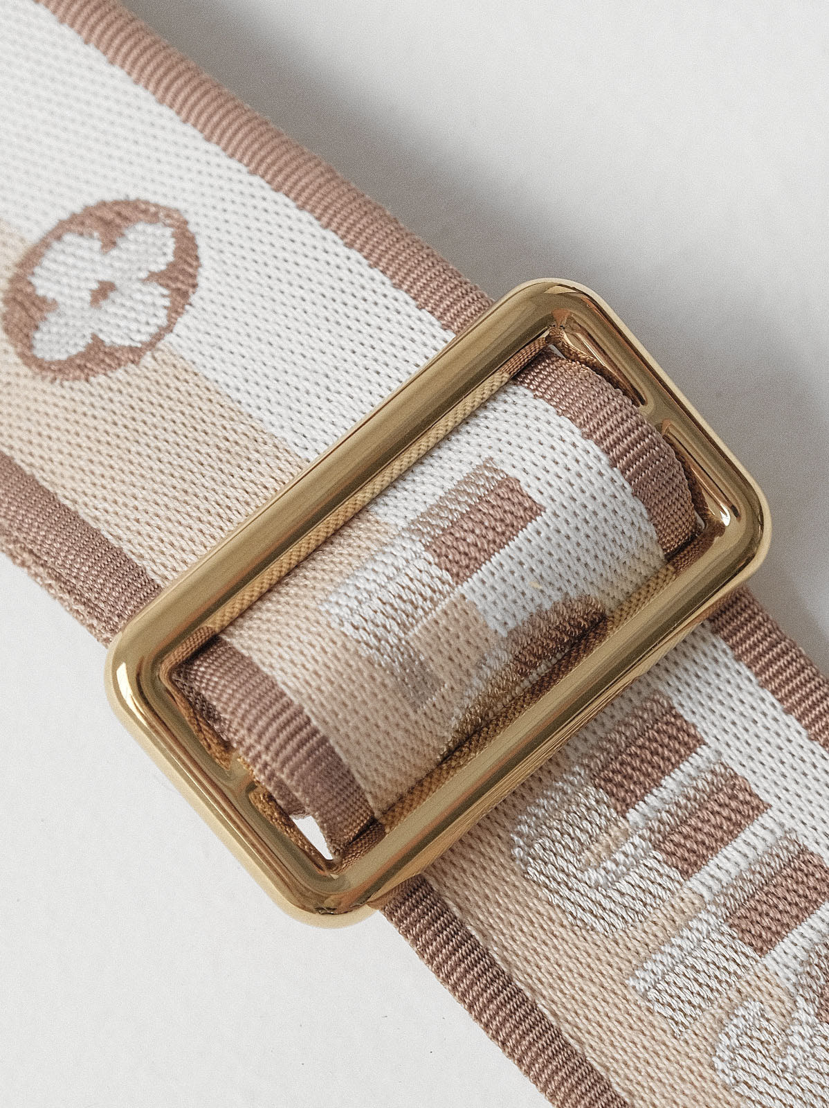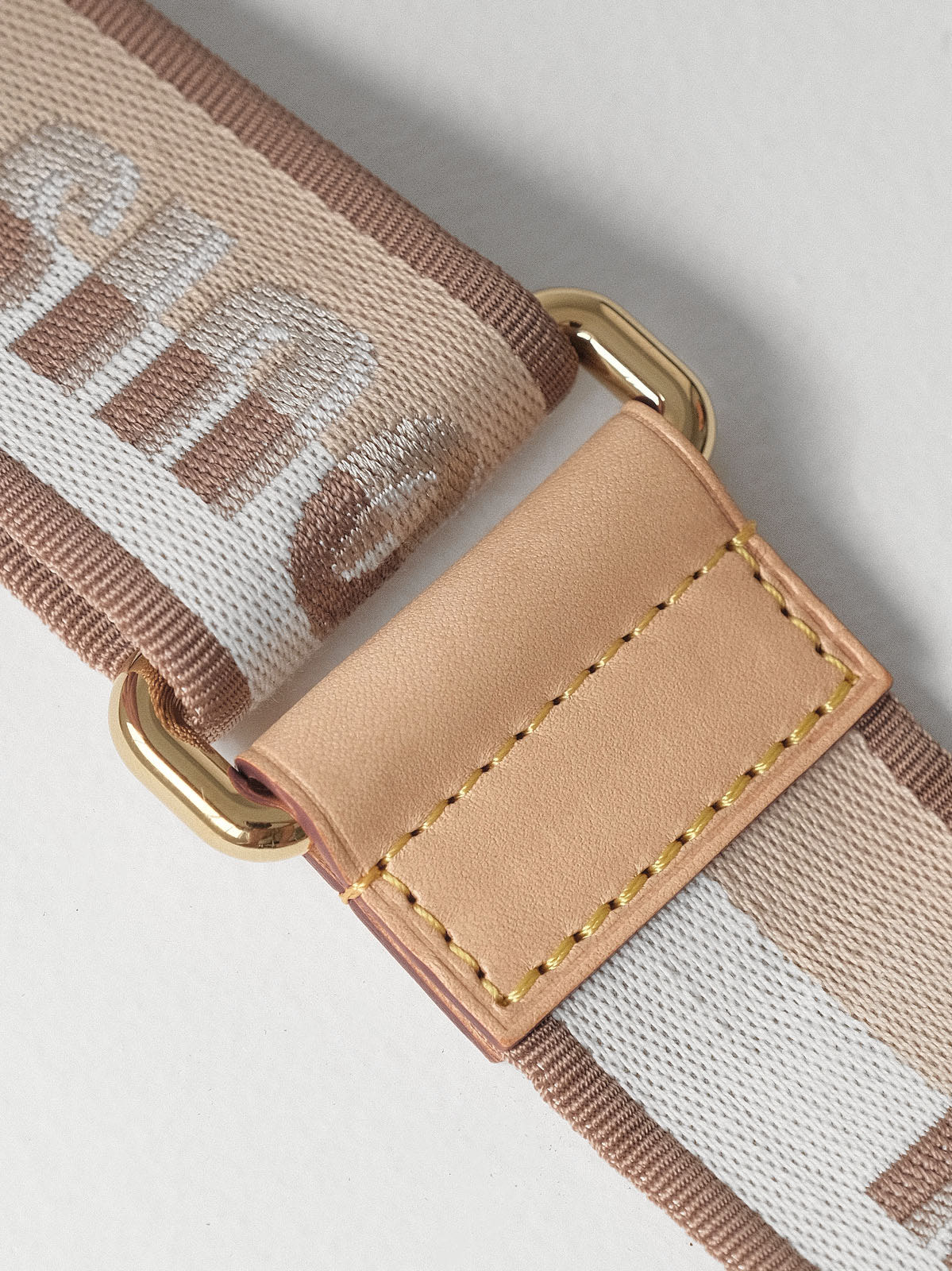 配有奶茶色肩带,是可以拆卸的!调节包带半长:39.0厘米,包带半长可调至:58.0厘米…刺绣字母立体,多电头绣图案凹凸有质感,绒与布的结合,电绣的立体感,工绣追求的极致感,相当费时。宽肩带的好处就是久背不累肩,比那些皮质肩带友好很多,而且会更休闲时尚…