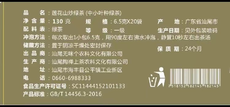 广东汕尾无咪个莲花山炒绿茶盒装130g/盒