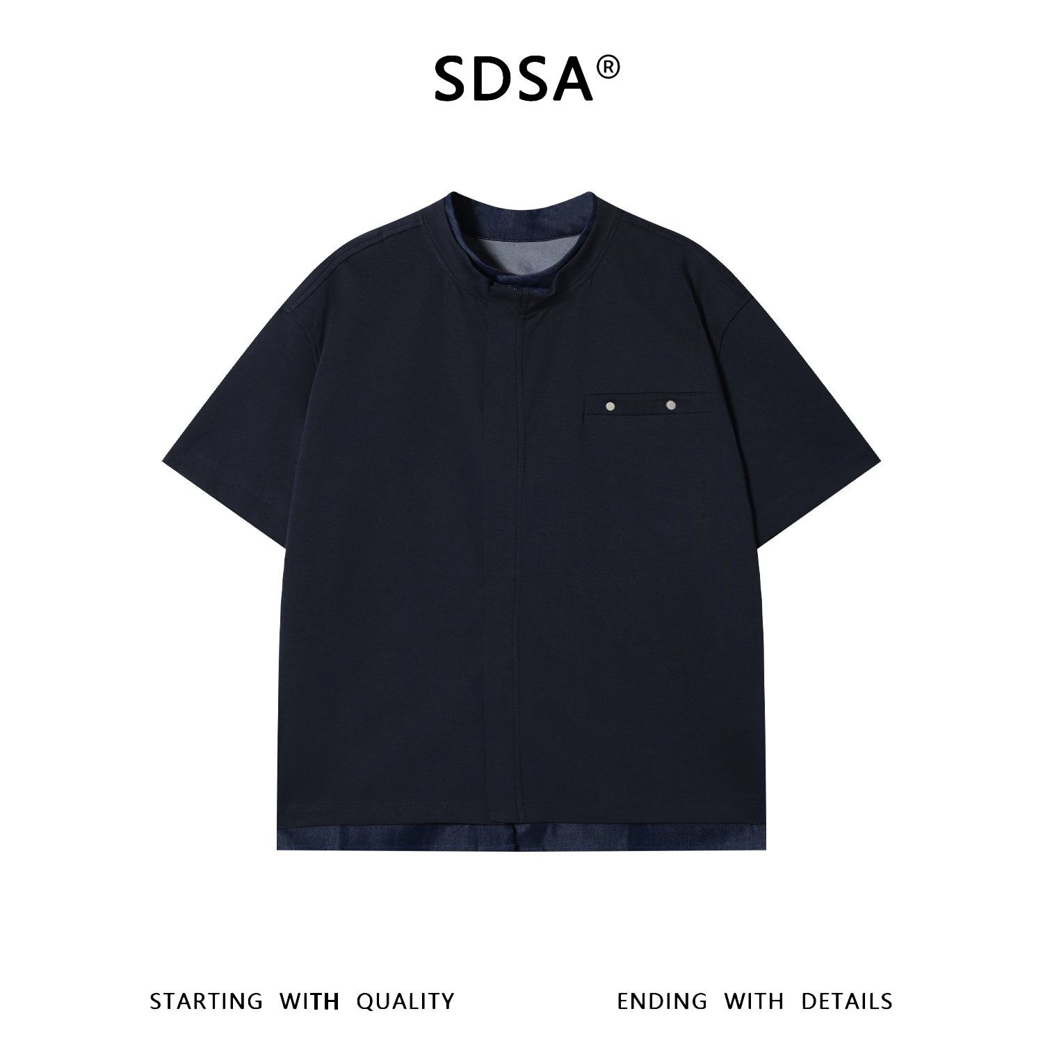 SDSA男装2026新款高贵轻奢立领假两件T恤口袋钉扣短袖百搭时尚潮