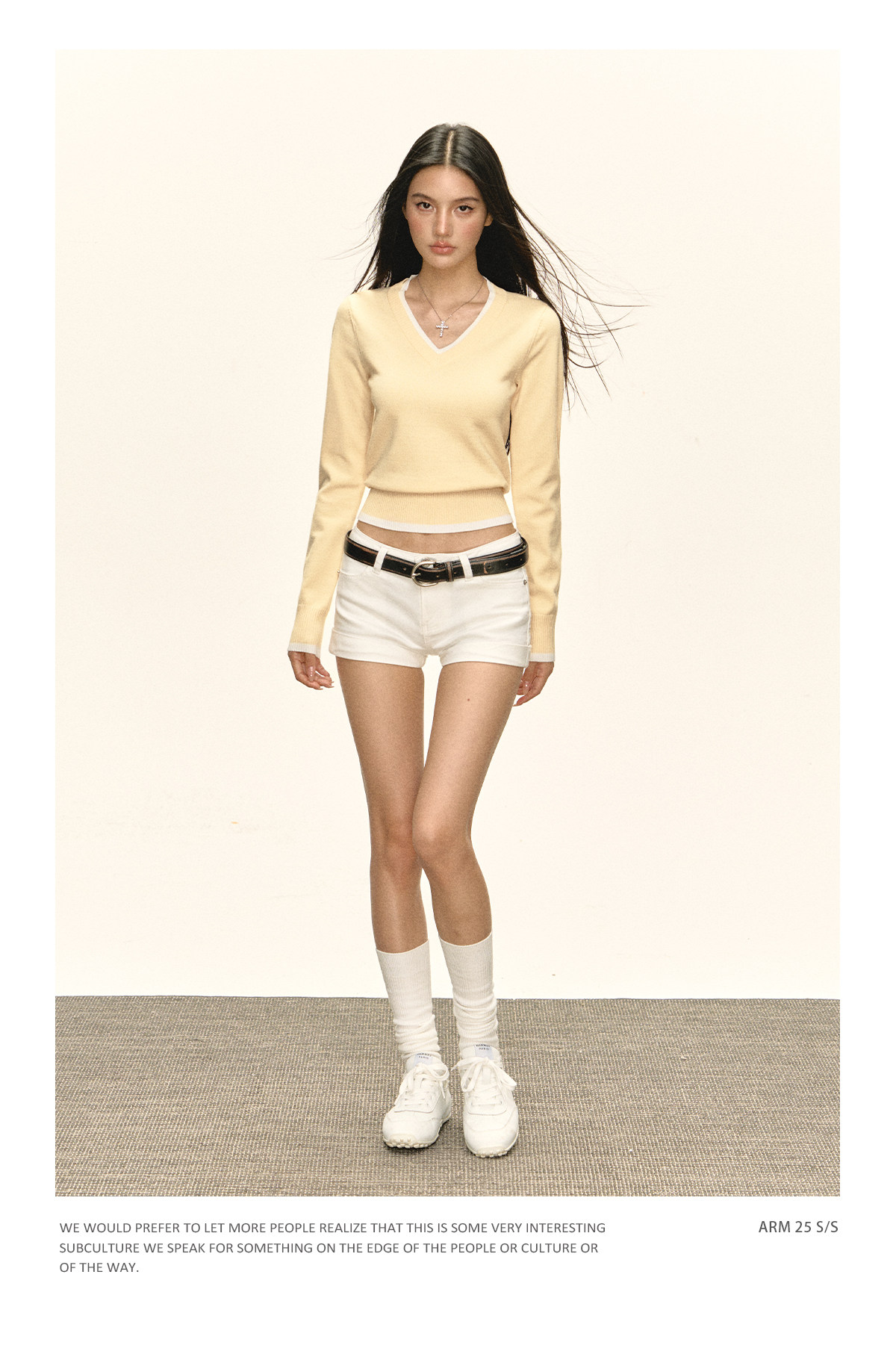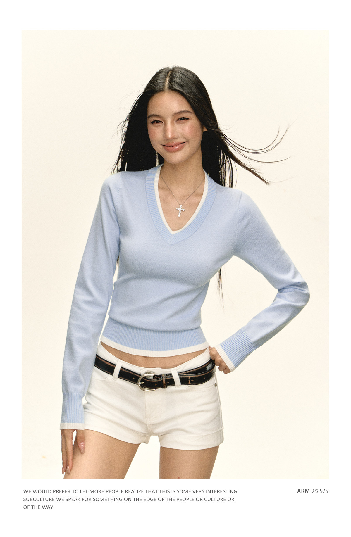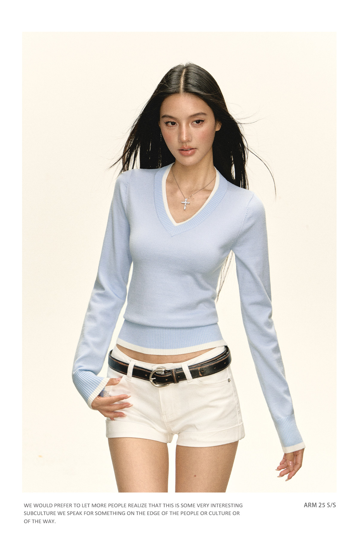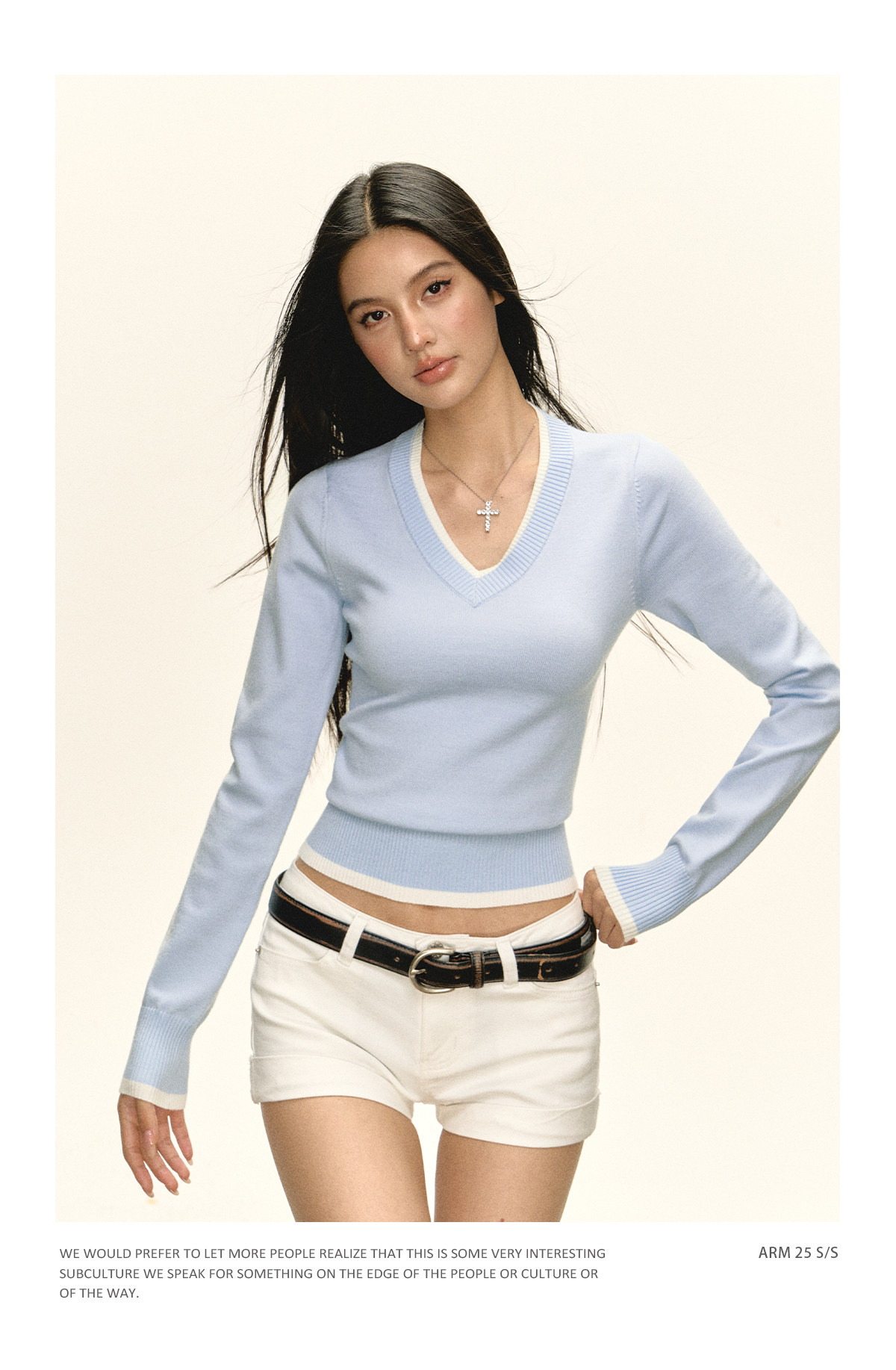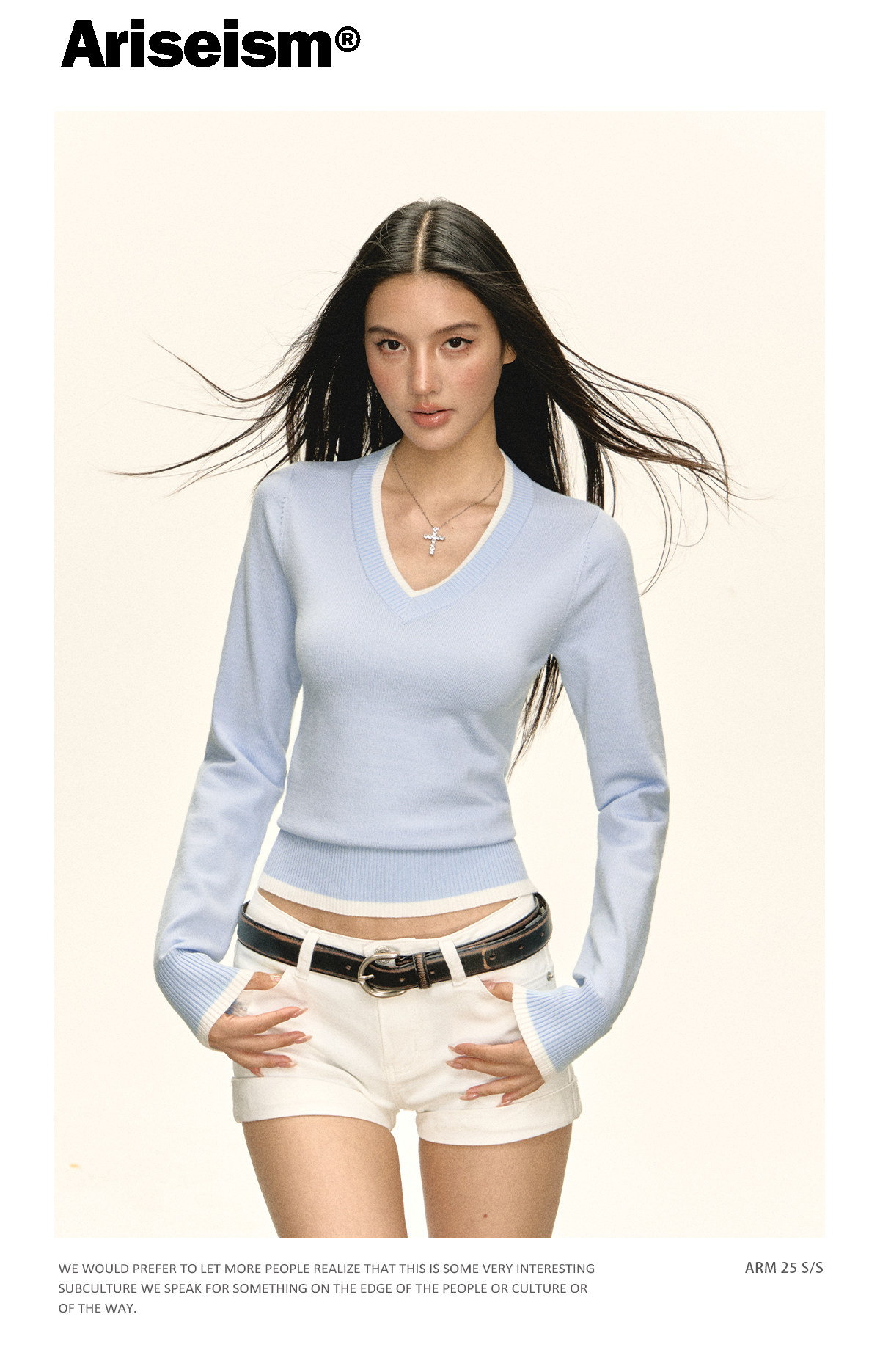 Ariseism美式复古4色小v领修身长袖针织衫女春季新款内搭打底上衣