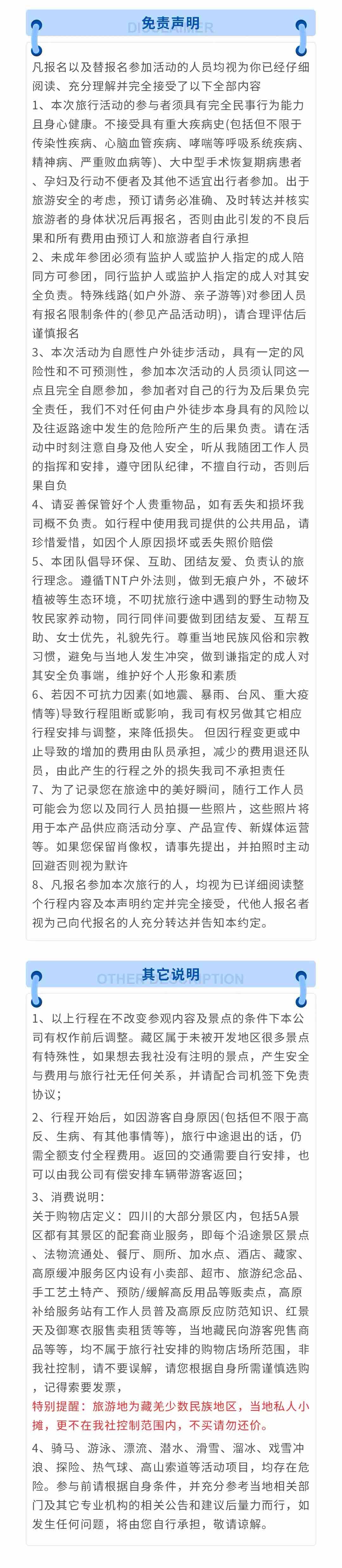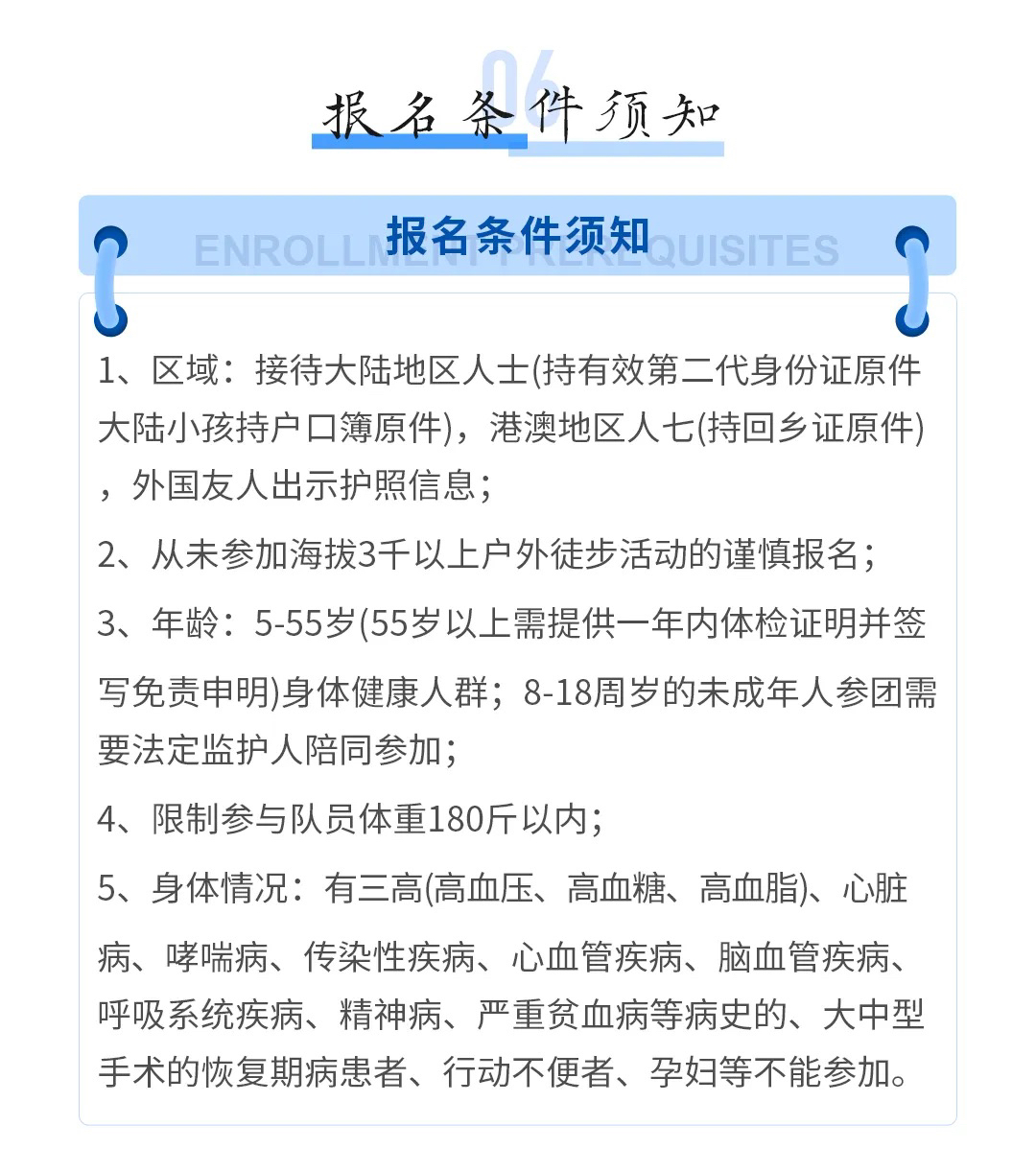 1、本活动为户外徒步,并非常规旅游活动,有一定的风险,参加者应根据自身的状况作出是否参加活动的决定,并应对自己的安全负完全责任,凡报名参加者均视为具有完全民事行为能力人,有心脏病,高血压,糖尿病,和会突发的疾病的请勿参加,在活动中发生的所有意外自行承担。