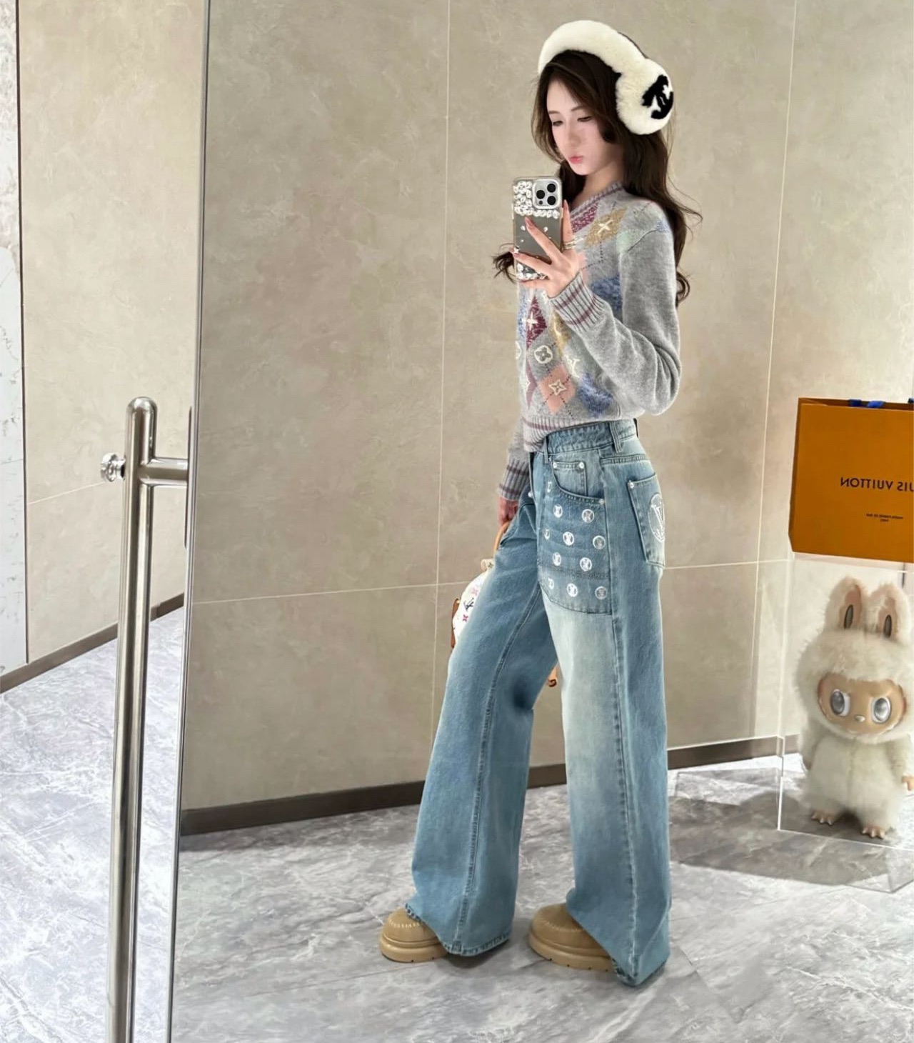 2. 穿搭适配:可搭配同系列牛仔亮片外套、3D提花高领衫,打造滑雪系列成套造型;日常可搭配简约针织衫或短款上衣,突出复古阔腿/修身线条。