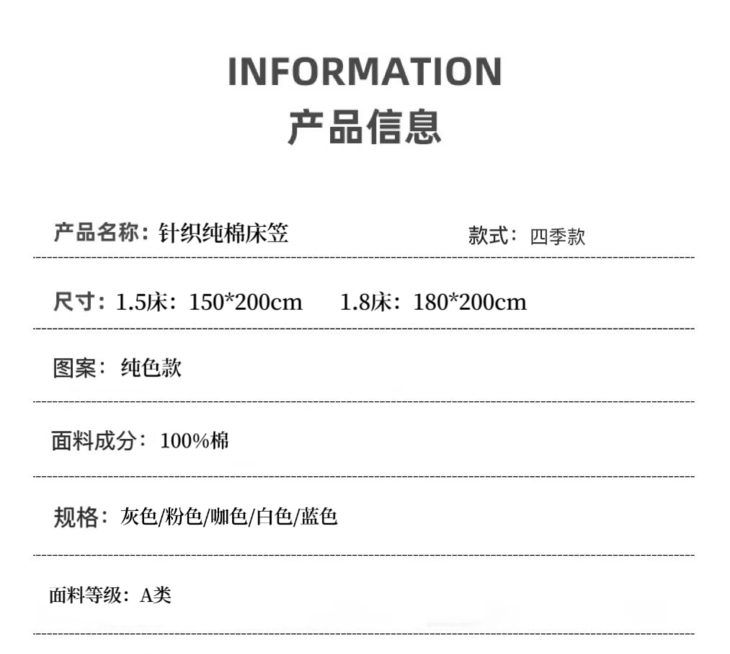 品名:纯棉床笠 颜色:灰色/白色/蓝色/粉色/咖色 尺寸: 150*200【单床笠不含枕套】 180*200【单床笠不含枕套】 发货时间:下单一般48小时内发货(周末、节假日除外) 发货地:南通 发货快递:韵达 物流信息:该商品全国部分地区包邮(内蒙古、甘肃、宁夏、海南、青海需补差运费5元/单, 新疆需补差运费20元/单,西藏、港澳台不发货,请知悉) 售后政策:本品包装配件完整、未水洗、不影响二次销售支持7天无理由退换货(无运费险),请知悉 温馨提示:因显示器、拍摄灯光等原因,可能会造成一定色差,纯棉材质因批次不同,颜色会稍有差别,具体以实物为准,请知悉 |