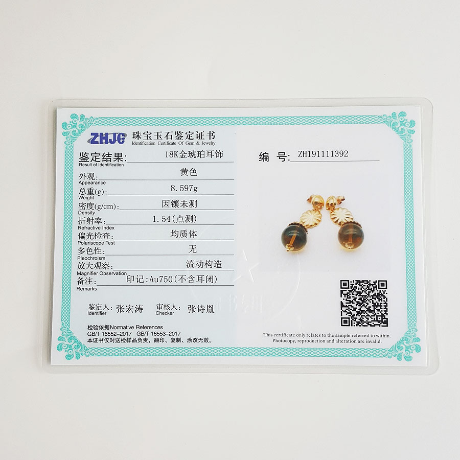 【天然正品】AU750黄金镶天然墨西哥蓝珀琥珀圆珠宫廷风耳环46.0*13.9*13.9MM(皆取最大值)女士现售价:4880!021124NJS11