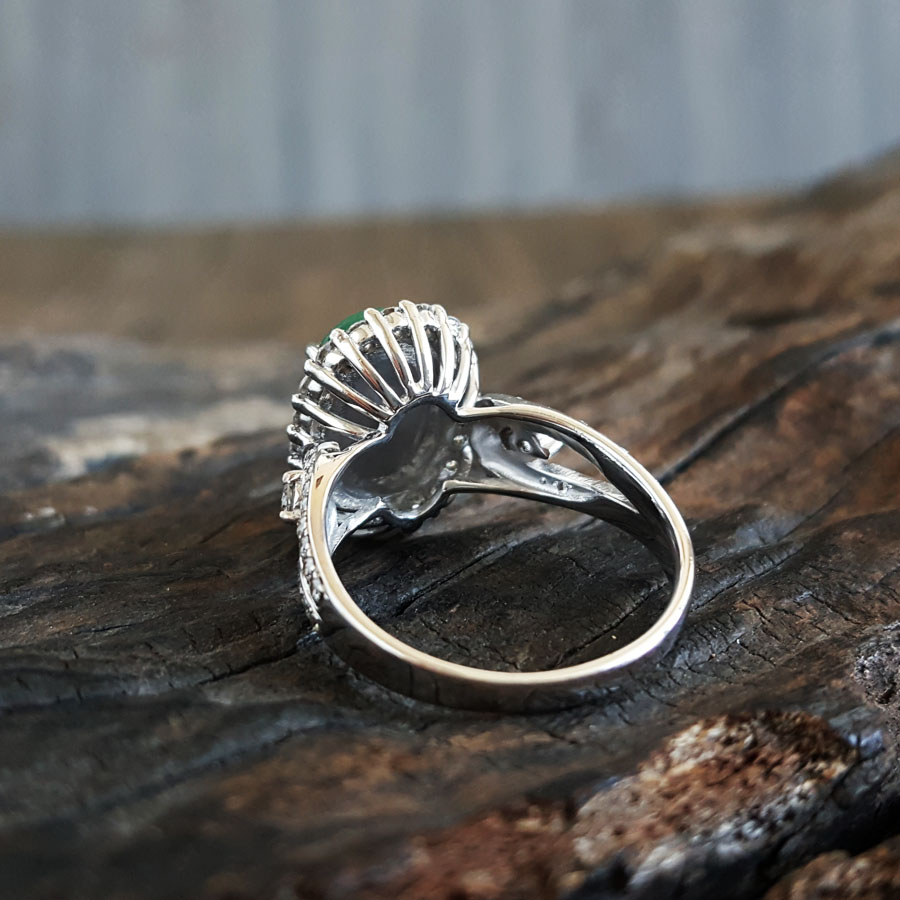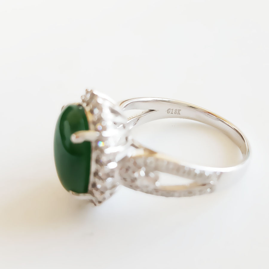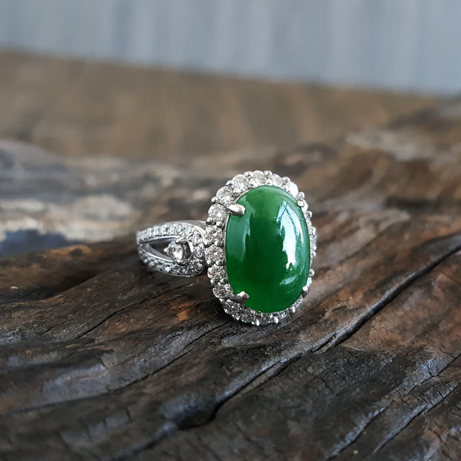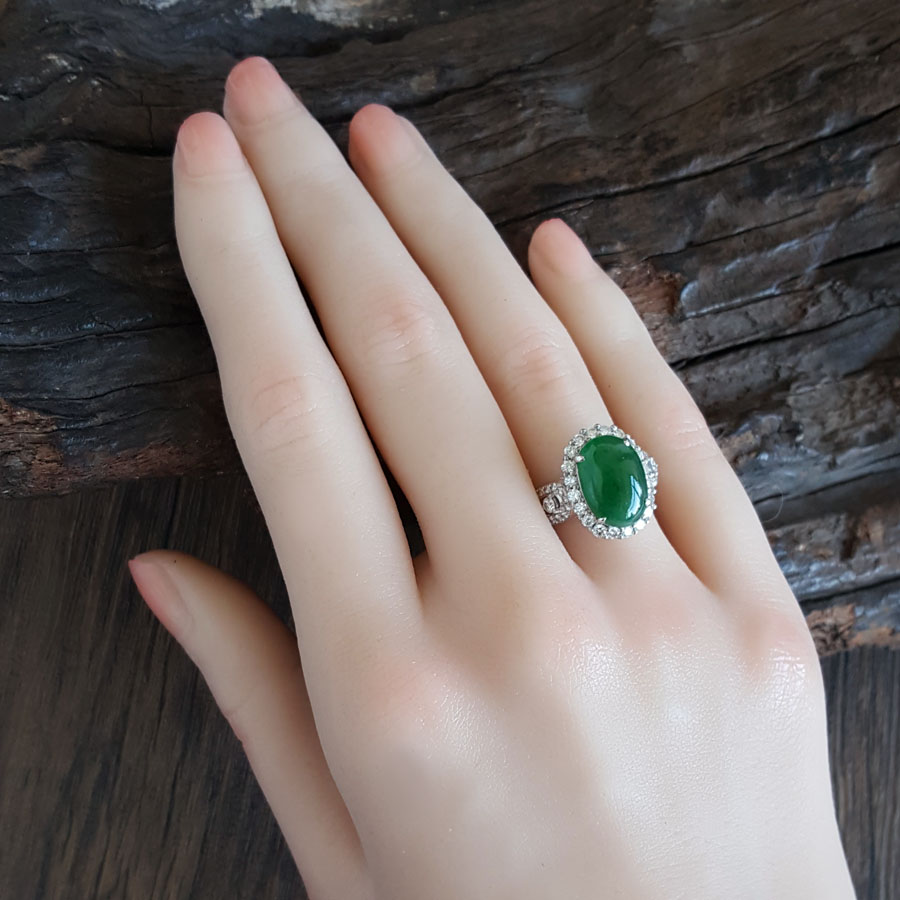 名称 | AU750白金豪镶钻镶天然冰种满绿蛋面翡翠戒指 |