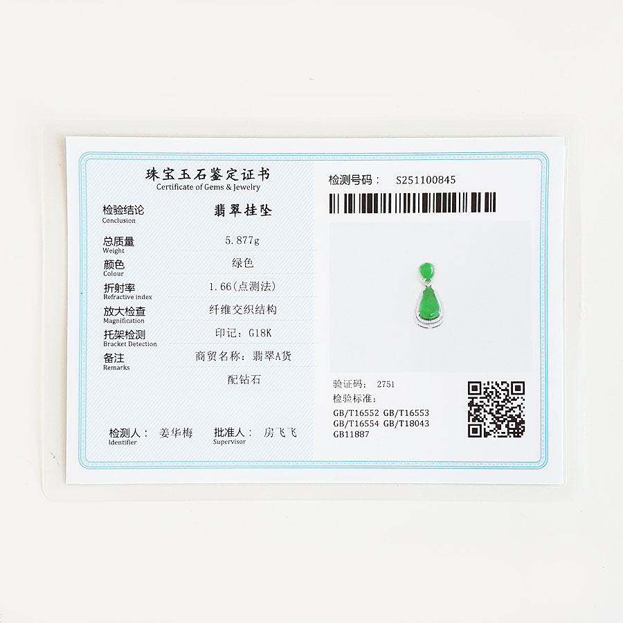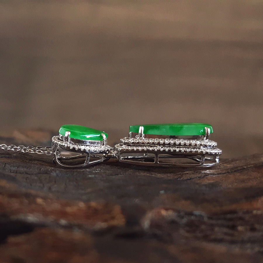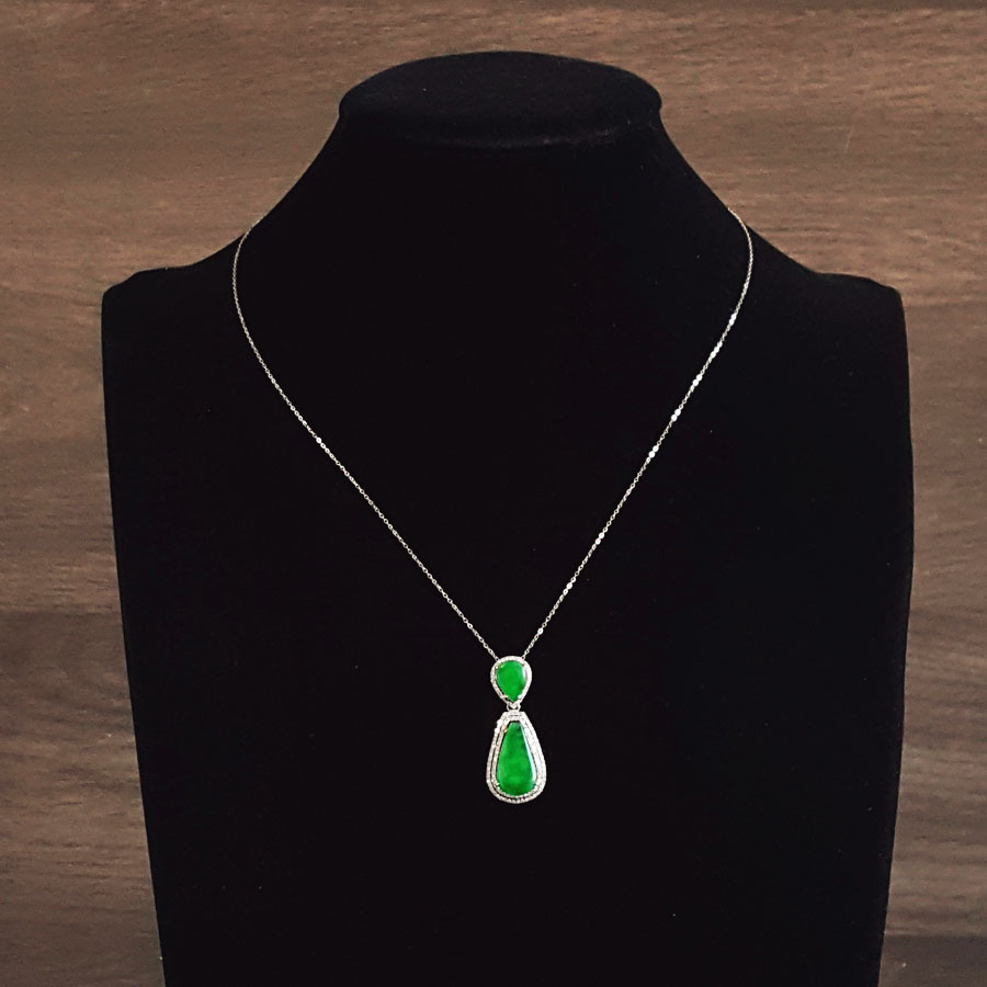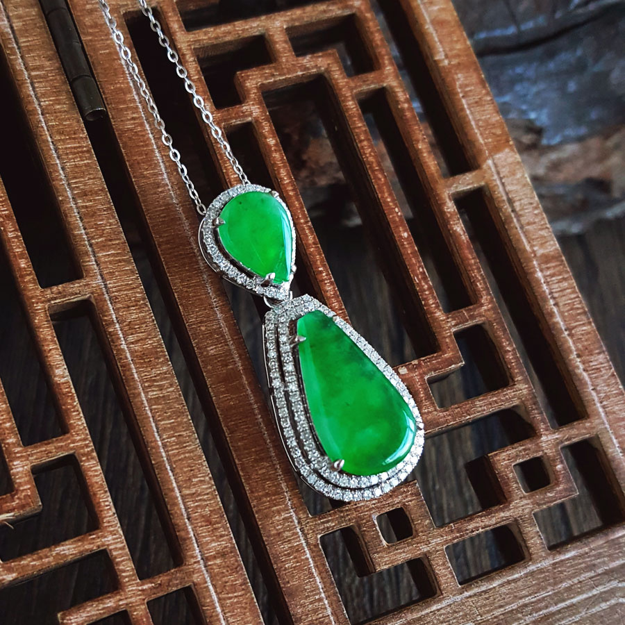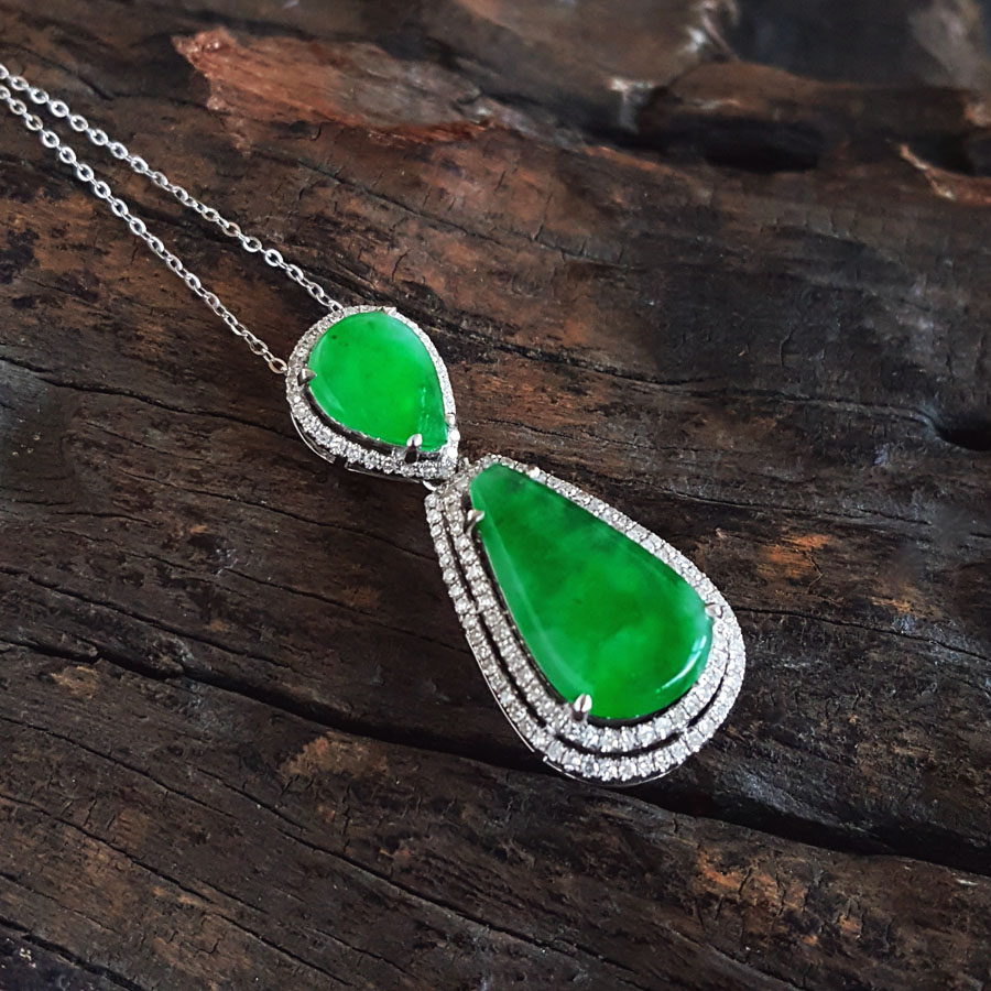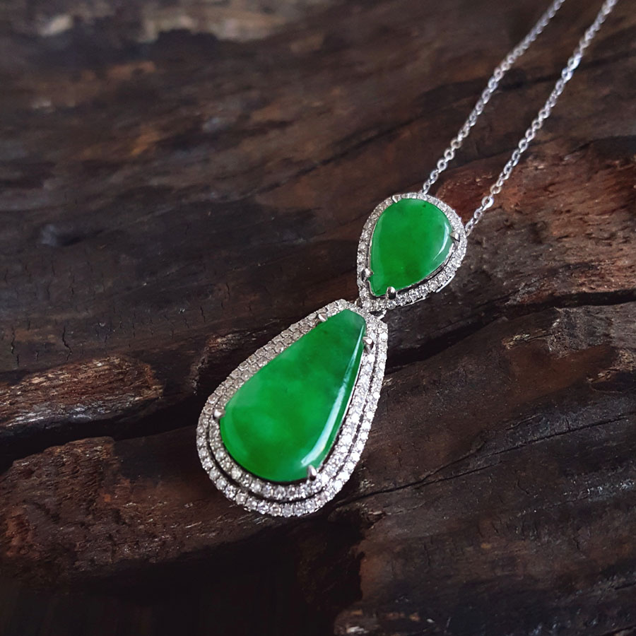 【天然正品】A货翡翠AU750收藏级白金豪镶钻镶天然细腻满绿冰种水滴造型翡翠吊坠项链33.8*13.9*7.9MM(皆取最大值)链长:45CM(长度可调节)女士141125TJ48