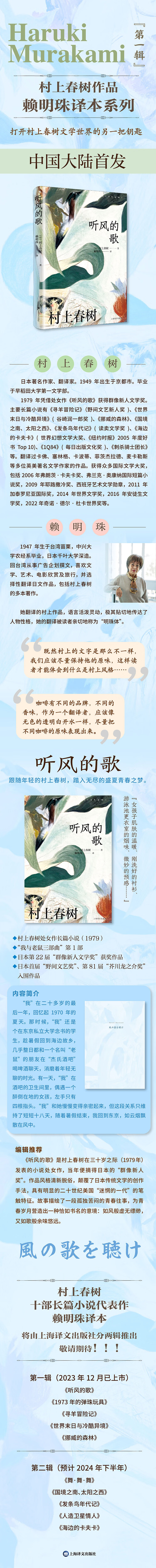 《听风的歌》创作于1979年,是村上春树在三十岁之际发表的小说处女作,当年便摘得日本的“群像新人奖”。作品风格清新脱俗,颠覆了日本传统文学的创作手法,具有明显的二十世纪美国“迷惘的一代”的笔触特征。故事描绘了一段孤独苦闷的青春往事,为青春岁月营造出一种恰如书名的意境:如风般虚无缥缈,又如歌般余味悠远。