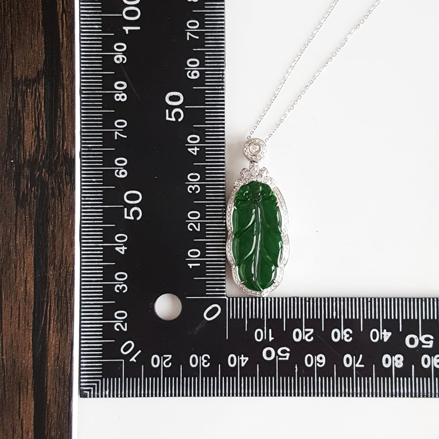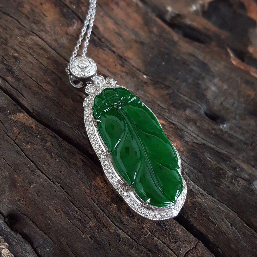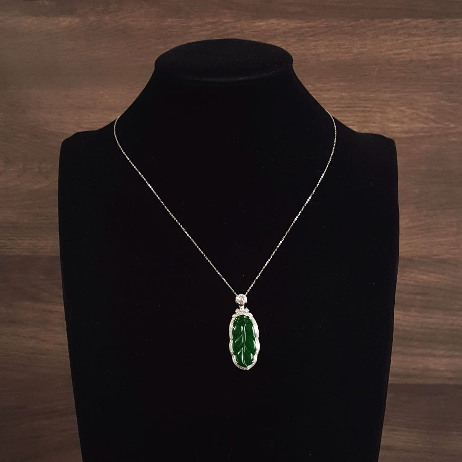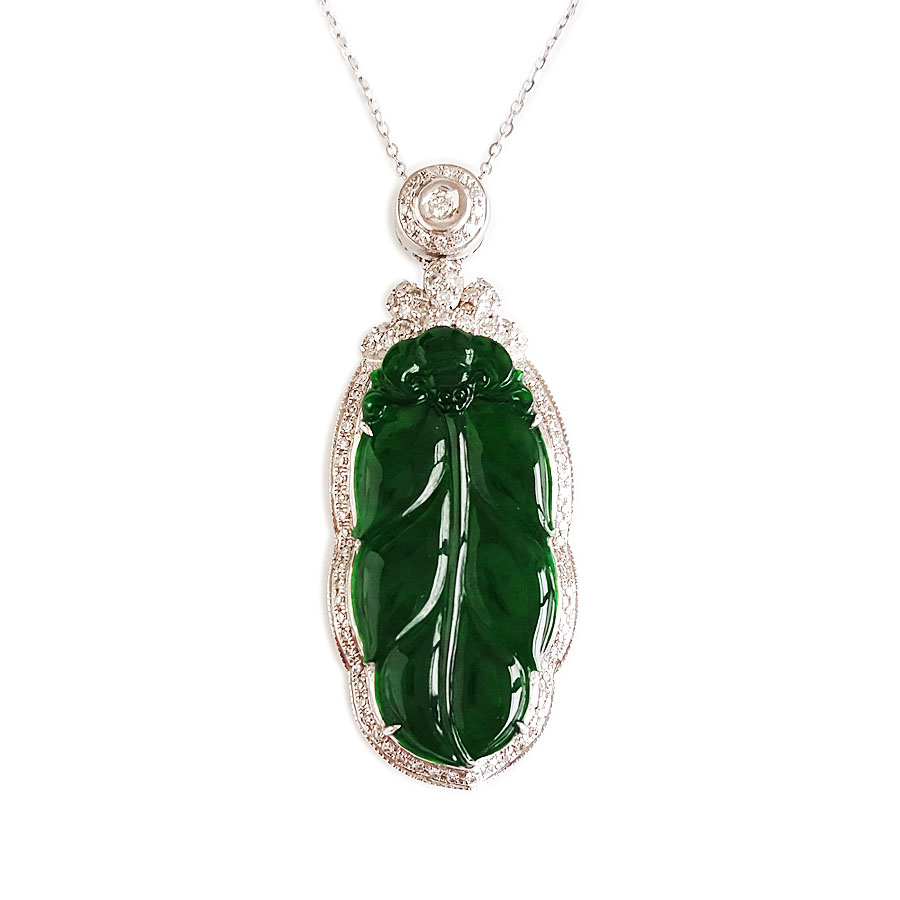 名称 | AU750收藏级白金镶钻镶天然细腻满绿冰种叶子造型(金枝玉叶)翡翠吊坠项链 |