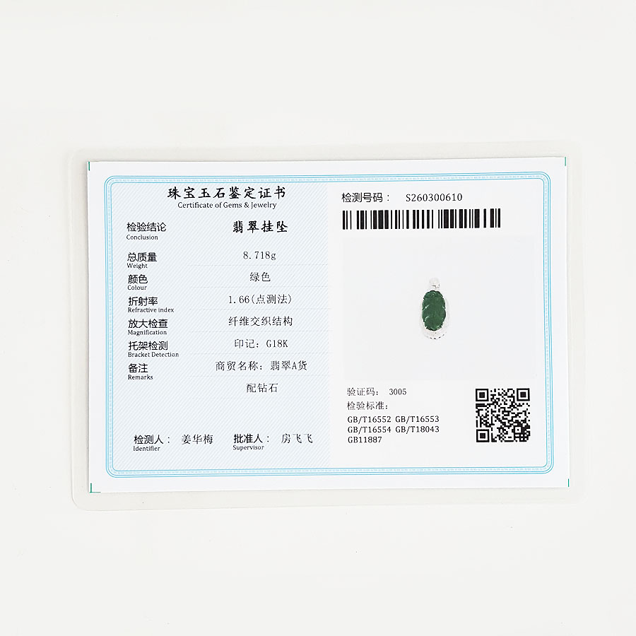【天然正品】A货翡翠AU750收藏级白金镶钻镶天然细腻满绿冰种叶子造型(金枝玉叶)翡翠吊坠项链41.5*16.9*7.8MM(皆取最大值)131125AH21