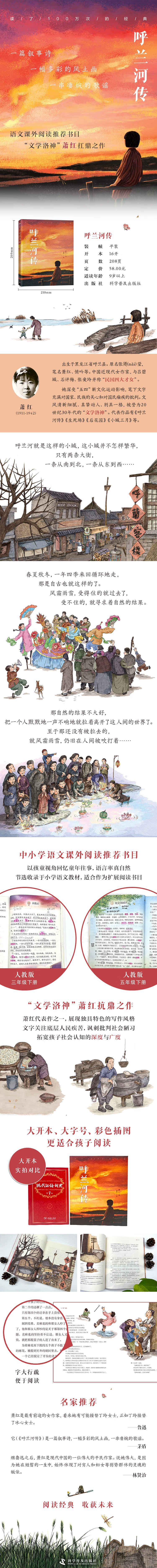 《呼兰河传》是萧红的代表作之一,完成于生命最后两年的病榻之上。全书包括七个章节和一个尾声,介绍了呼兰河这座小城里的风土人情、社会风貌;回忆了“我”和祖父之间的点点滴滴;讲述了发生在团圆媳妇、有二伯、冯歪嘴子身上的故事。文中既蕴含着对故土及祖父的怀念,也有对愚昧无知的人们及封建陋习的讽刺批判。作品引人入胜、意味深长。