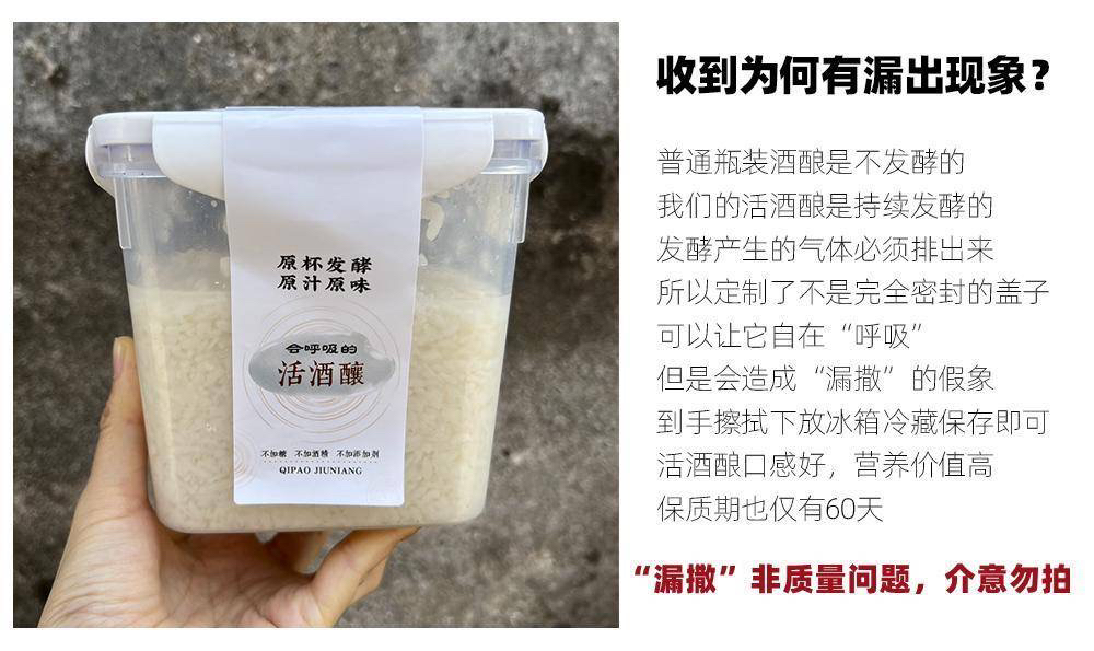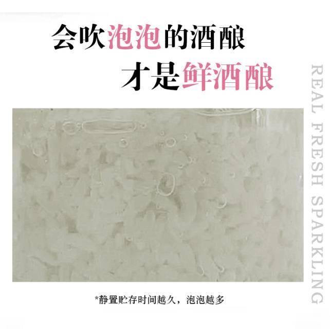 购买须知:跟市面上大多数酒酿不同,我们的酒酿是非高温灭活,含有活性酵母菌,会吐泡泡,所以我们称它为气泡酒酿,同时保留了更多的营养成分!随着时间的延长,口味也会一点点改变,从刚开始甜滋滋的,到后期酒味会越来越浓,泡泡也越来越多。