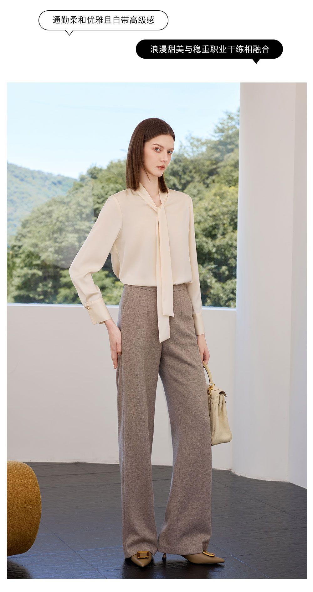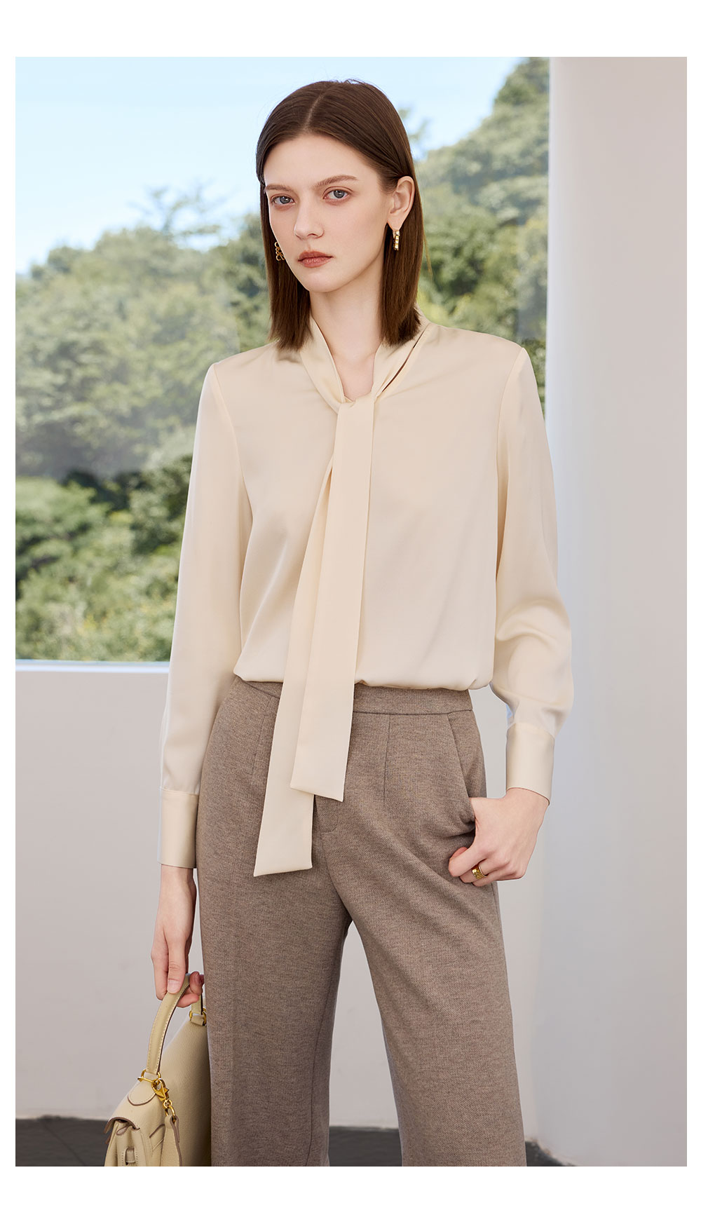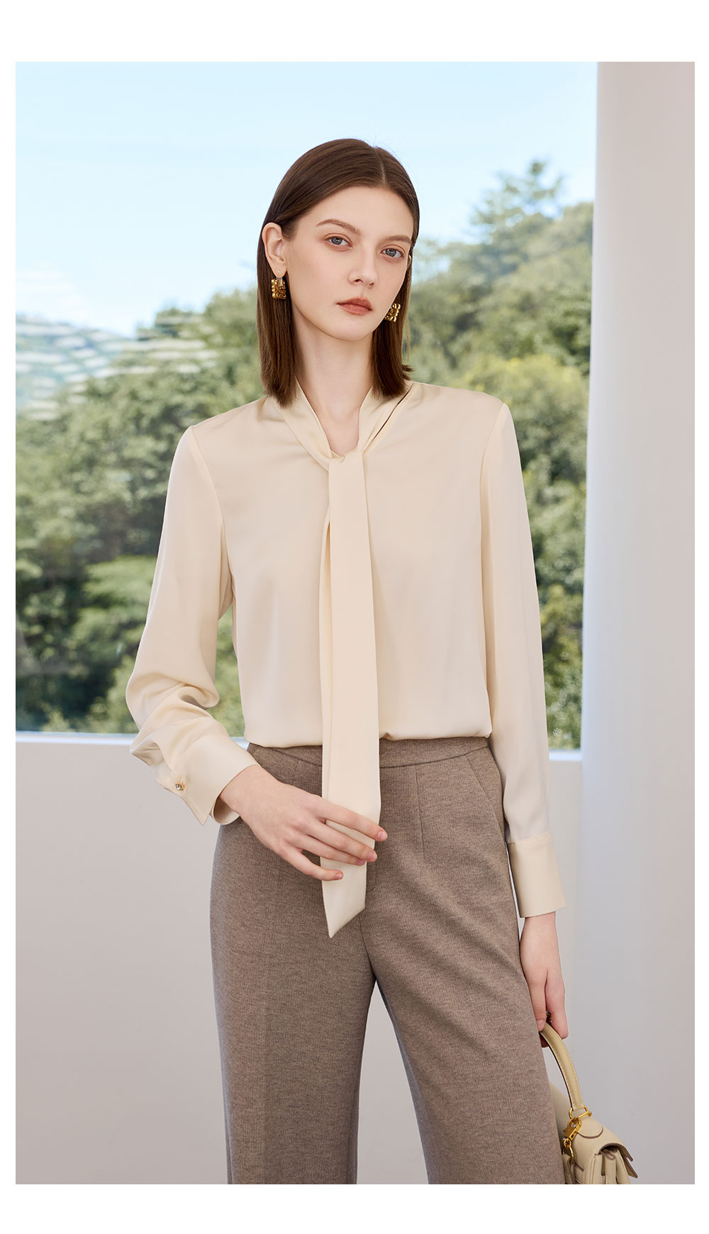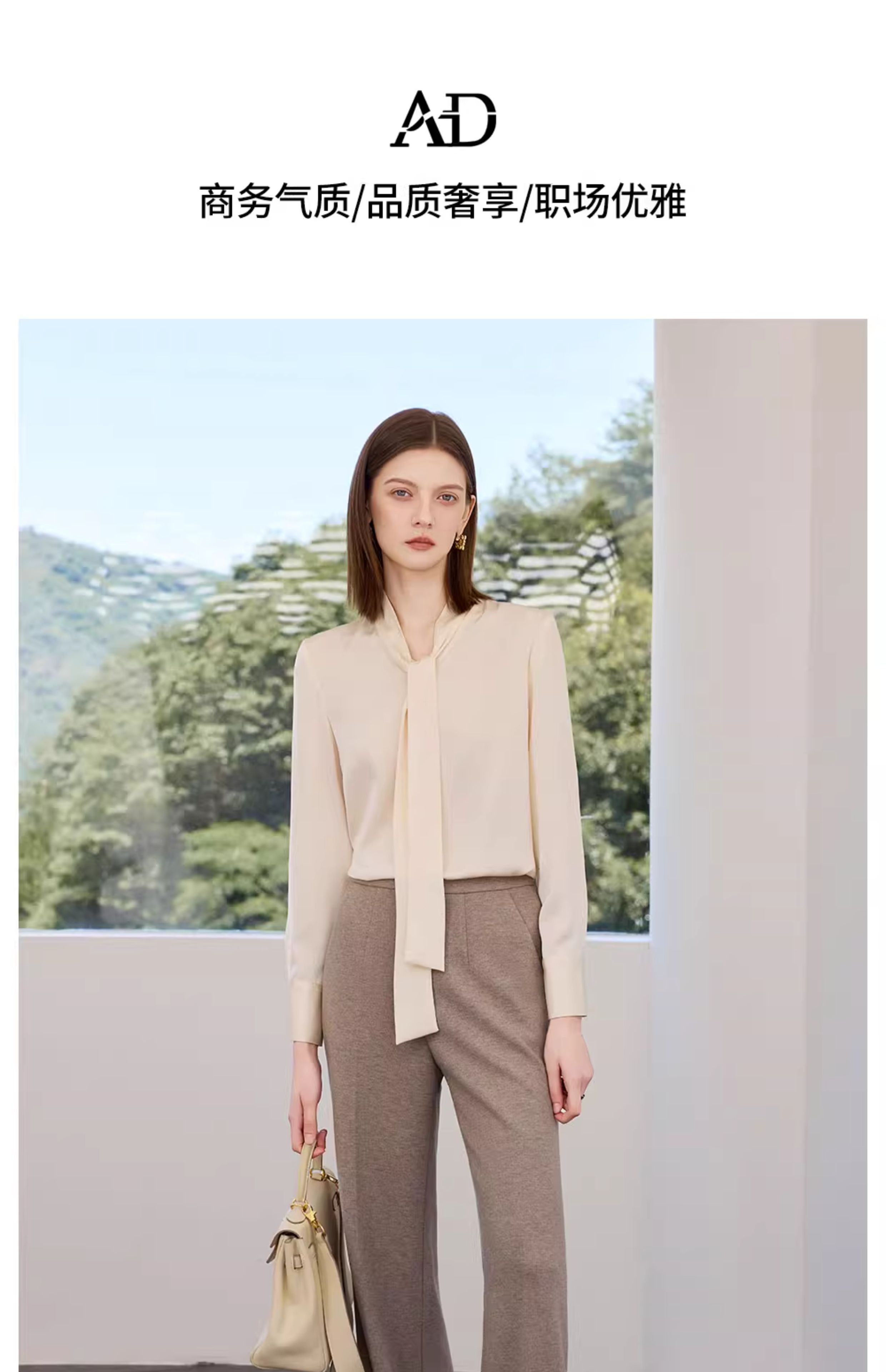 AD香槟色长袖衬衫女气质垂感飘带领上衣2025秋季新款时尚套装裤子