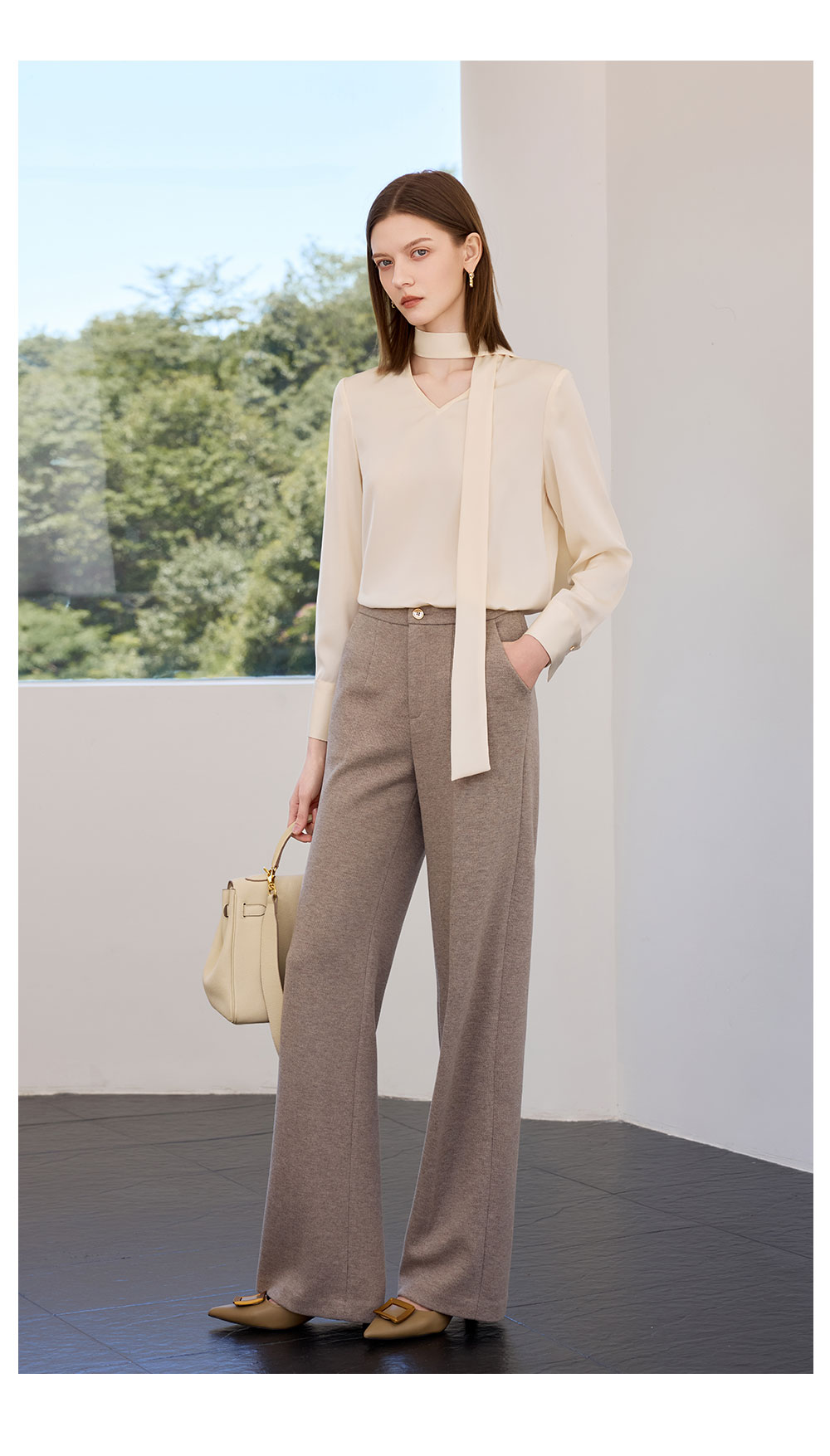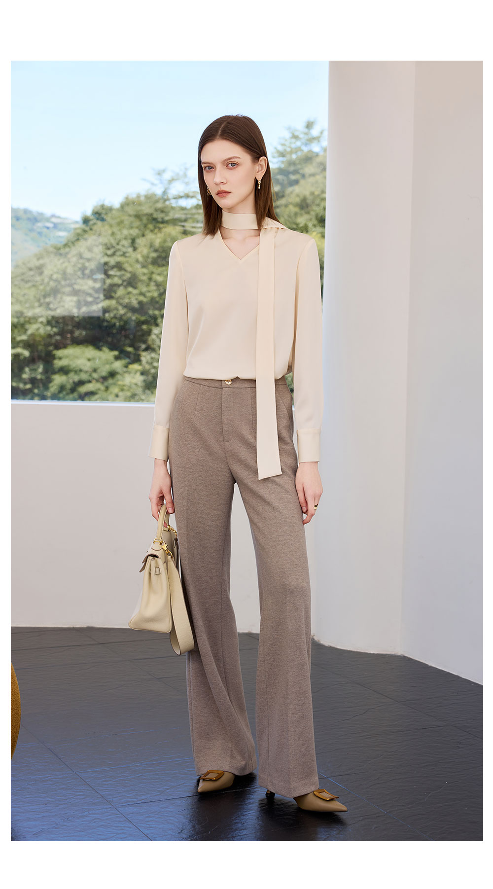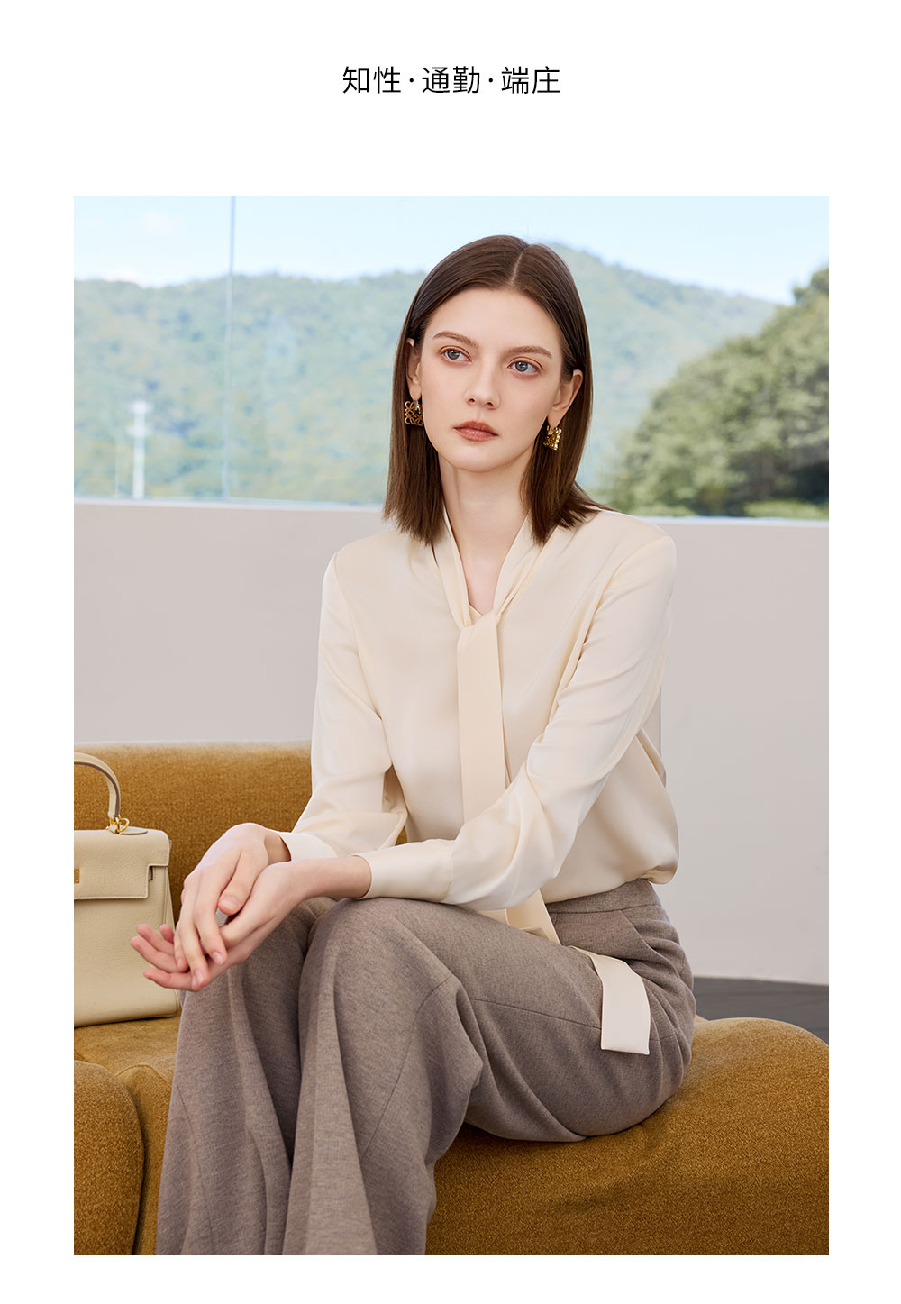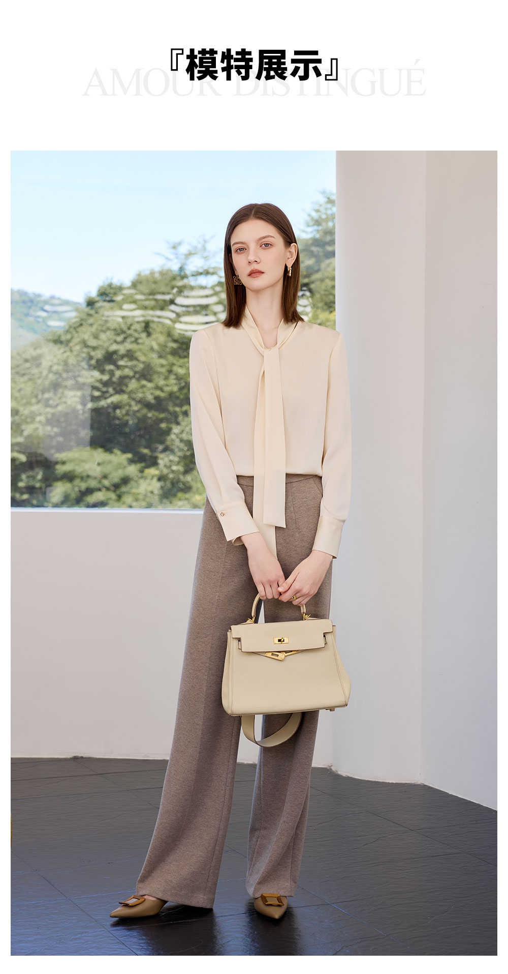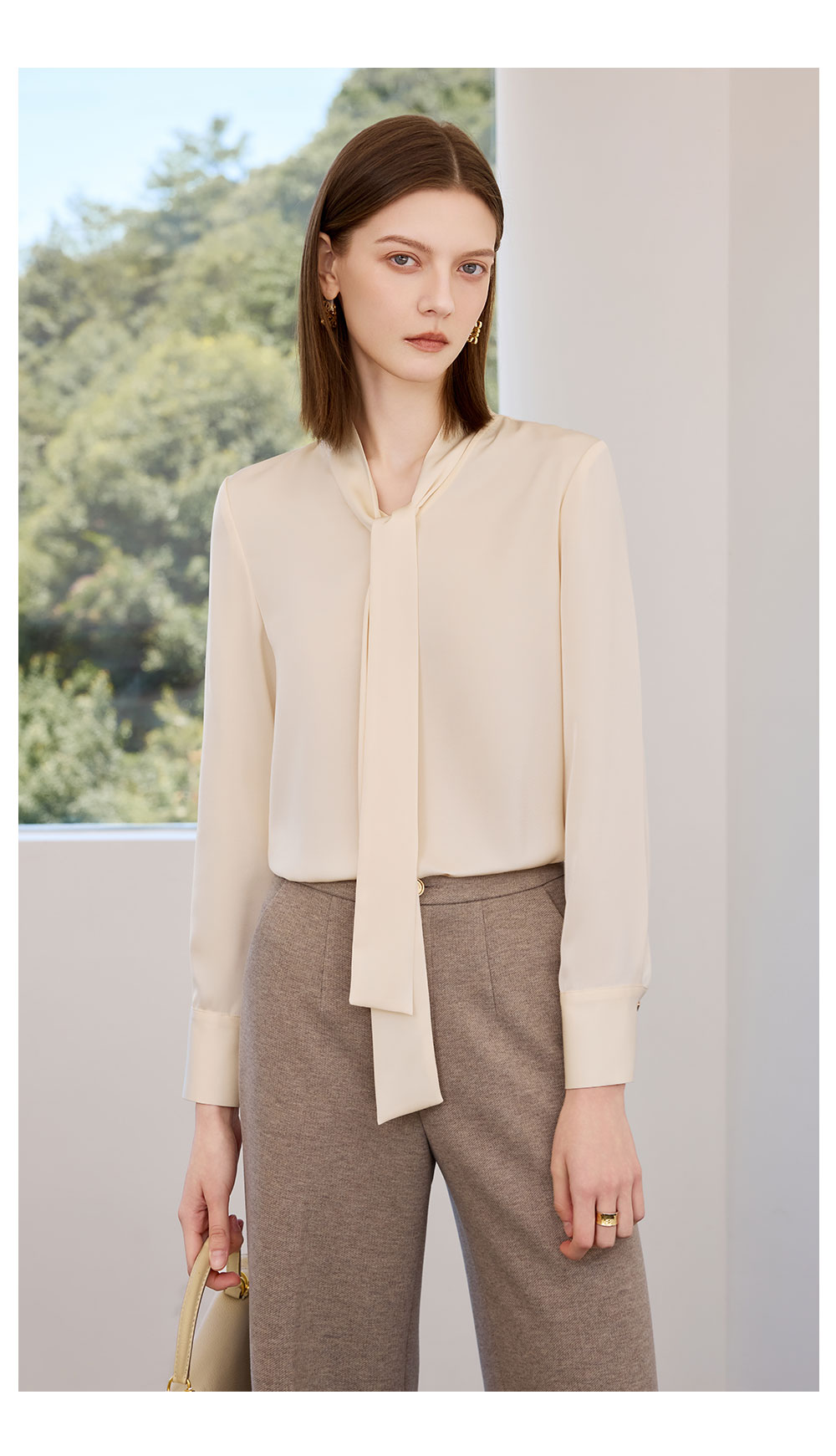 AD香槟色长袖衬衫女气质垂感飘带领上衣2025秋季新款时尚套装裤子