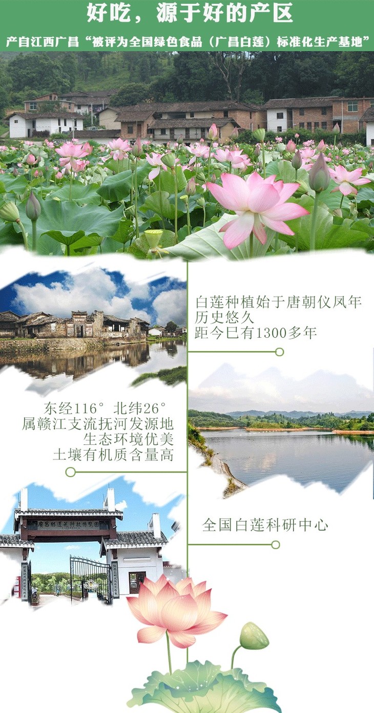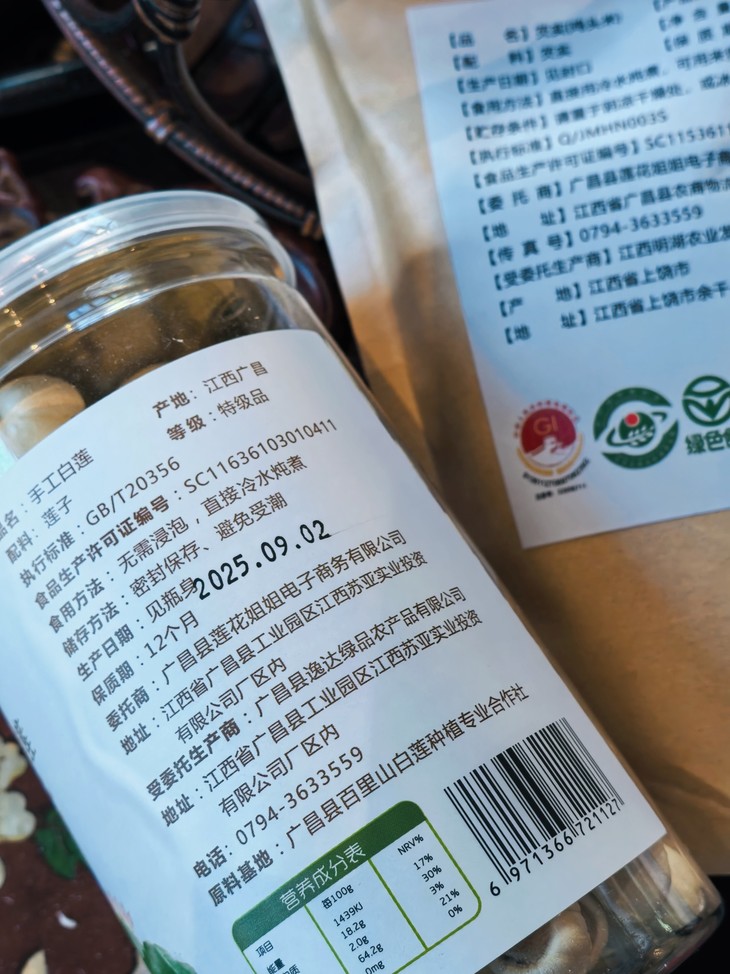 先说说莲子里的佼佼者——广昌白莲。广昌种植白莲的历史,能一直追溯到唐朝仪凤年间,算下来已有1300多年。2008年,广昌白莲生产技艺与习俗还被列入省级非物质文化遗产,这份老手艺在莲农手中代代相传。做广昌白莲从不含糊:清晨采摘带露水的莲蓬,接着手工去蓬、去壳,再仔细剥掉莲子外层的薄膜、抠出莲芯,最后铺在竹匾上晒干——全程不用机器,莲子因此保留得格外完整,个头差不多是机器磨皮莲子的两倍,咬开时满是莲子本身的清甜香气。