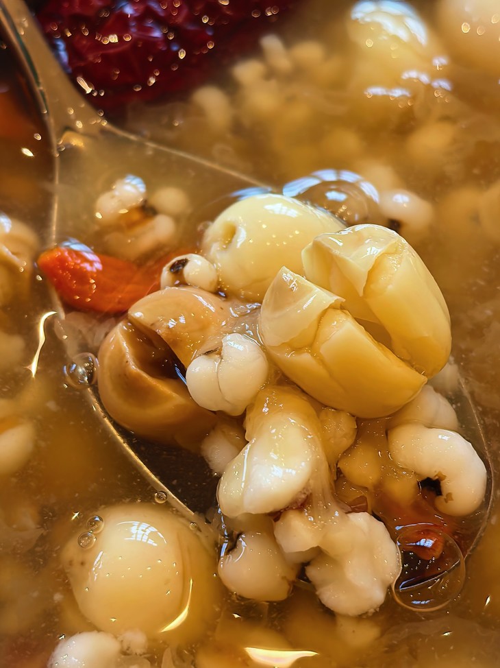 莲子和芡实的吃法简单又多样,不用提前浸泡,直接冷水下锅煮30-40分钟就能变得软糯可口。煮一锅莲子芡实粥,喝着特别暖胃;煲一壶莲子芡实薏米饮当饮品,清盈又袪湿;爱喝茶的话,也可以加入,既能健脾祛湿,还能补气固表;男士要是经常熬夜、心神不宁,或是容易湿热,喝碗莲子芡实汤正合适——毕竟芡实本身还有补肾的作用哦!还可以像我一样,煮碗莲子芡实银耳羹,或是一起煮饭,大人小孩都爱吃,更可以把芡实、莲子搭配茯苓、山药做成四神汤,或是一起打成豆浆。。。不管哪种吃法,都能轻松把莲子和芡实融进日常!