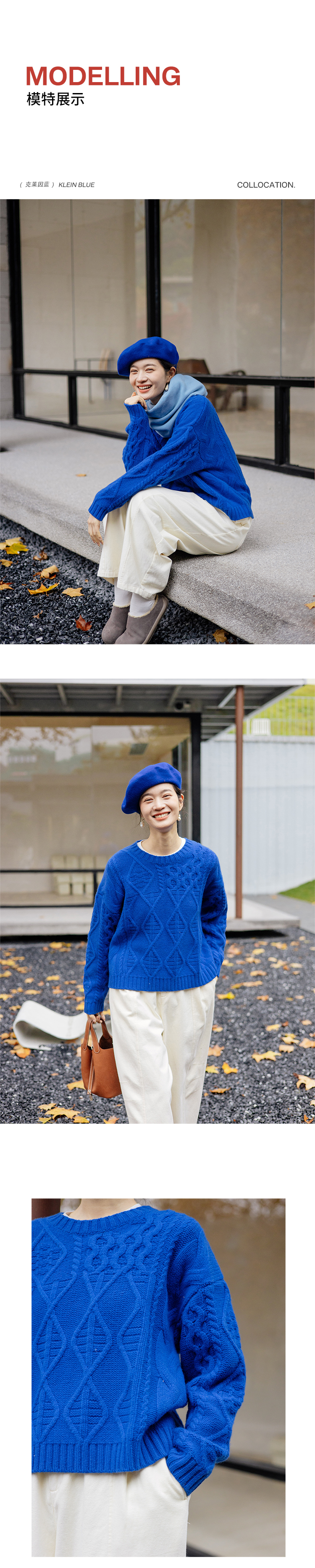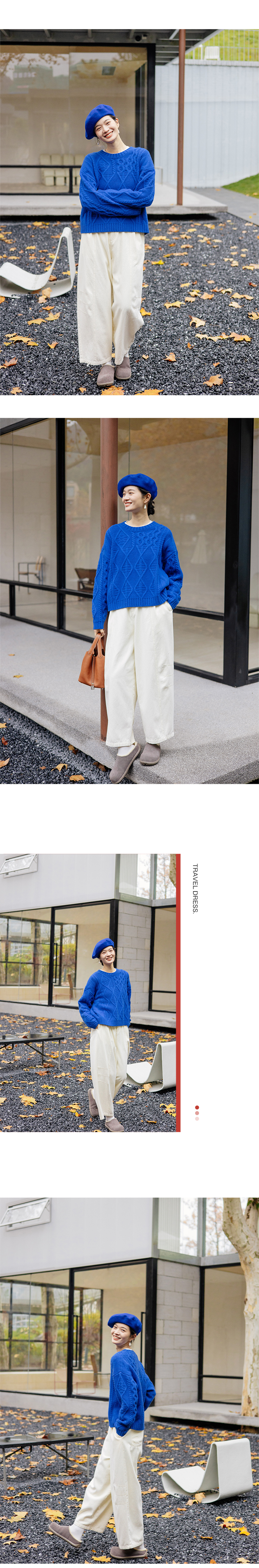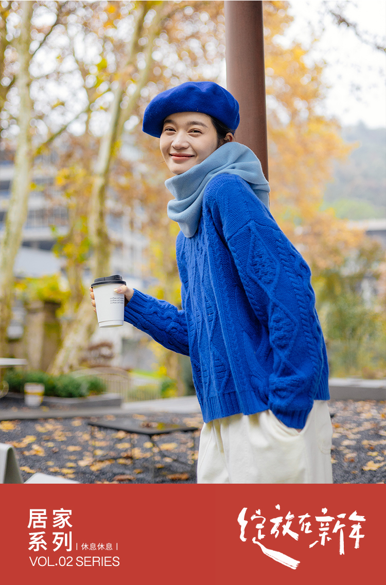 绽放011朵/100羊毛绞花针织上衣女复古棒针落肩慵懒蓝色套头毛衣