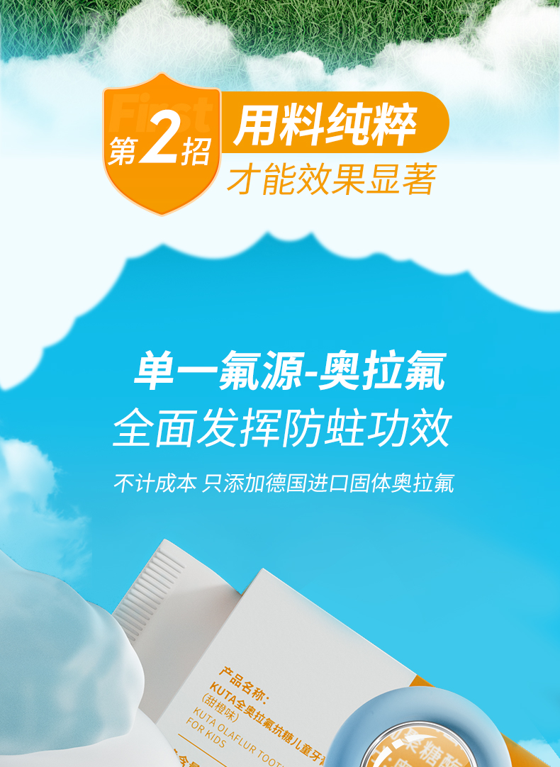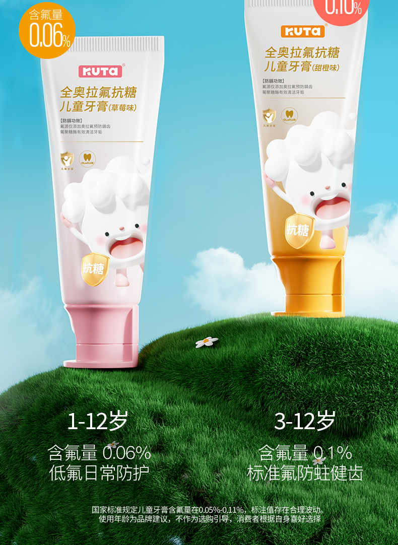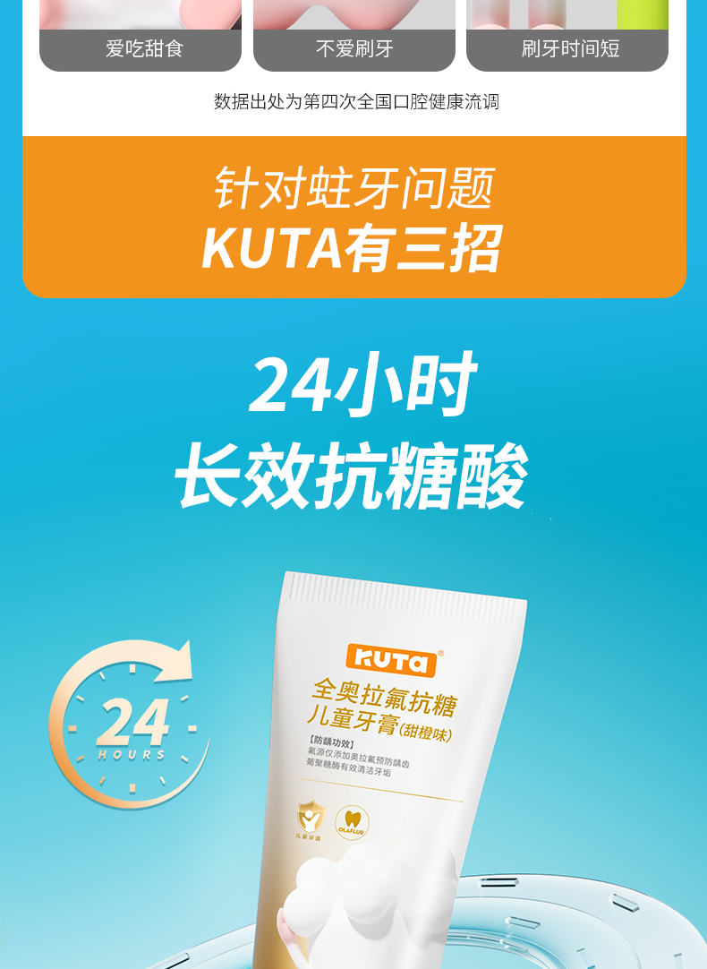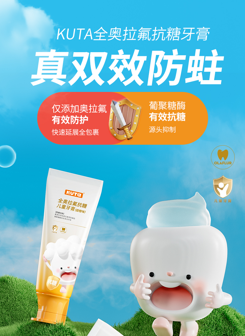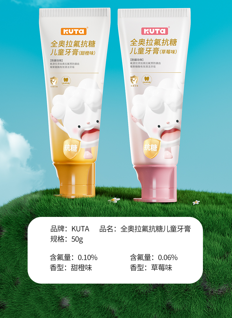 KUTA儿童奥拉氟牙膏抗糖(阳光甜橙味/草莓味)含氟牙膏50g/支儿童牙膏3岁-6岁-12岁适用