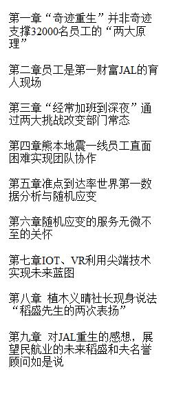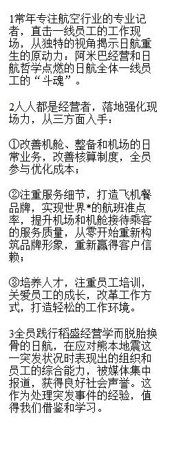 在经历了2010年的破产之后,日本航空浴火重生,实现成功逆袭。它是如何做到的呢?作者深入日航集团一年,采访100多人之后总结到就是阿米巴模式和意识改革两大措施激发起了奋斗在*线的员工的“燃烧的斗魂”。本书真实再现了经历了意识改革后的员工群力群策,身体力行对机舱、维护、机场等现场日常业务重新进行成本优化,守护遭遇危难的公司,为了构筑企业信誉,重新审视自身服务,提升机场和机舱乘务人员的服务水平,努力实现准点航班和改善机内餐饮等,不断提升服务品质。员工们在工作现场打磨工作能力,提升业务品质,支撑起了日航发展的脊梁。作者特别采访了稻盛先生,道出了日航破产后持续发展的秘密和未来企业的竞争力。可以说,这是一本详细记录稻盛和夫的影响下,日航不同岗位的员工如何精益求精的手册,是值得每一致力于提高自己的人的指导手册。