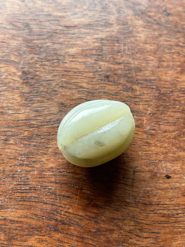 这是两粒和田白玉珠,一粒白玉瓜棱橄榄珠与白玉圆珠,橄榄形瓜棱珠色泽青灰白局部带黑沁,圆珠正圆直径逾十五毫米,玉质细腻油润,质地坚硬比重大,色泽纯白略青,珠型典雅贵气,两粒皆精致细腻、玉表旧时代琢磨精准细致,数百年包浆皮壳温润渾厚。