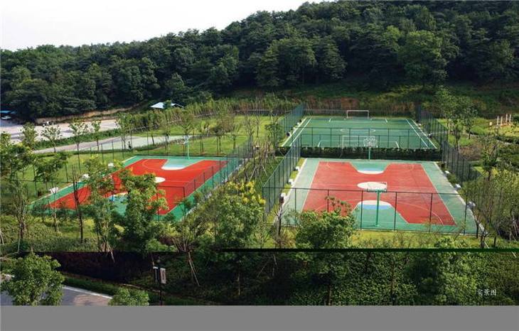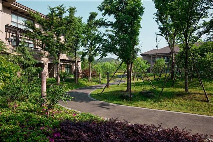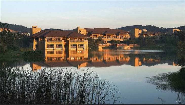 古朴典雅的庭院式建筑,环绕在丘陵绿地、湿地湖泊中