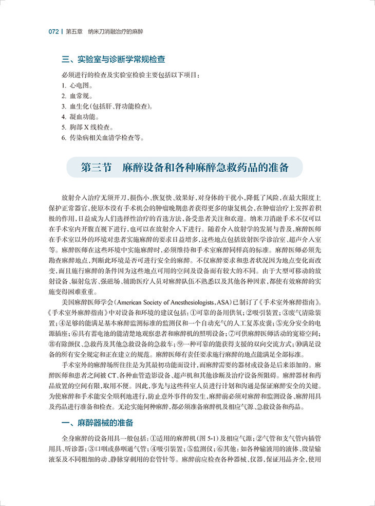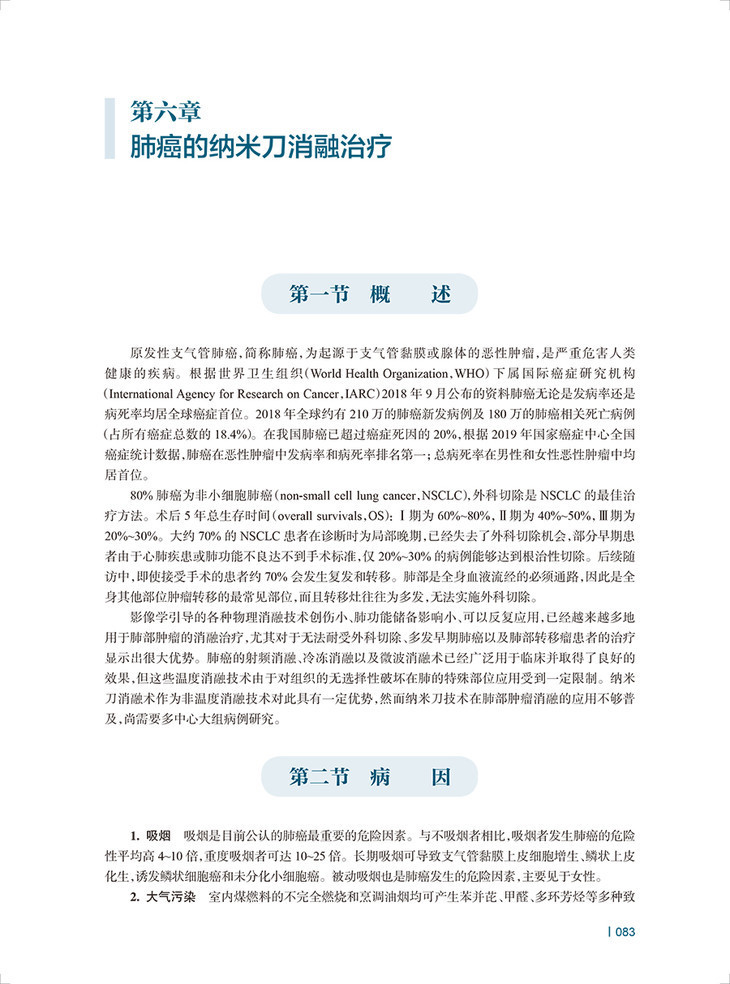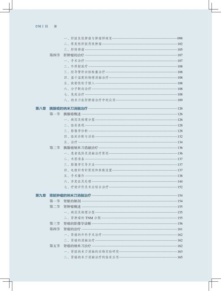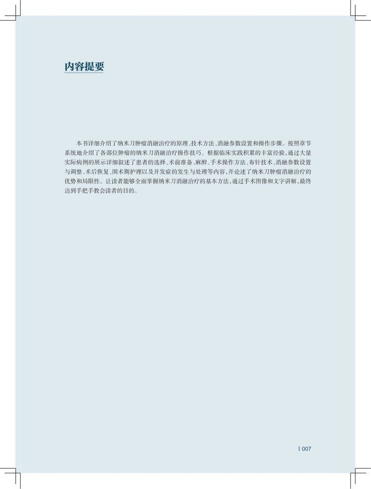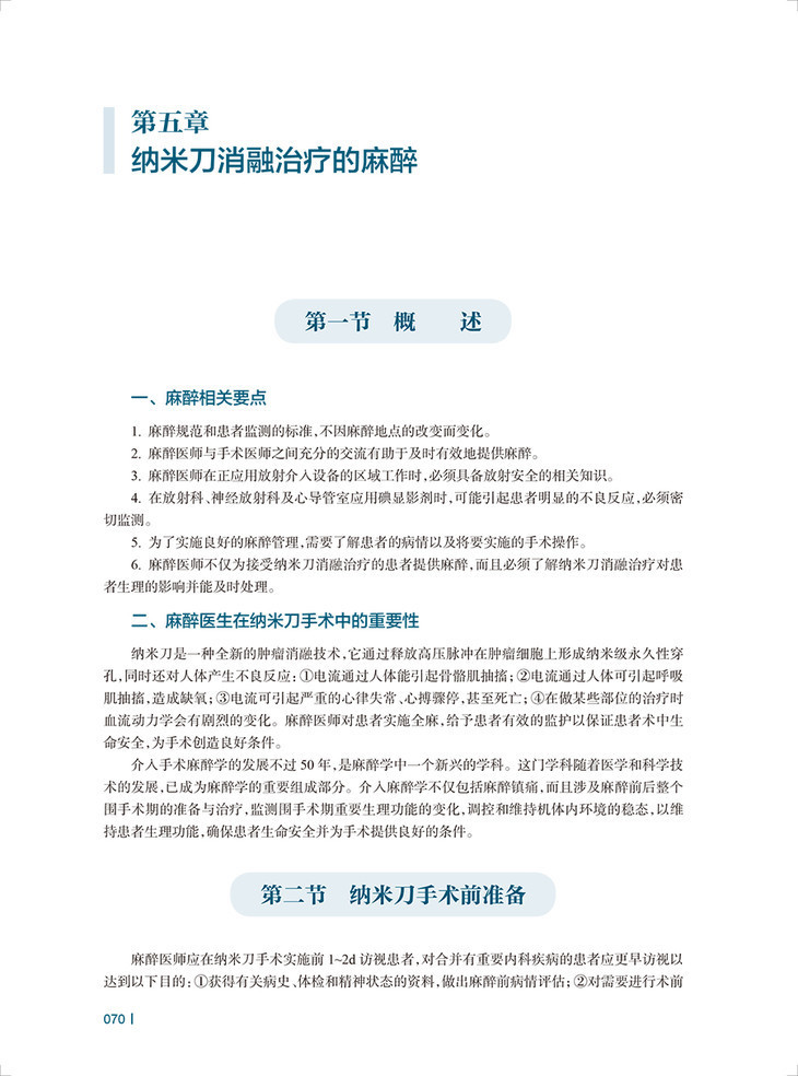 本书详细介绍了纳米刀肿瘤消融的原理、技术方法、消融参数设置和操作步骤。按照章节系统地介绍了各部位肿瘤的纳米刀消融操作技巧。根据临床实践积累的丰富经验,通过大量实际病例的展示详细叙述了患者的选择、术前准备、麻醉、手术操作方法、布针技术、消融参数设置与调整、术后恢复、围术期护理以及并发症的发生与处理等方面,并论述了纳米刀肿瘤消融的优势和局限性。让读者能够全面掌握纳米刀消融治疗的基本方法,通过手术图像和文字讲解,最终达到手把手教会读者的目的。