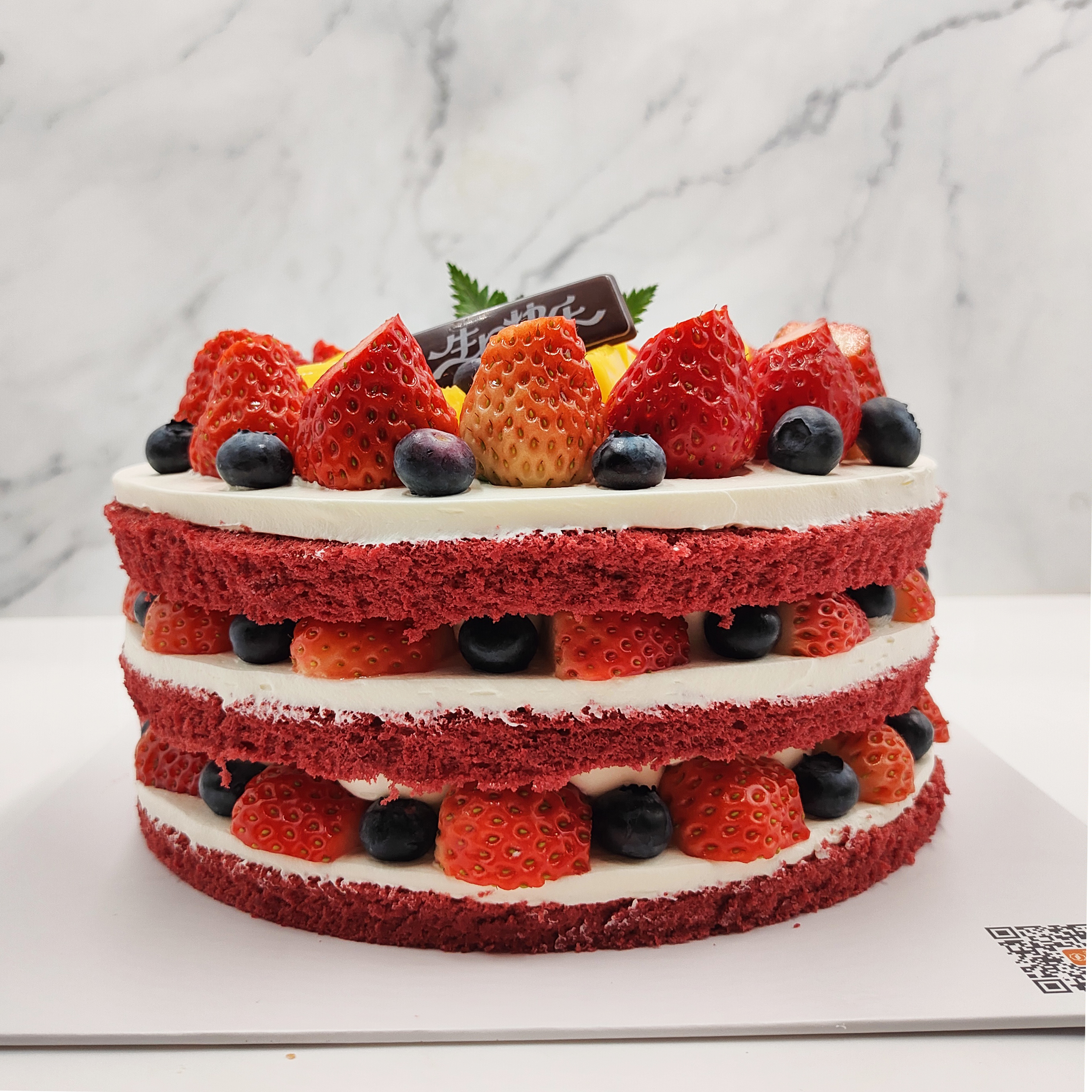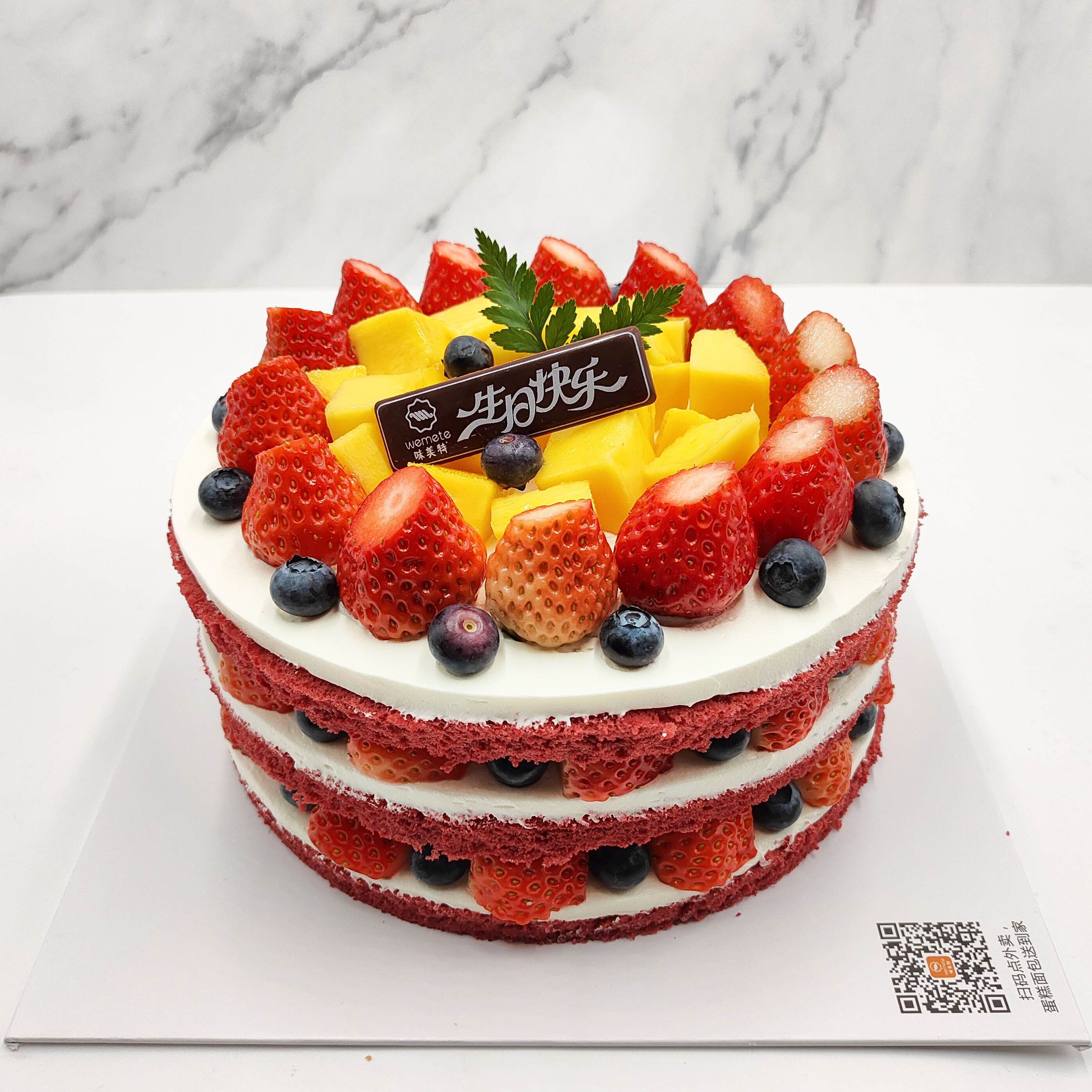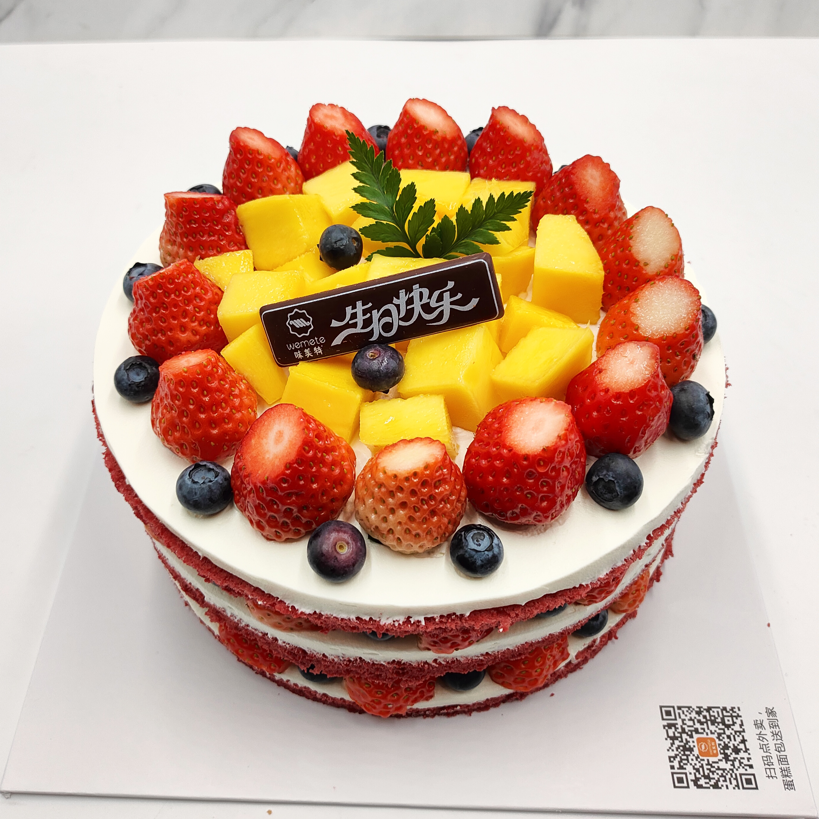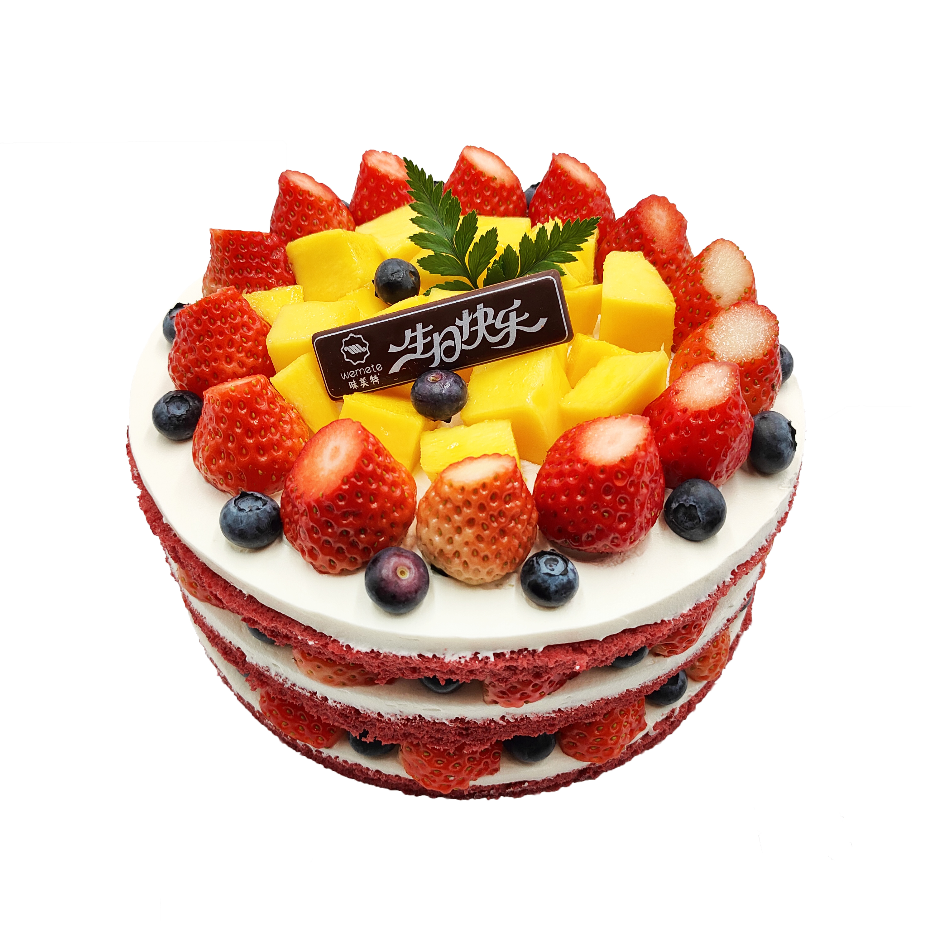 味美特“红颜知己”草莓红丝绒水果蛋糕,草莓,芒果进行主要搭配,蓝莓进行点缀装饰-此款蛋糕不可做6英寸