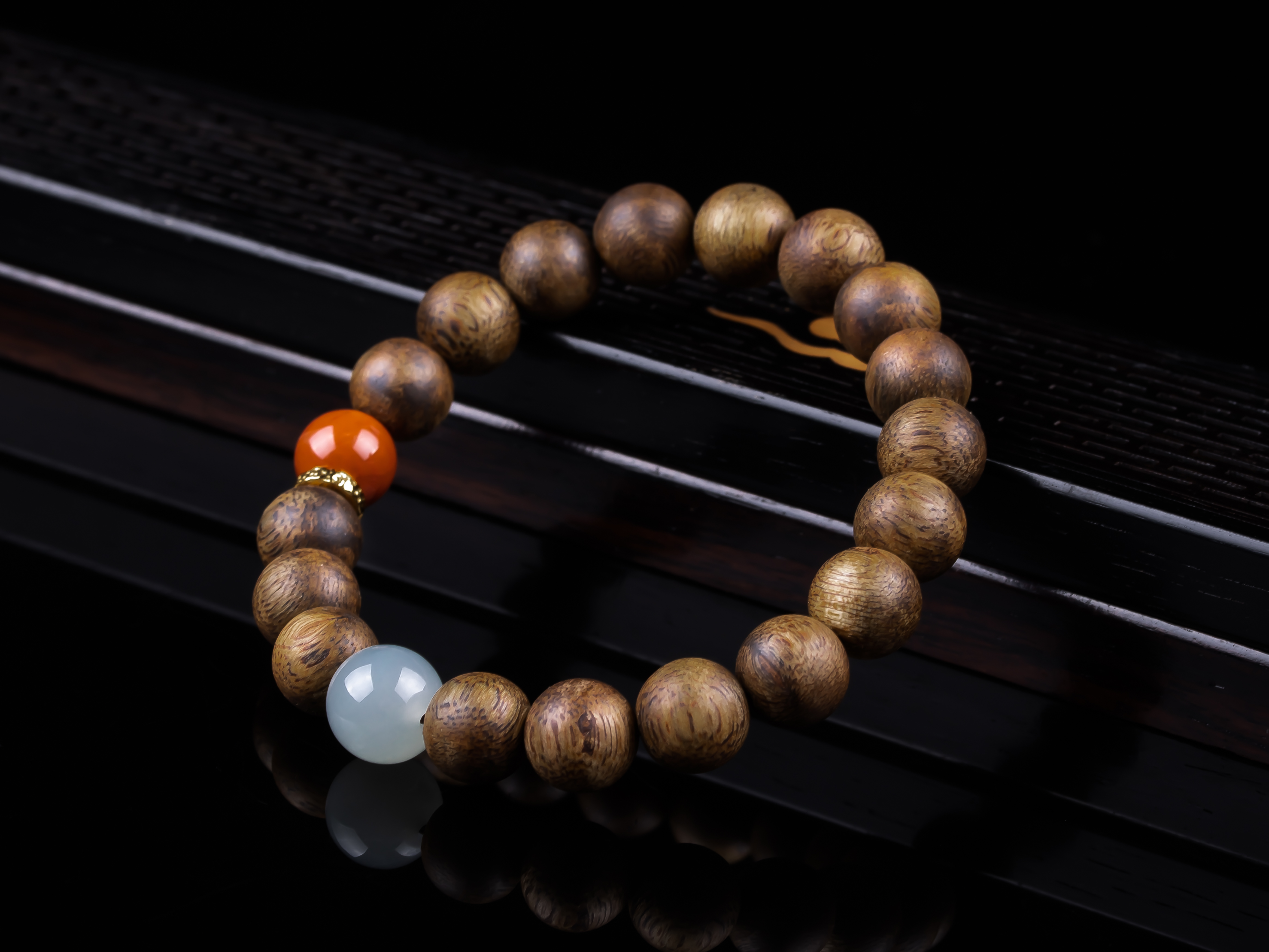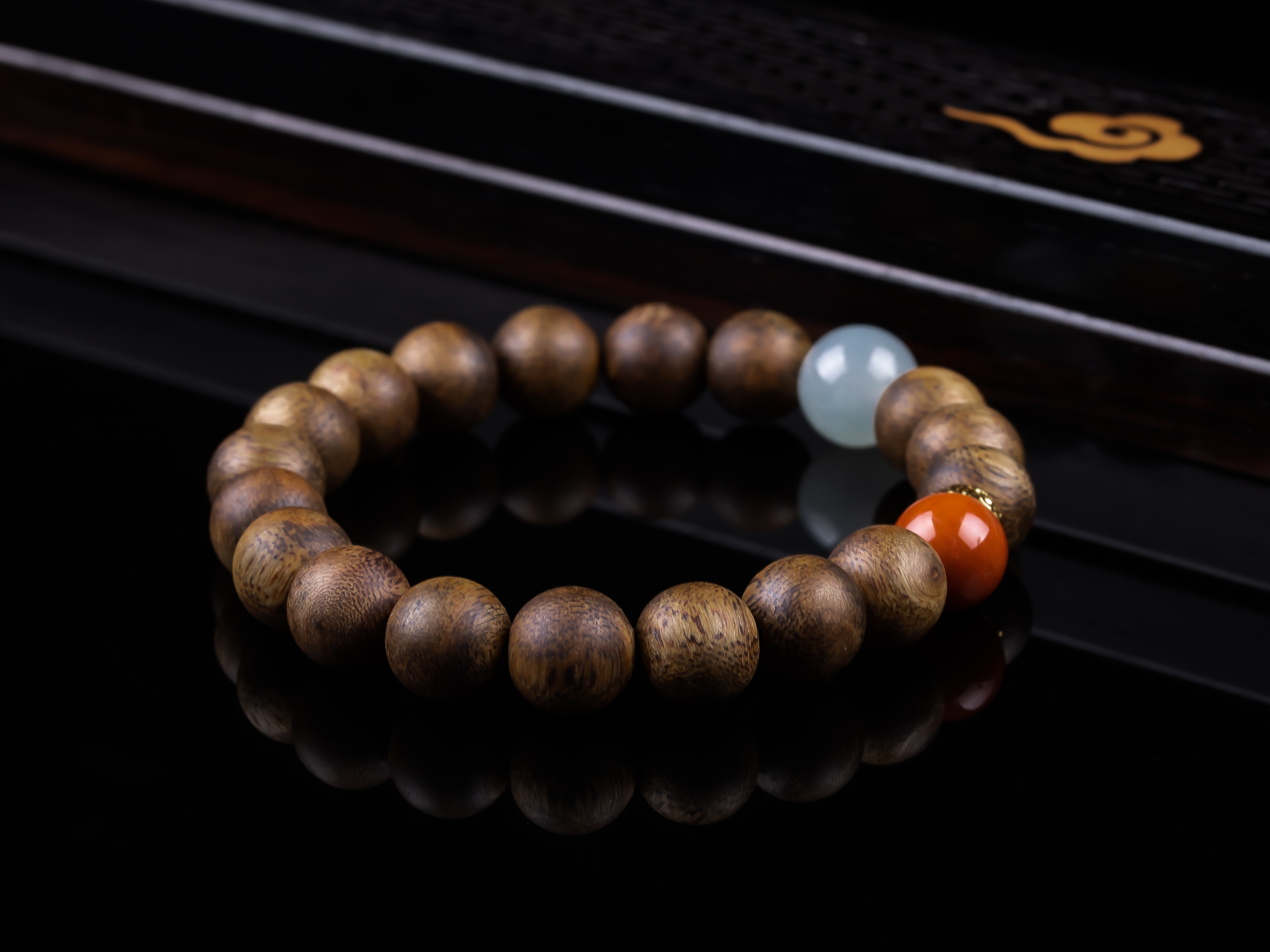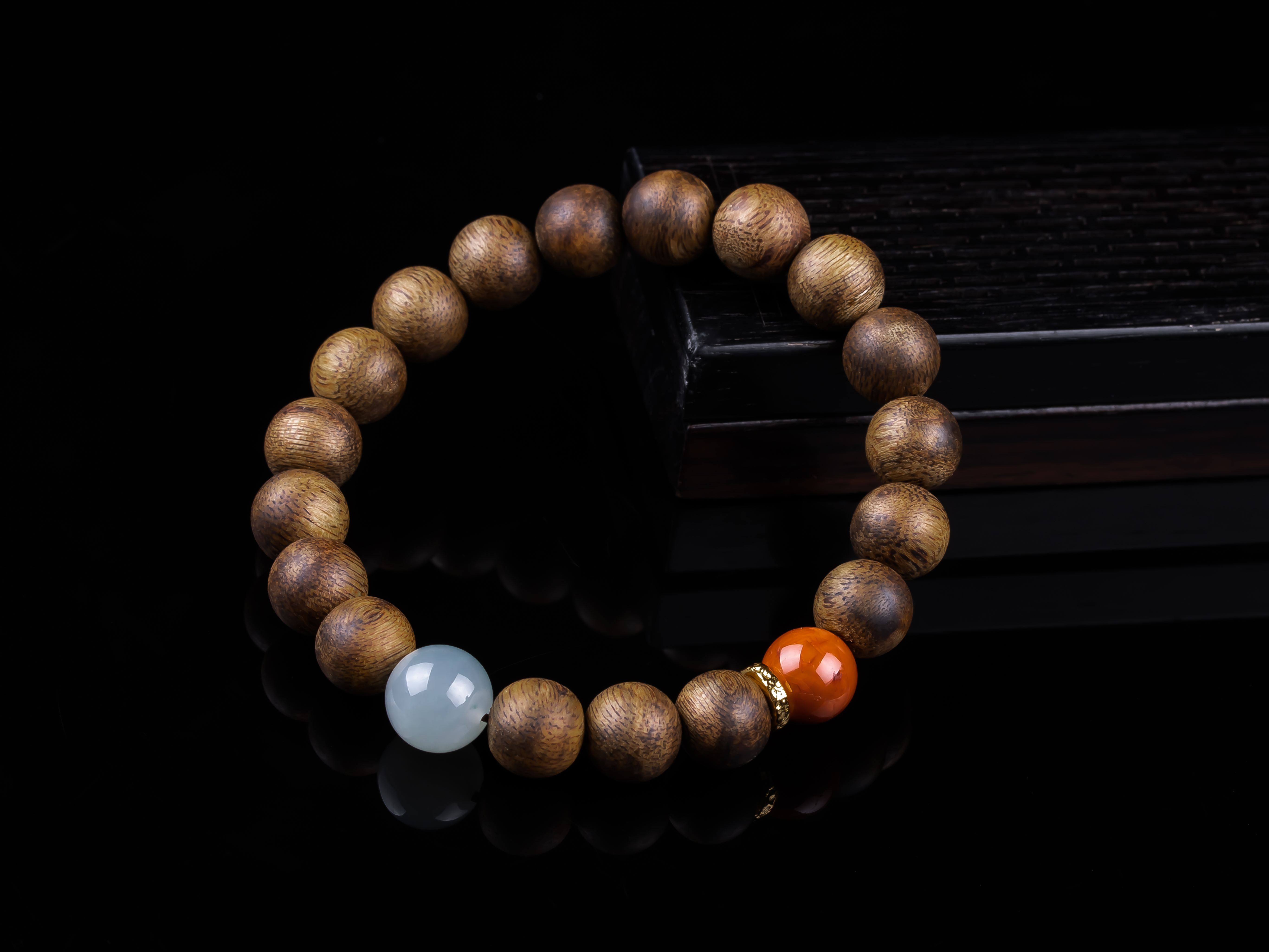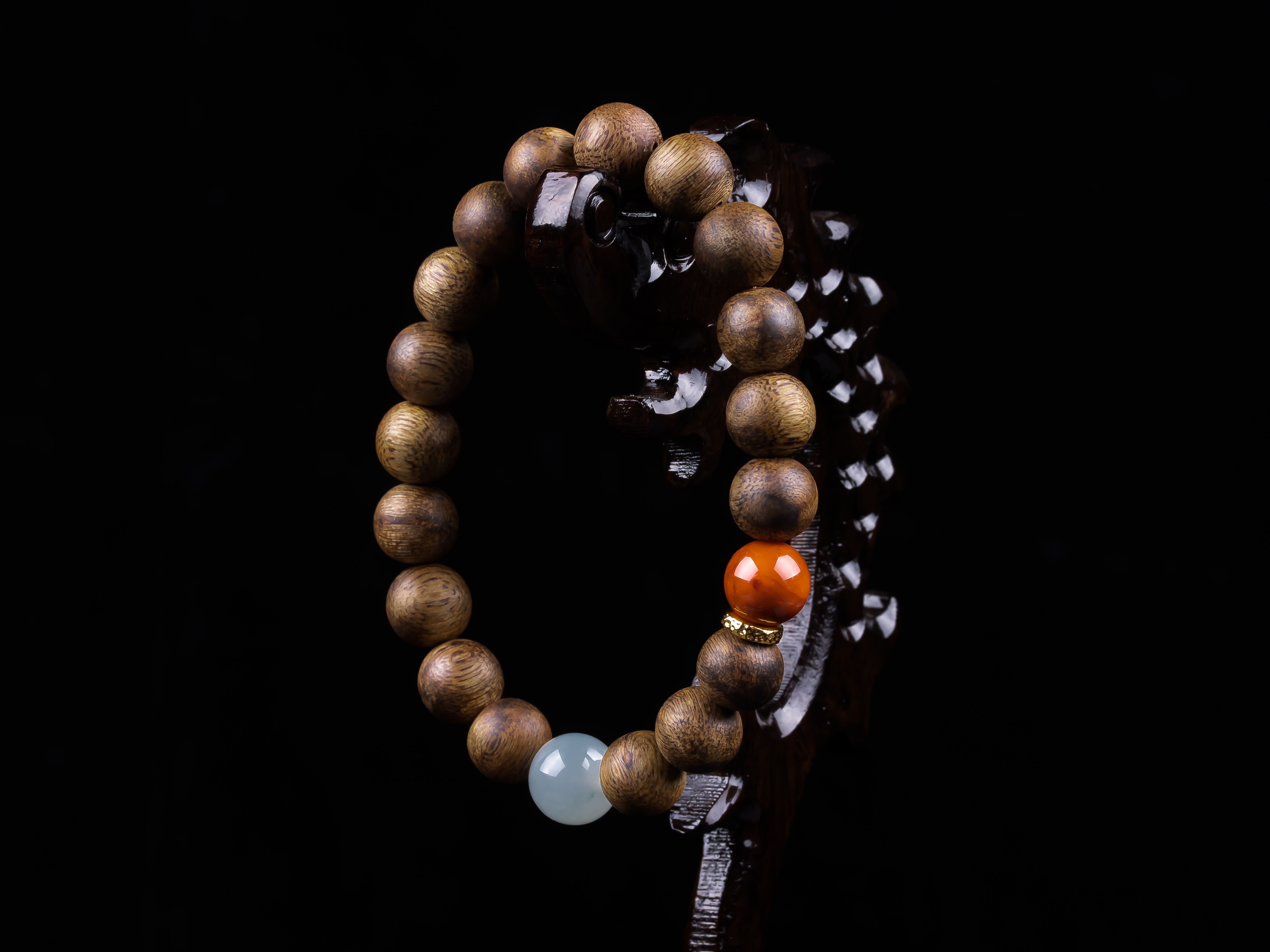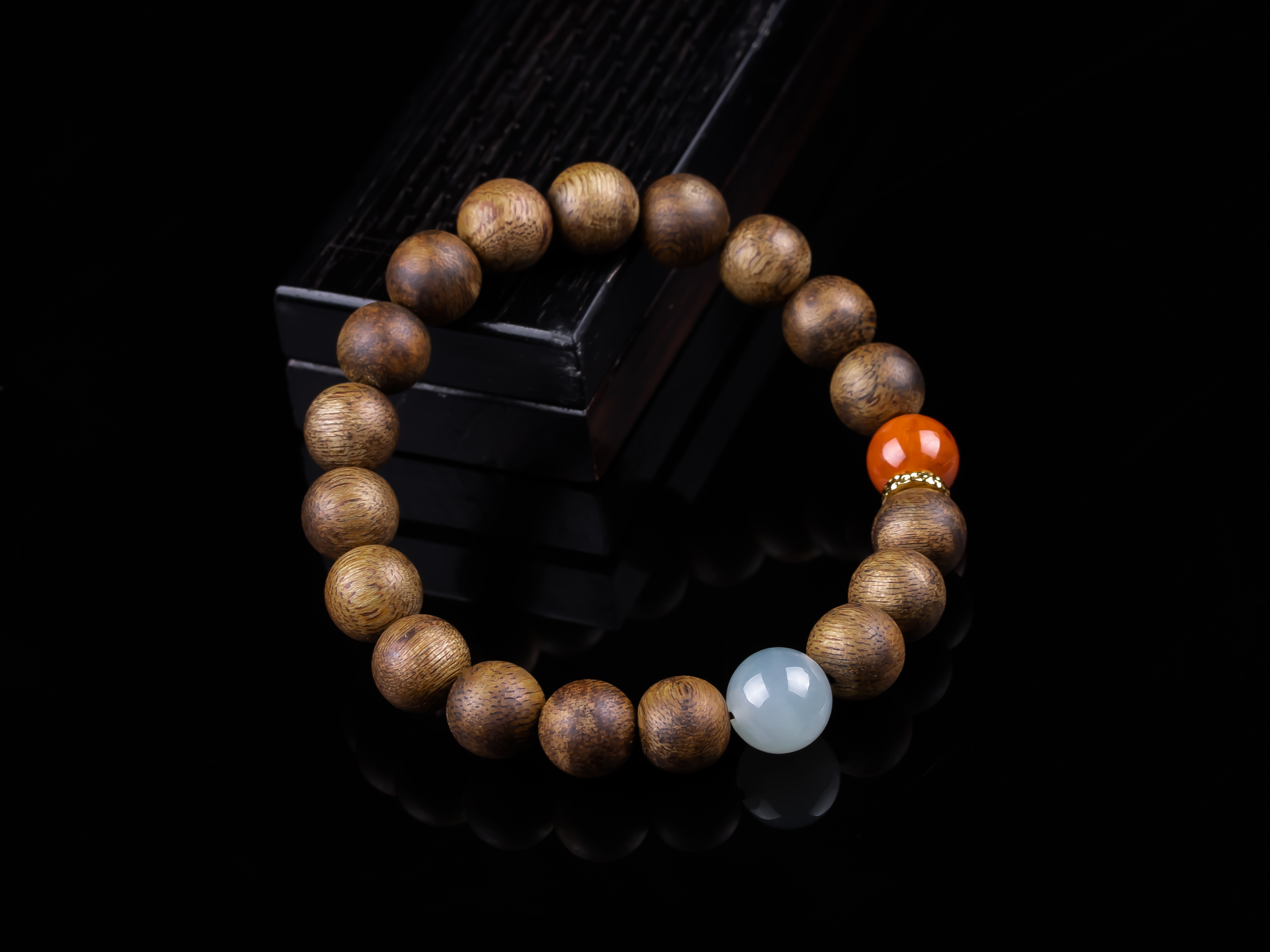 XY0295沉香+翡翠南红单圈手串.银,天然沉香约9.4mm,原色原味,香味自然清甜,一颗冰底翡翠、一颗满色肉南红,款式典雅大气,玉润香清,享受自在时光。