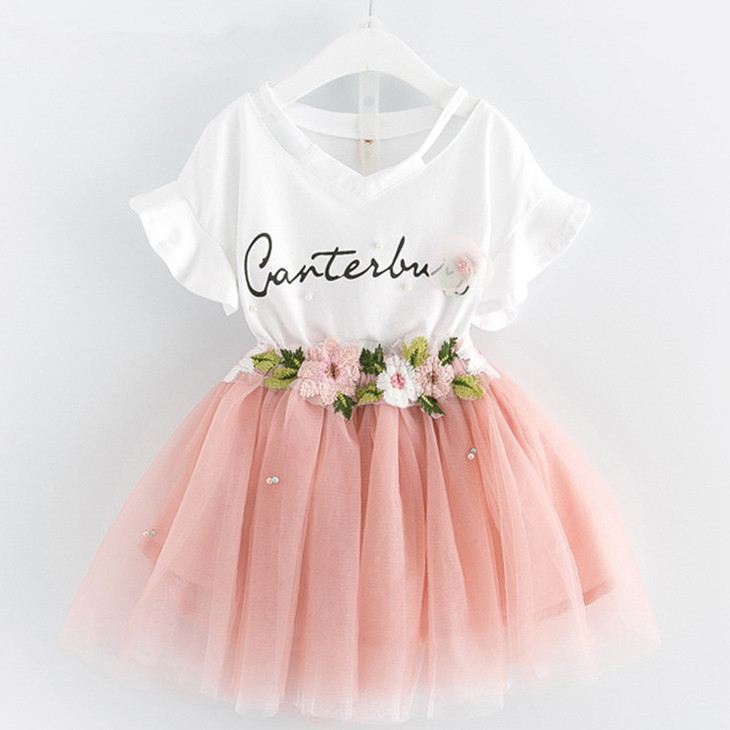 。【女童套装】. 女童字母钉珠飞袖T恤+花朵纱裙套装