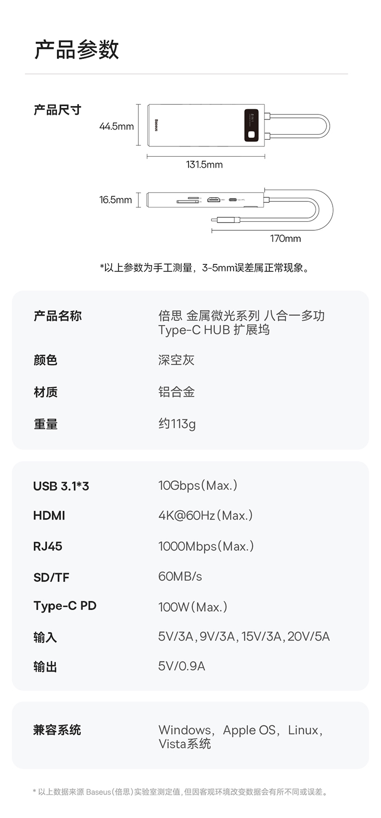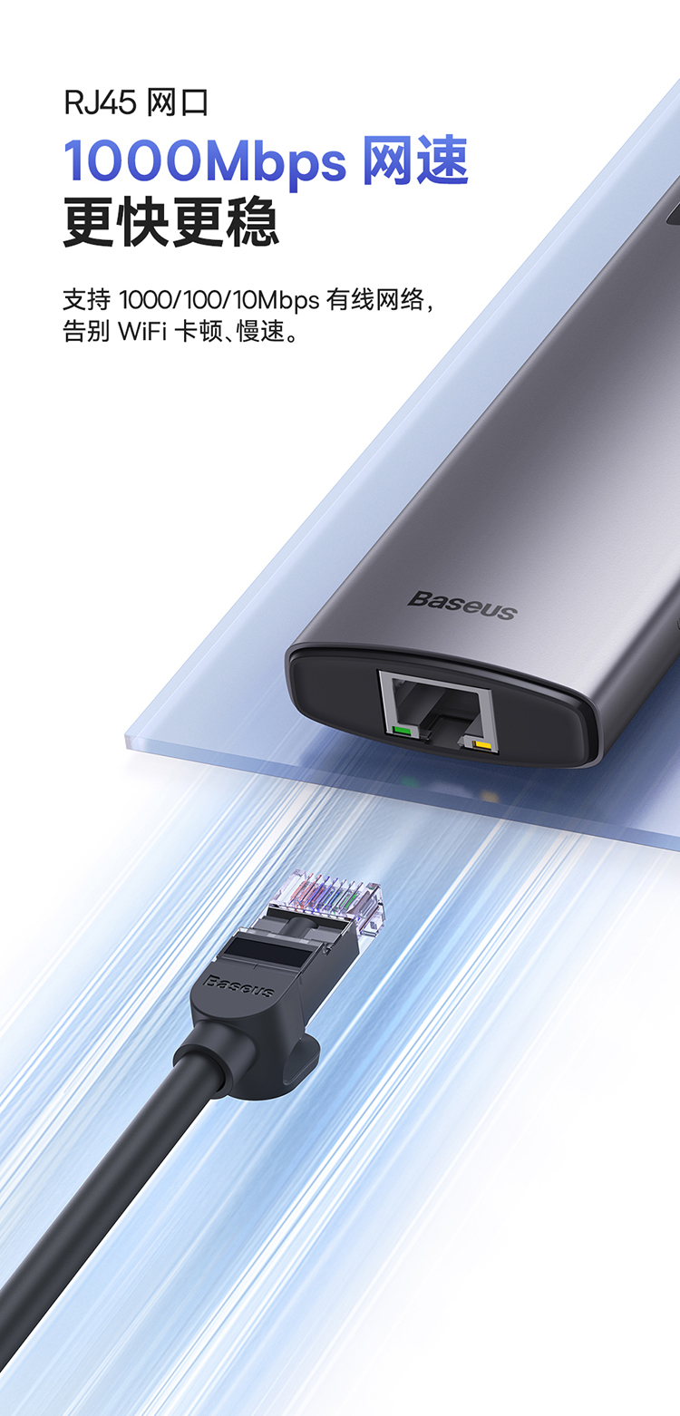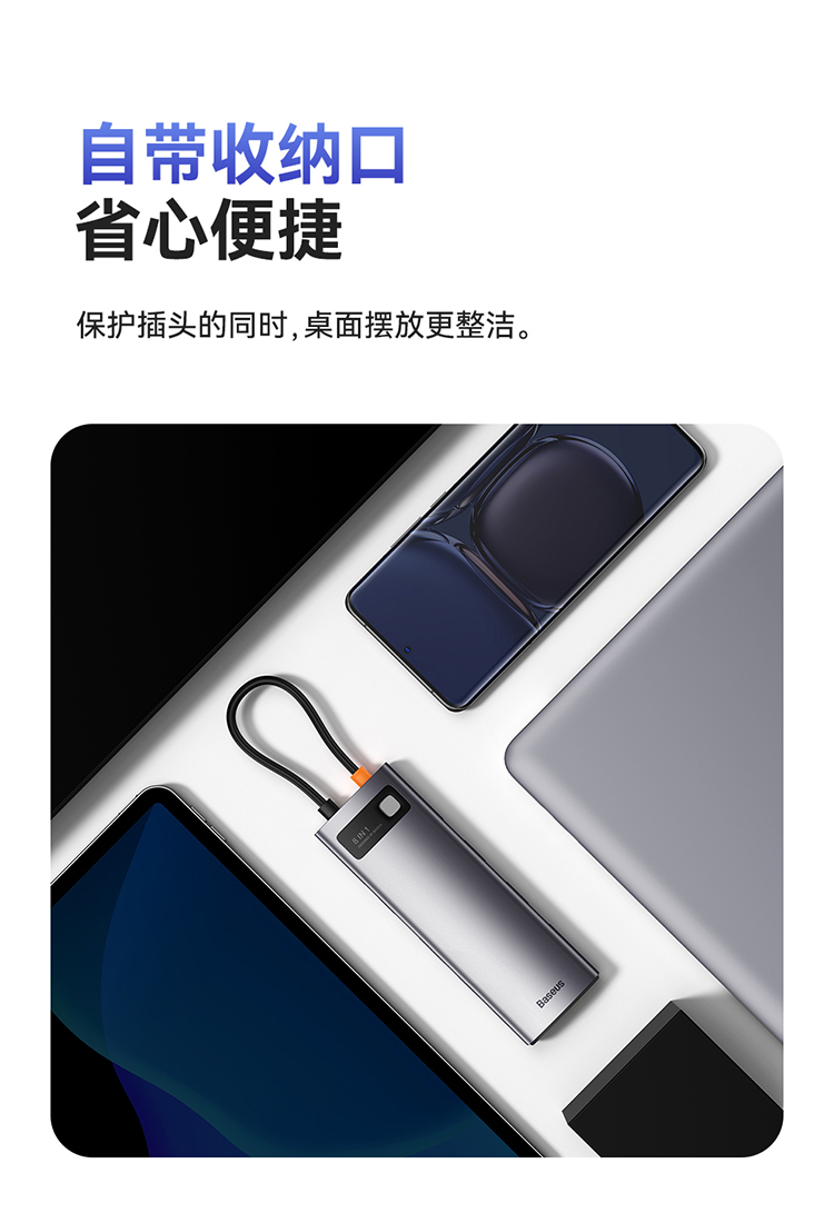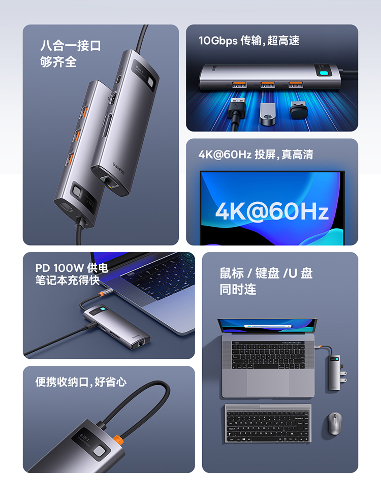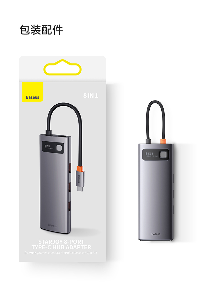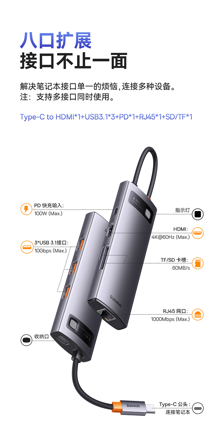 倍思 金属微光系列 八合一多功能Type-C HUB 扩展坞 深空灰(Type-C to HDMI4K@60Hz*1+USB3.1*3+PD*1+RJ45*1+SD/TF*1)