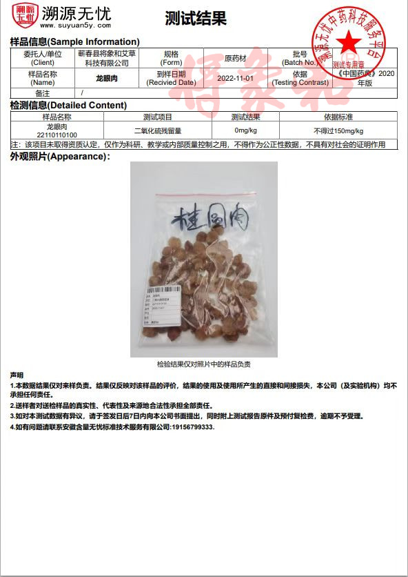 我们的桂圆(龙眼肉)按照国家药典标准检测:二氧化硫残留物为:0